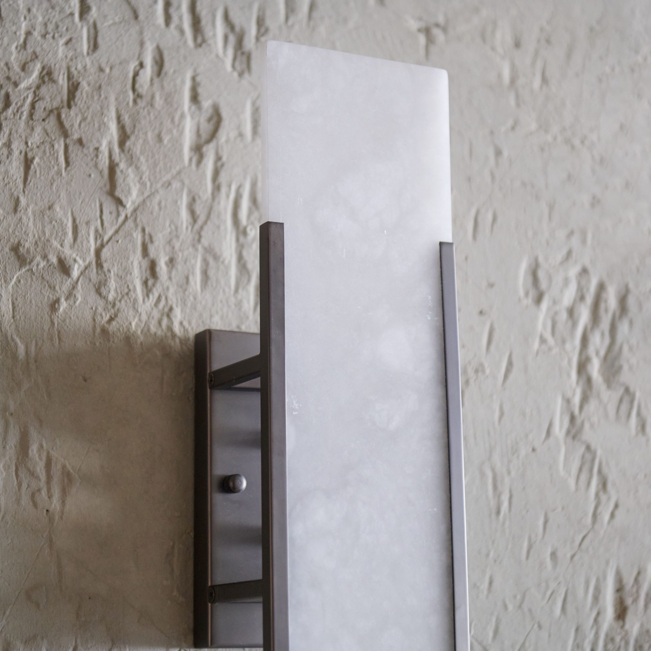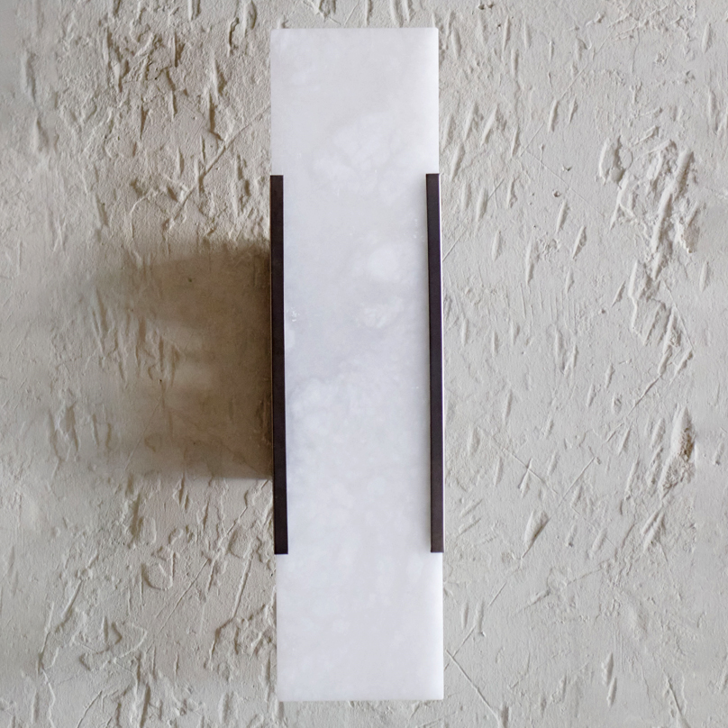 Aplique de bronce y alabastro. De elegante forma rectangular en fino alabastro, va protegido por una sutil envoltura de bronce. Este aplique destaca por su diseño lineal y minimalista y, al tratarse de un material natural, cada pieza difiere en opacidad y veteado.