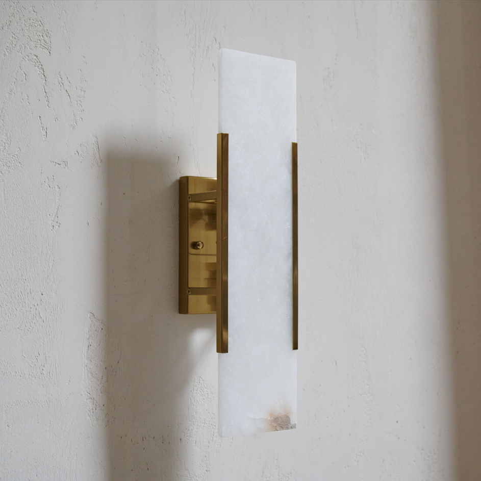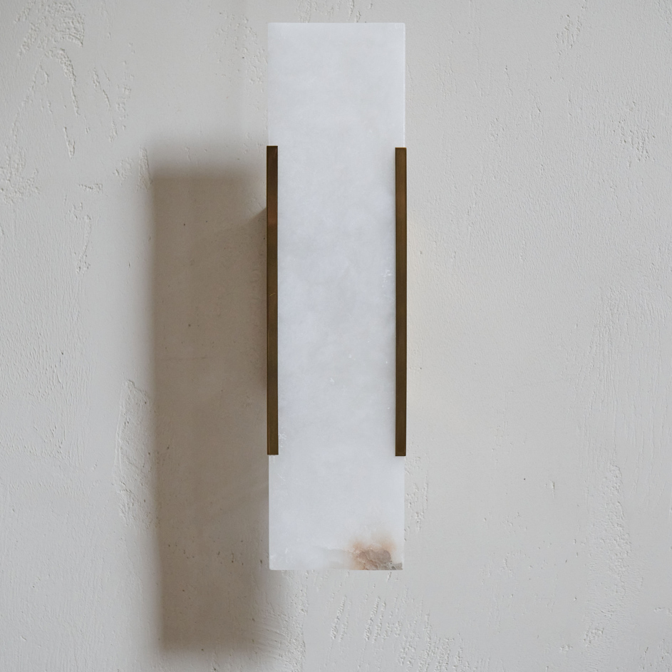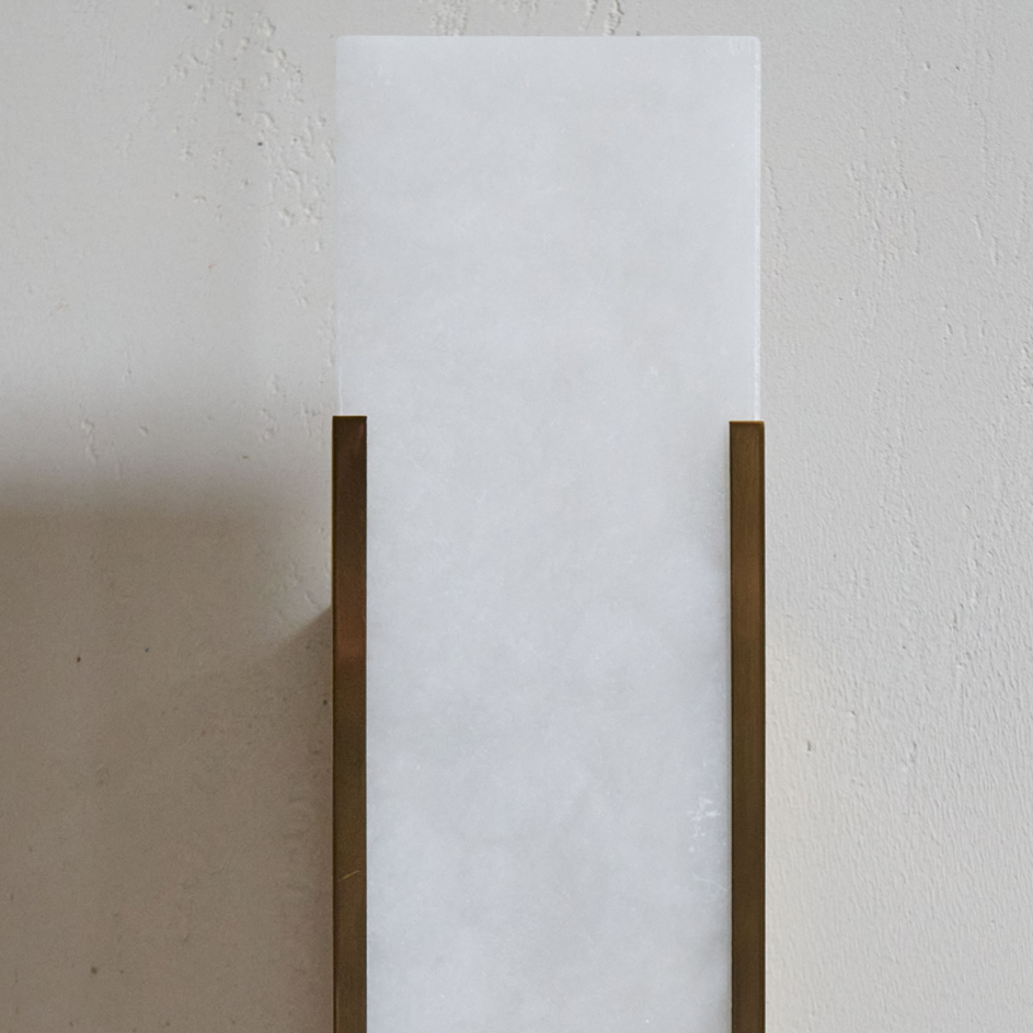 Aplique de pared de alabastro y latón. De elegante forma rectangular en fino alabastro, va protegido por una sutil envoltura de latón. Este aplique destaca por su diseño lineal y minimalista y, al tratarse de un material natural, cada pieza difiere en opacidad y veteado.