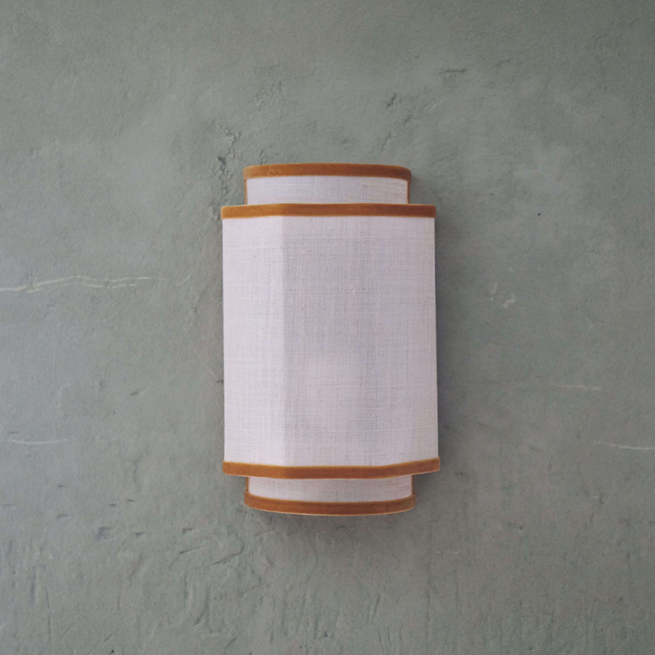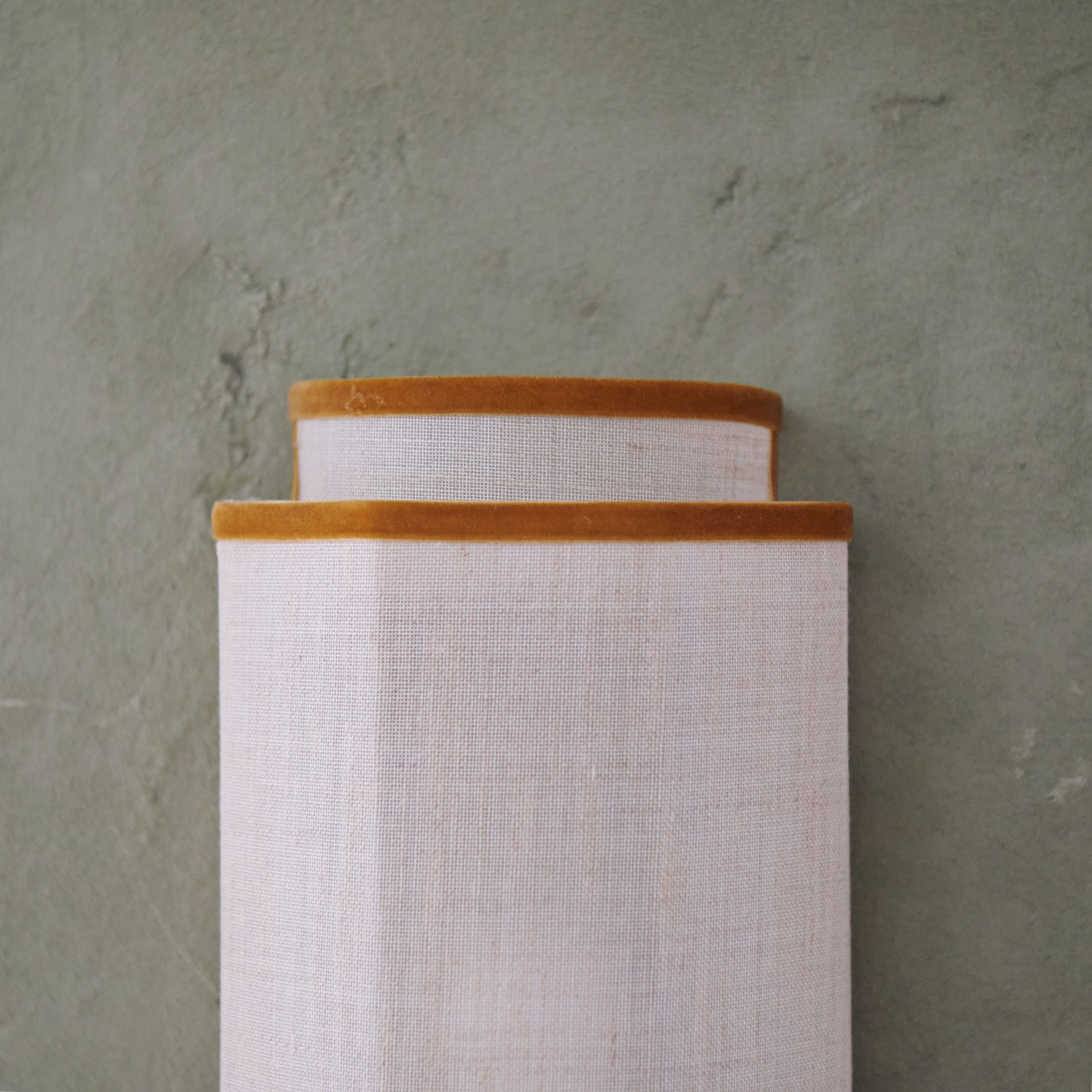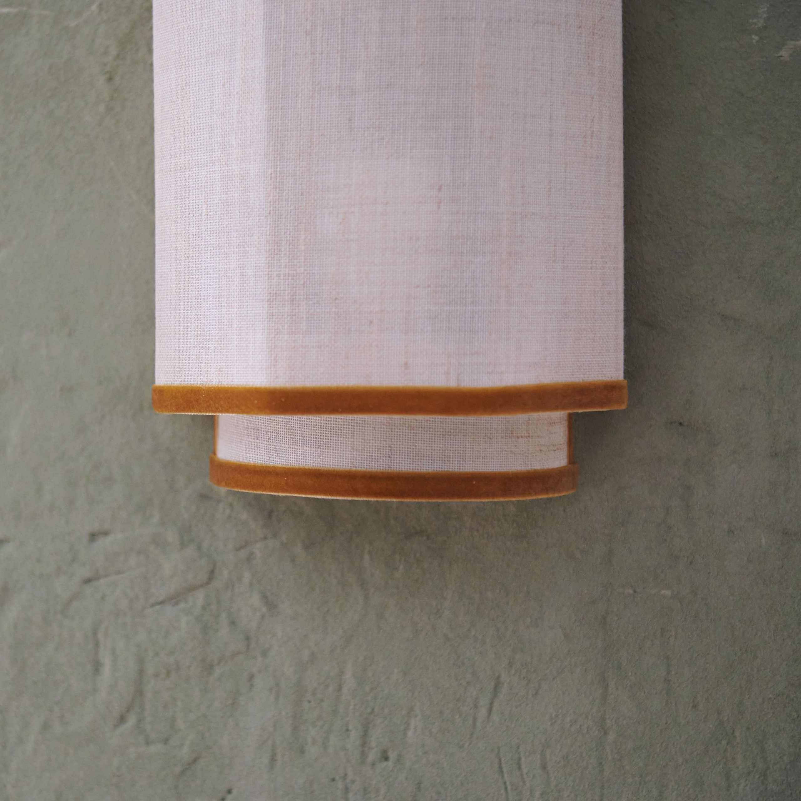 Aplique de pared de lino con ribete mostaza. De diseño propio, se trata de un elegante aplique de lino que proyecta la luz de forma suave y delicada, creando una iluminación cálida y agregando estilo a cualquier espacio. Su bonita diseño geométrico combina con armonía de sus materiales: 100% lino y un precioso ribete de terciopelo color mostaza.