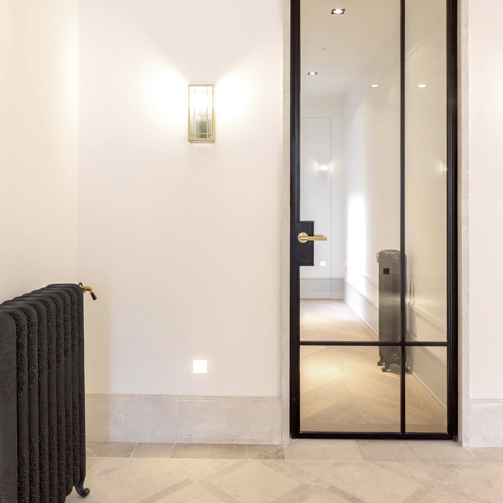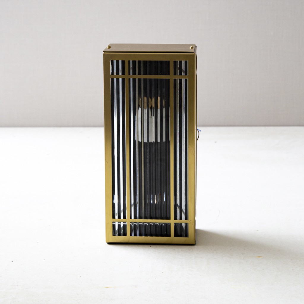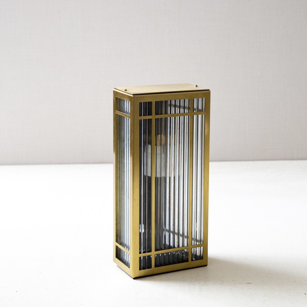 Aplique de pared Oporto, nuestro exclusivo aplique de fabricación propia combina latón cepillado y cristal con un acabado rayado transparente. Este diseño permite que la luz se proyecte de manera cálida y envolvente, creando un ambiente acogedor y sofisticado. Es una pieza única que destaca en cualquier espacio.