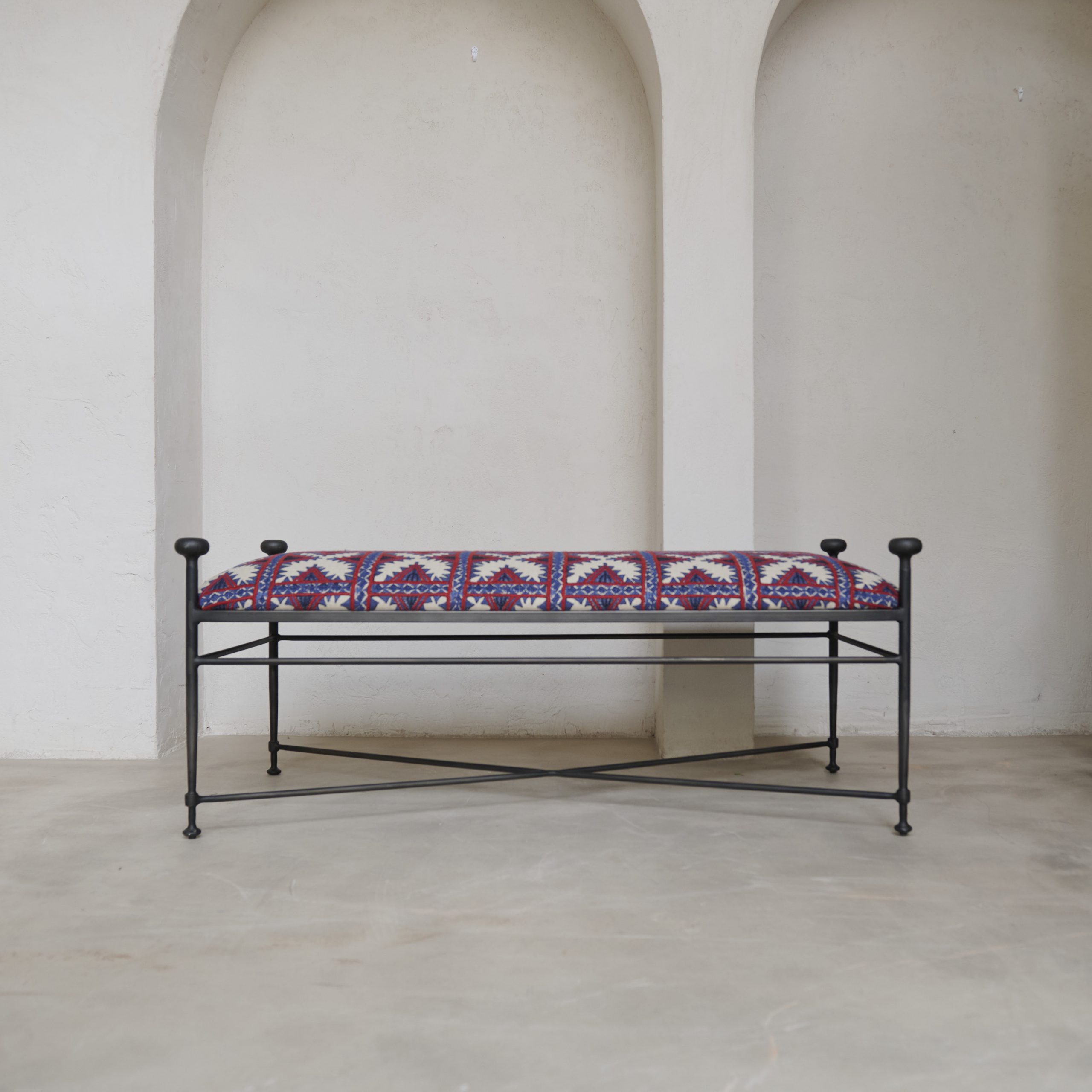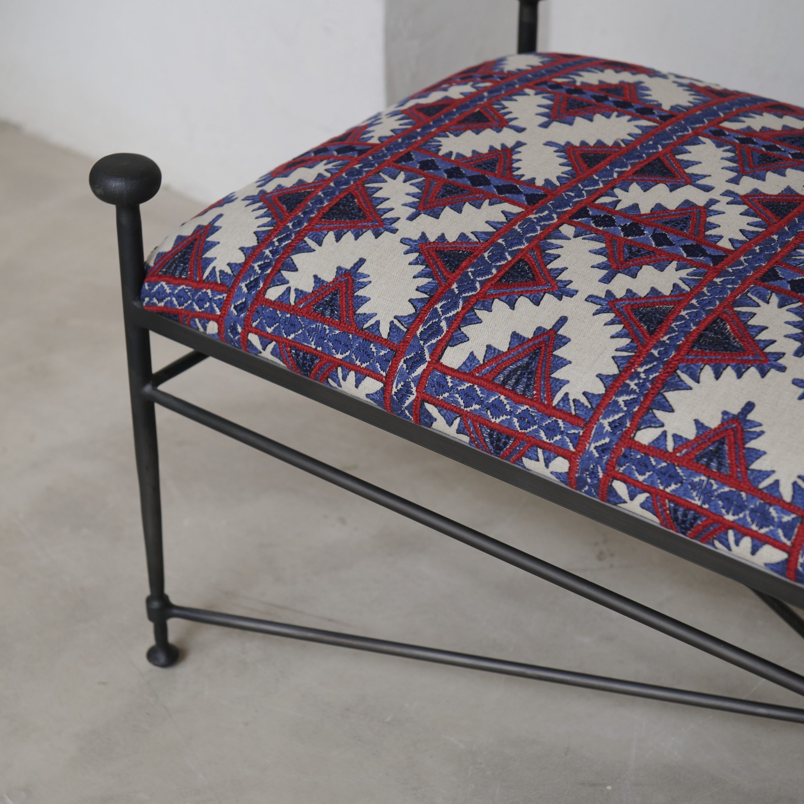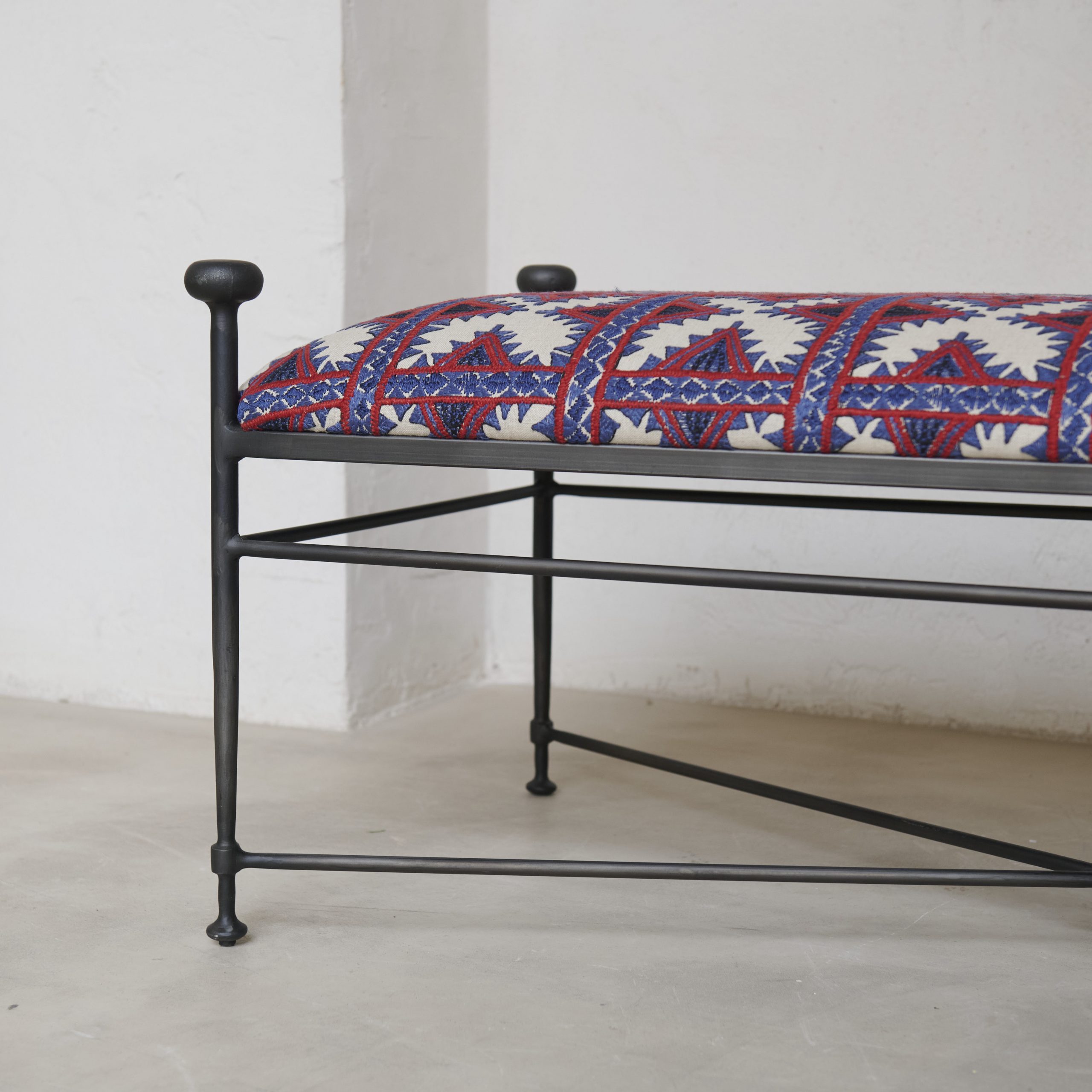Banco de forja «Córdoba». Nueva incorporación en nuestra colección de diseños propios. Fabricado artesanalmente de hierro forjado presenta un elegante y original diseño, y su encanto artesanal que lo hace único. Su estructura de hierro negro, sobria y firme, contrasta con el vibrante tapizado de inspiración étnica, con patrones geométricos en tonos rojos, negros y blancos. El diseño del textil evoca tradición y calidez, mientras que los remates redondeados en las esquinas de la estructura aportan un toque industrial elegante. Ideal para dar carácter a un recibidor, a los pies de una cama o en un rincón especial de la casa.