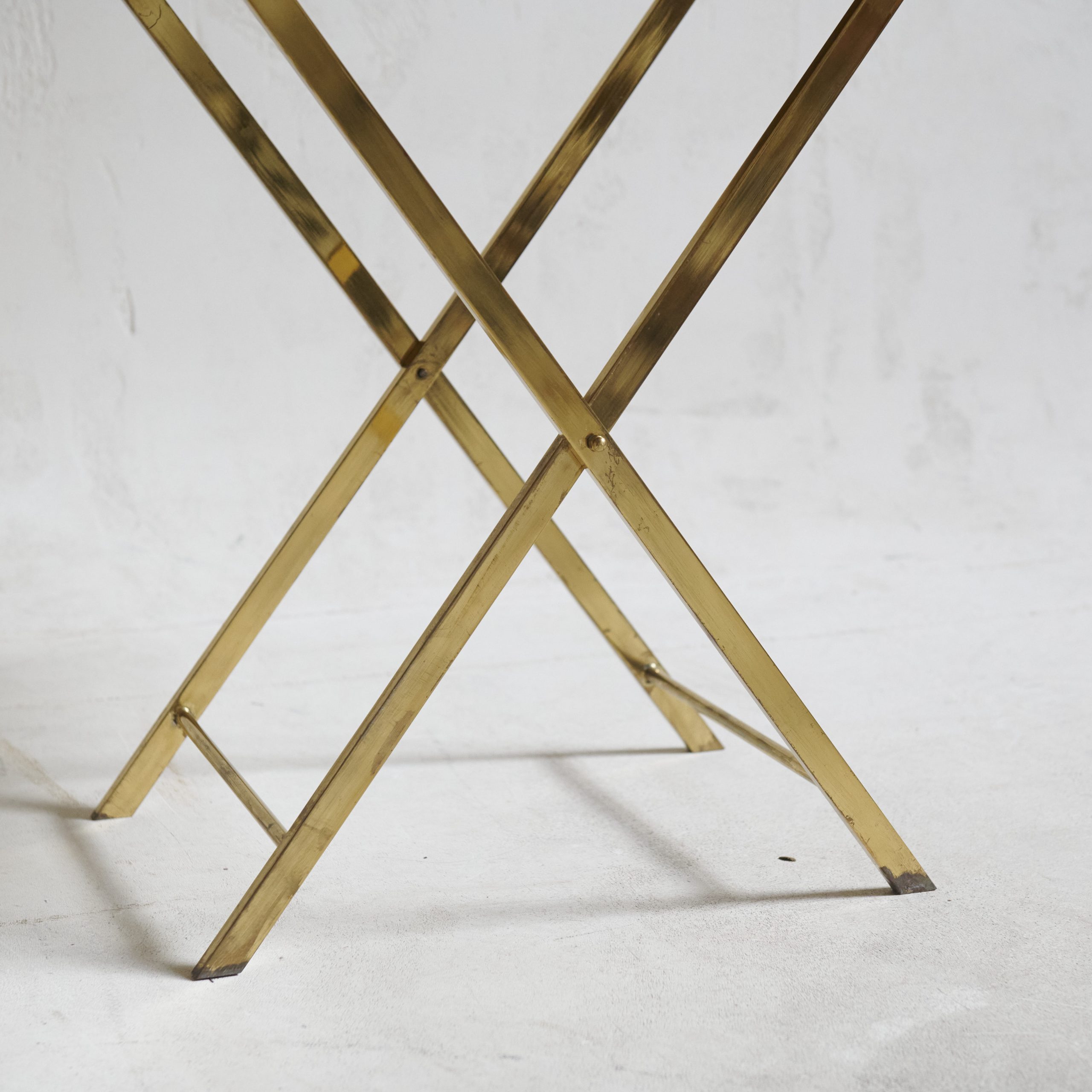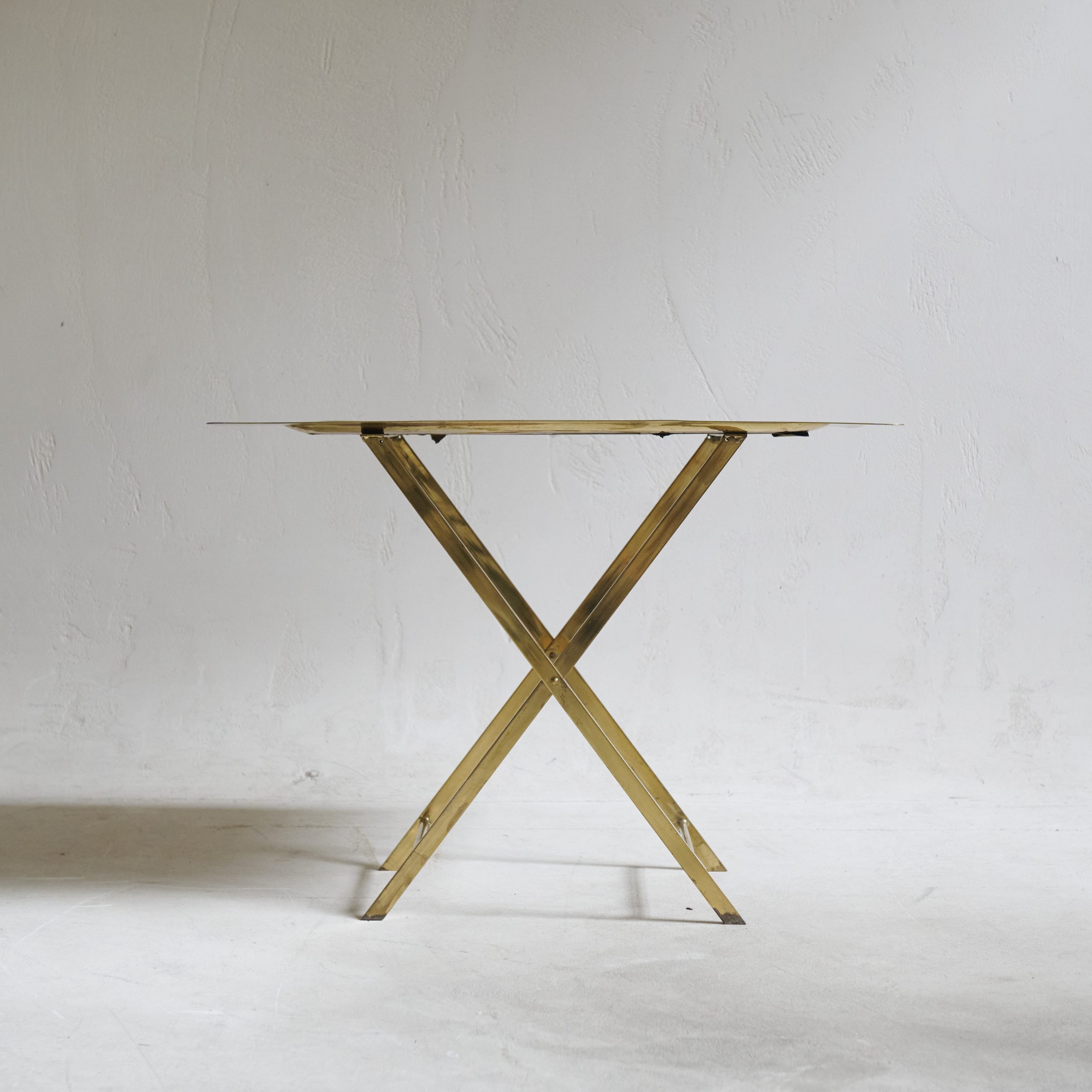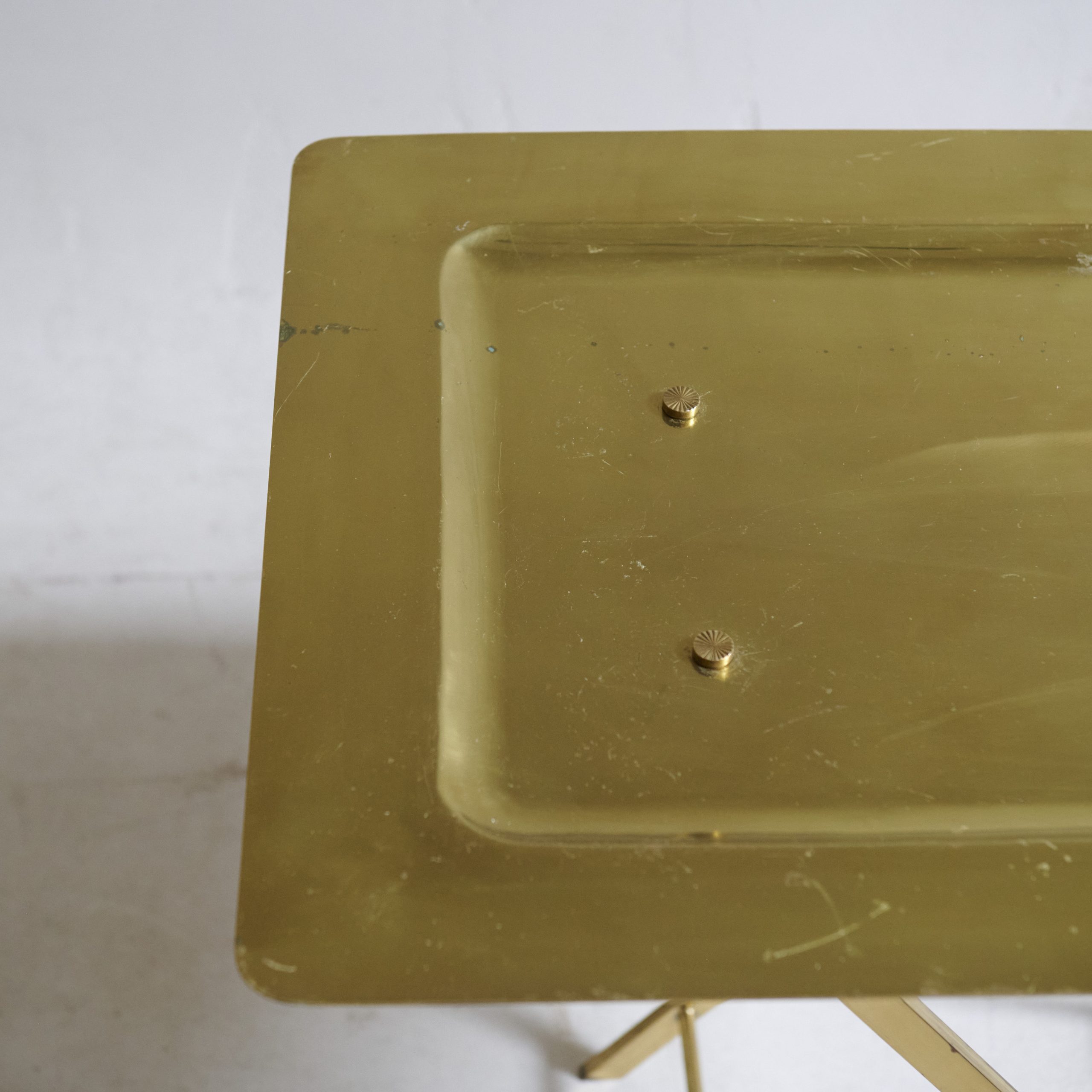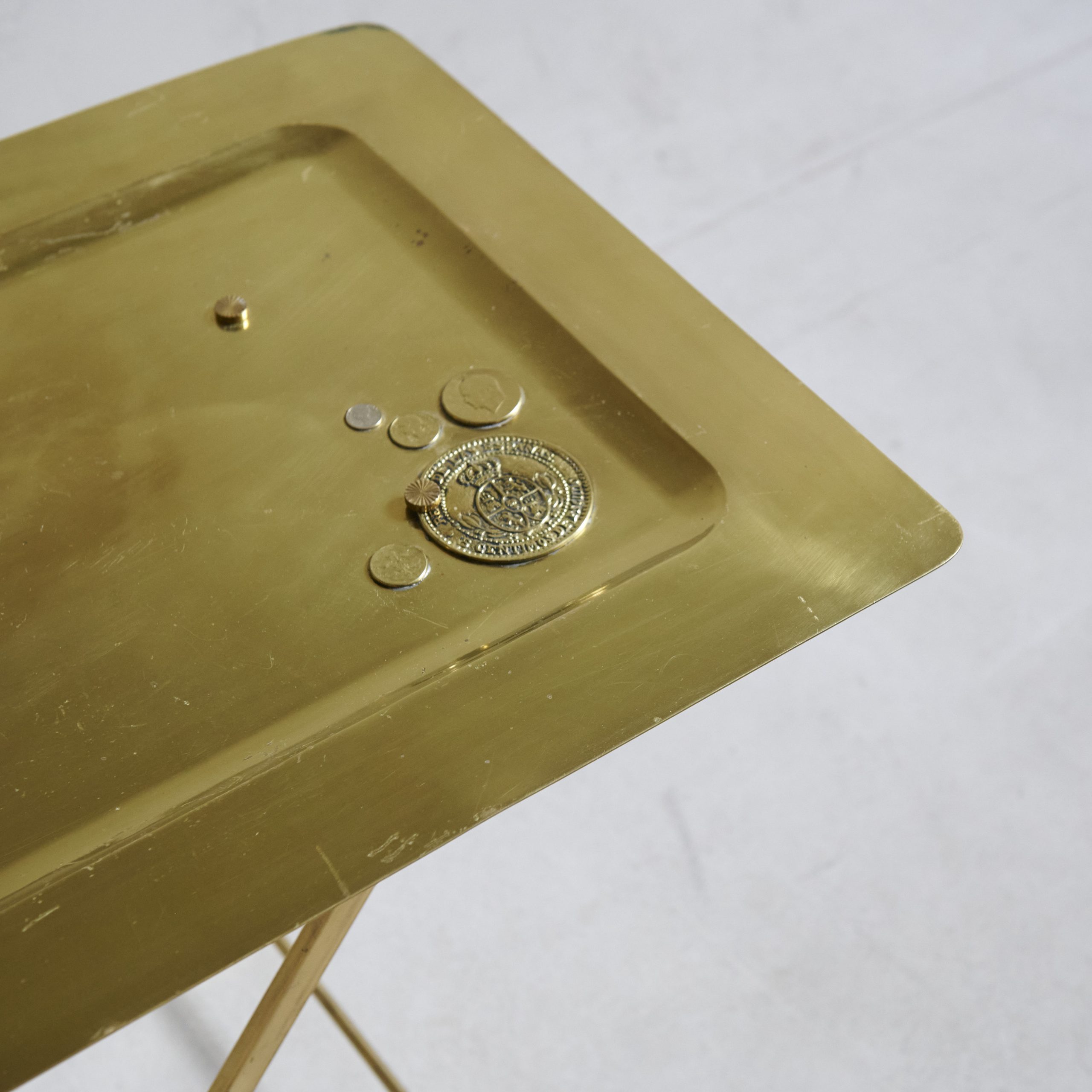 Bandeja con patas de latón y decoración de monedas. Una pieza curiosa esta mesa bandeja totalmente de latón de los años 70, tiene un encanto particular que evoca elegancia atemporal. Su superficie rectangular, suavemente hundida y de acabado brillante, refleja la luz con calidez dorada, creando un efecto visual atractivo y sofisticado. Sobre el tablero, se aprecian antiguas monedas adheridas a la superficie. Las patas cruzadas de madera, en forma de tijera, no solo proporcionan estabilidad, sino que también complementan armoniosamente el diseño.