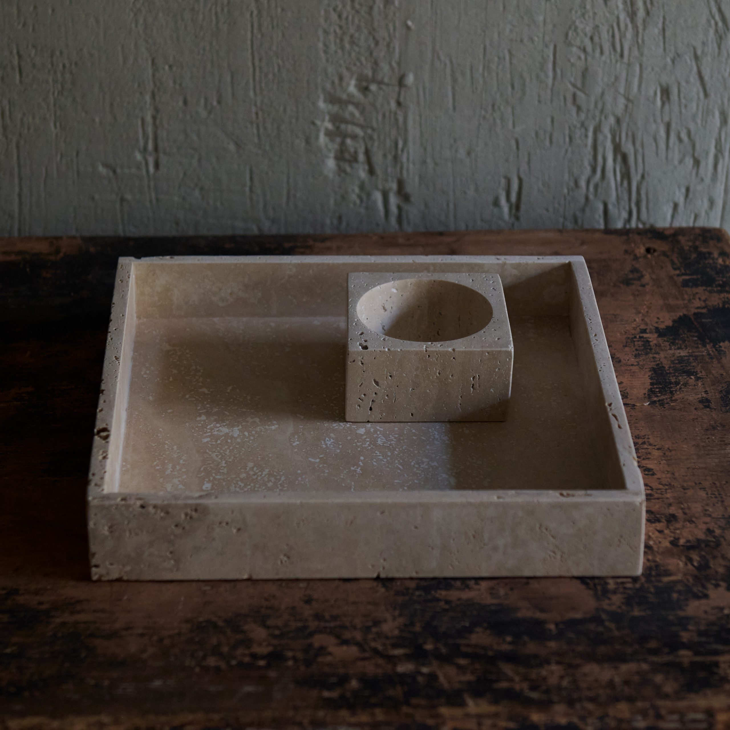 Bandeja cuadrada con bordes de travertino natural. Acabada a mano y de elegante textura, la bandeja puede ser colocada en cualquier estancia de la casa, aportando siempre un toque diferente debido a la belleza y particularidad de su material, que hace que cada pieza sea única y diferente.