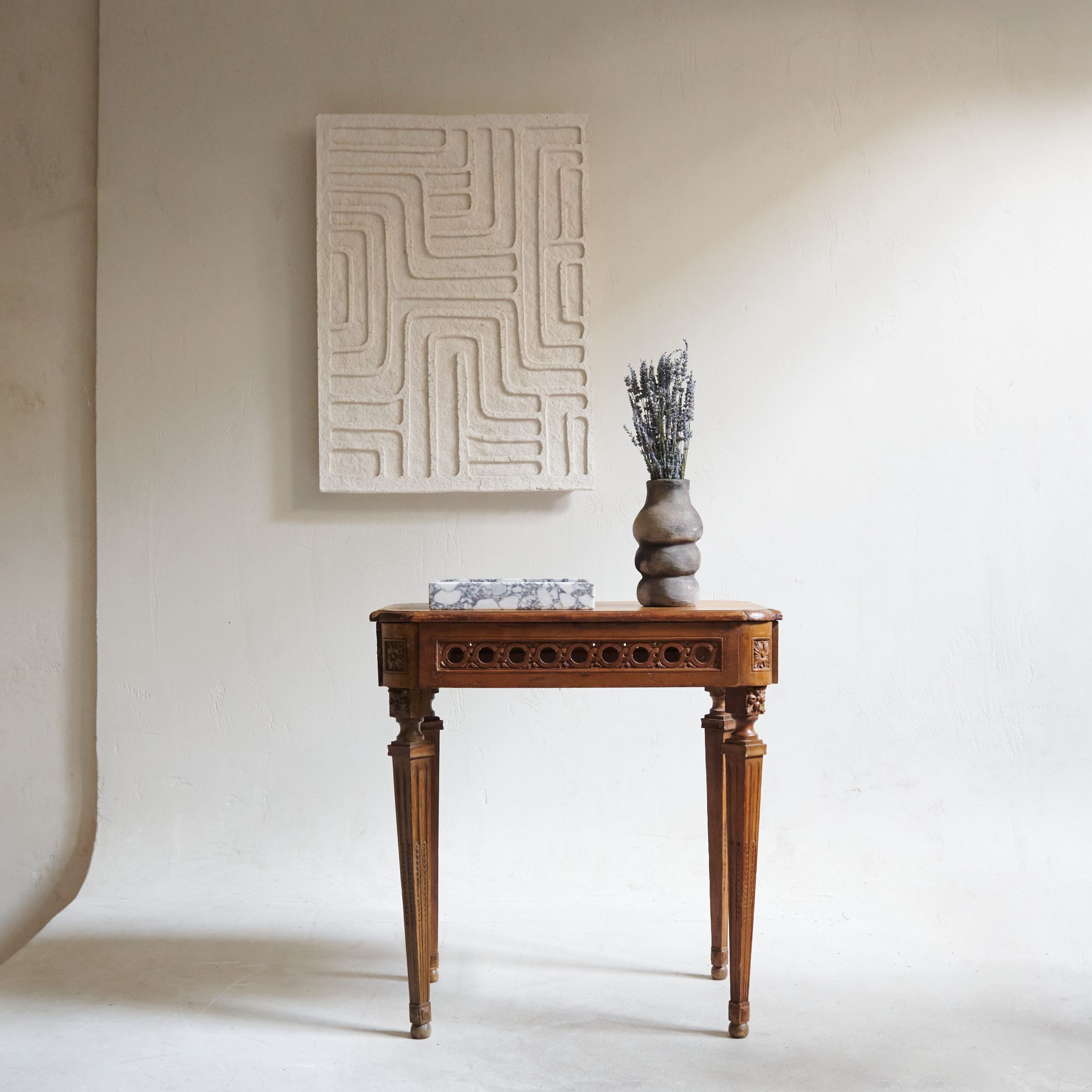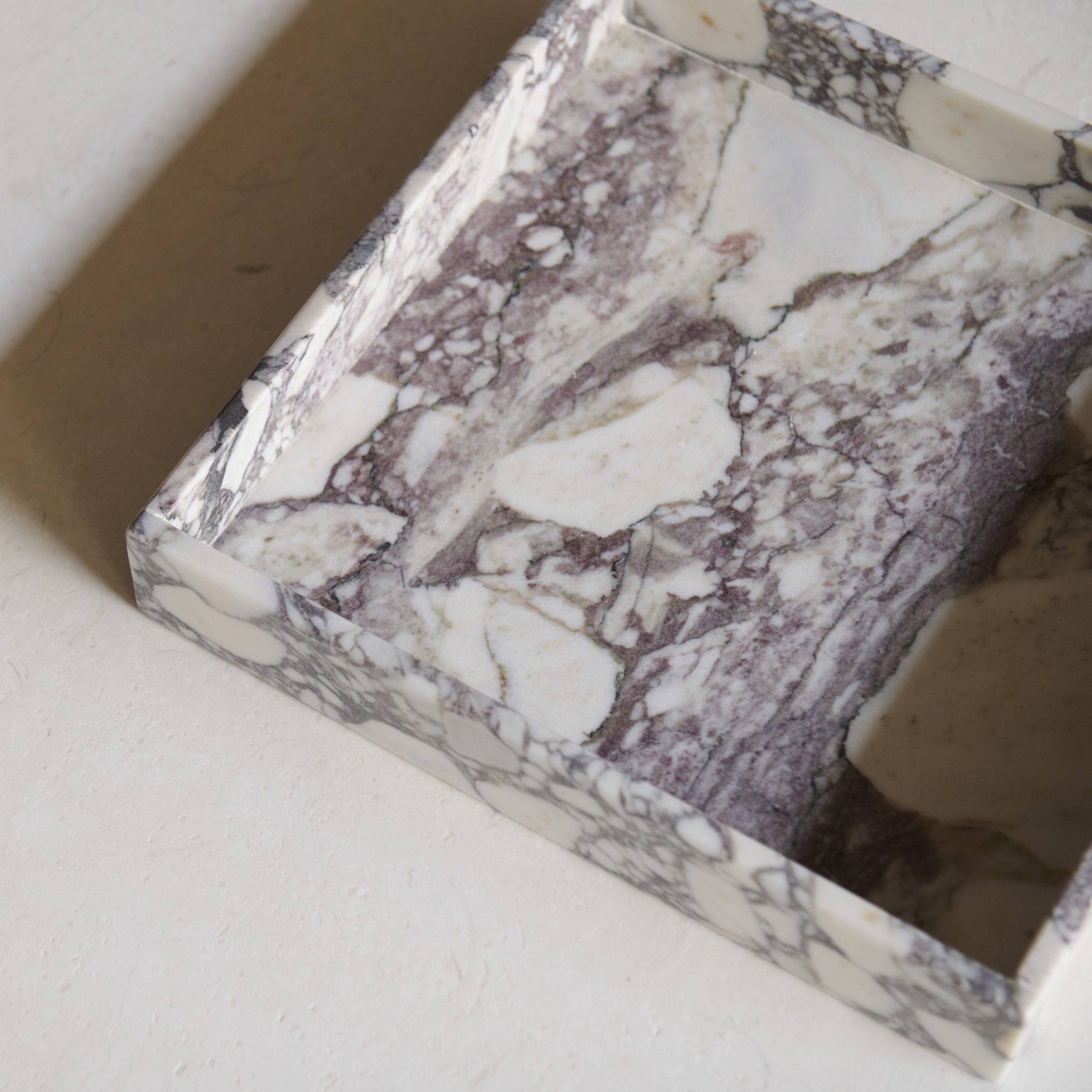 Bandeja cuadrada de mármol Calacatta. Elegante y versátil, su diseño clásico y su original veteado, hacen de ella una pieza singular, con las bellas vetas grises sobre blanco roto, tan característico del Calacatta. Acabado brillo.