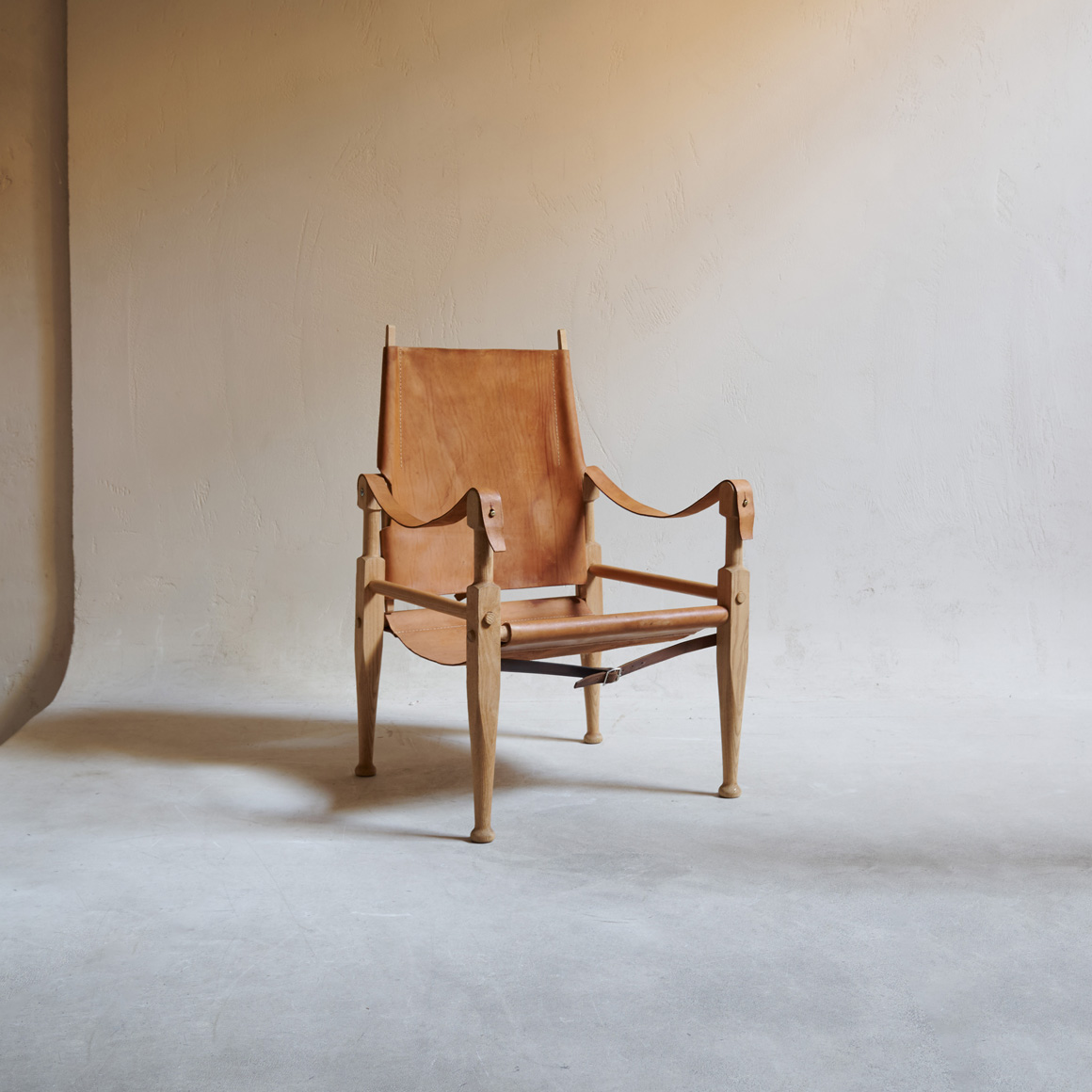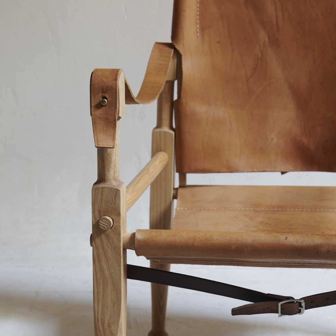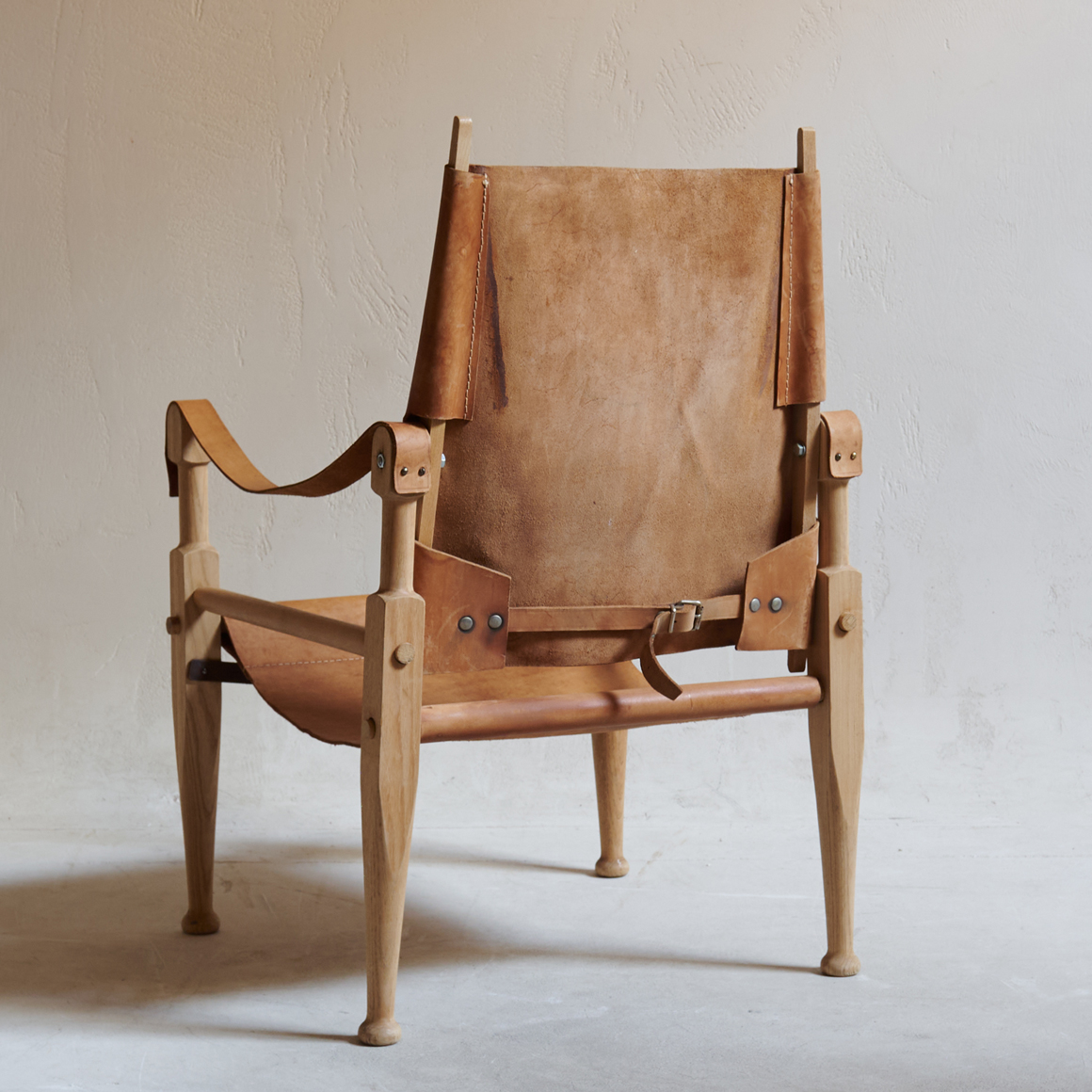 Butaca de piel vintage. Esta butaca vintage tipo safari desprende una elegancia rústica y atemporal. Su estructura de madera clara, con líneas suaves pero bien definidas, evoca la artesanía tradicional y el diseño funcional propio de las expediciones del siglo pasado. El asiento, respaldo y apoyabrazos en cuero natural curtido aportan calidez y textura, muestran las vetas y tonos únicos del material, que con el tiempo han ganado carácter y belleza.