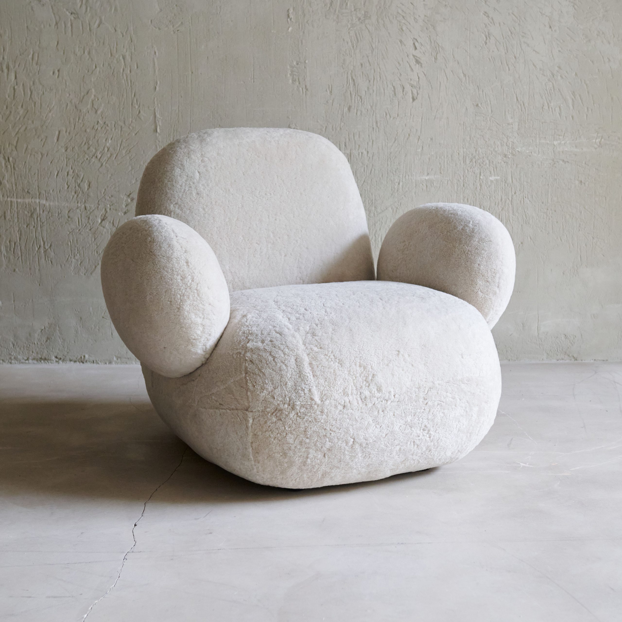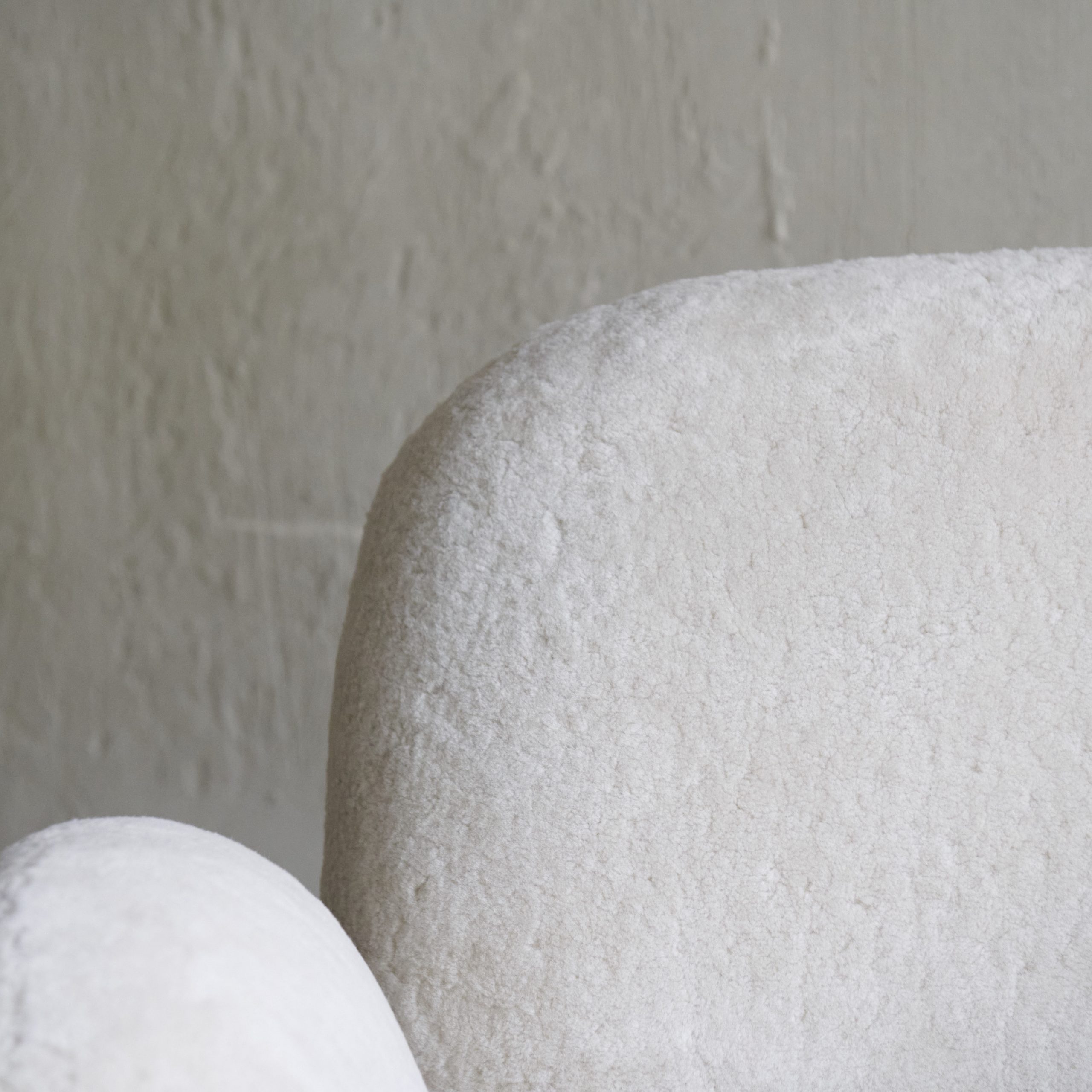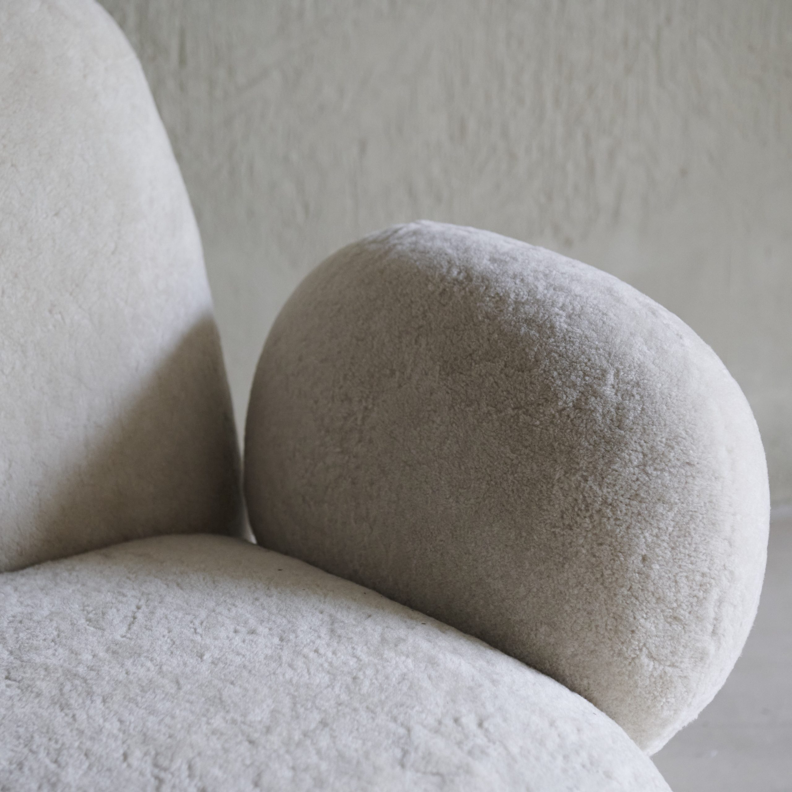 Butaca minimalista estilo años 70. Una pieza moderna y llamativa de clara inspiración futurista de los 70´s que con sus llamativas y sinuosas formas, presenta una tapicería gruesa y suave de lana de oveja. con conexiones perfectas entre los distintos elementos, creando una forma voluminosa y minimalista. Sus reposabrazos ovalados dan un toque original al diseño a la vez que son claves para el confort y el descanso. Una butaca que será el centro de atención de cualquier estancia con su diseño elegante y minimalista de silueta redondeada y envolvente.