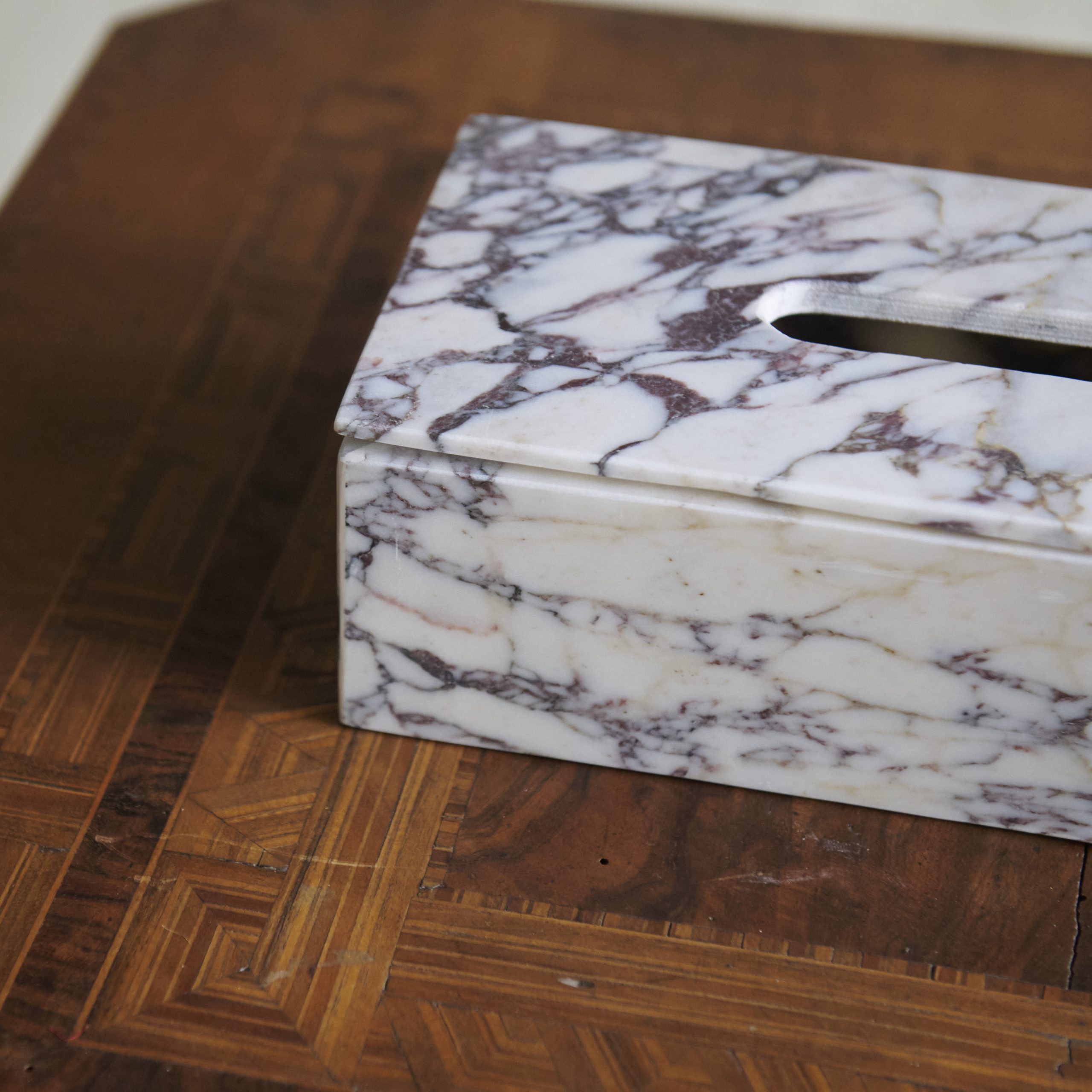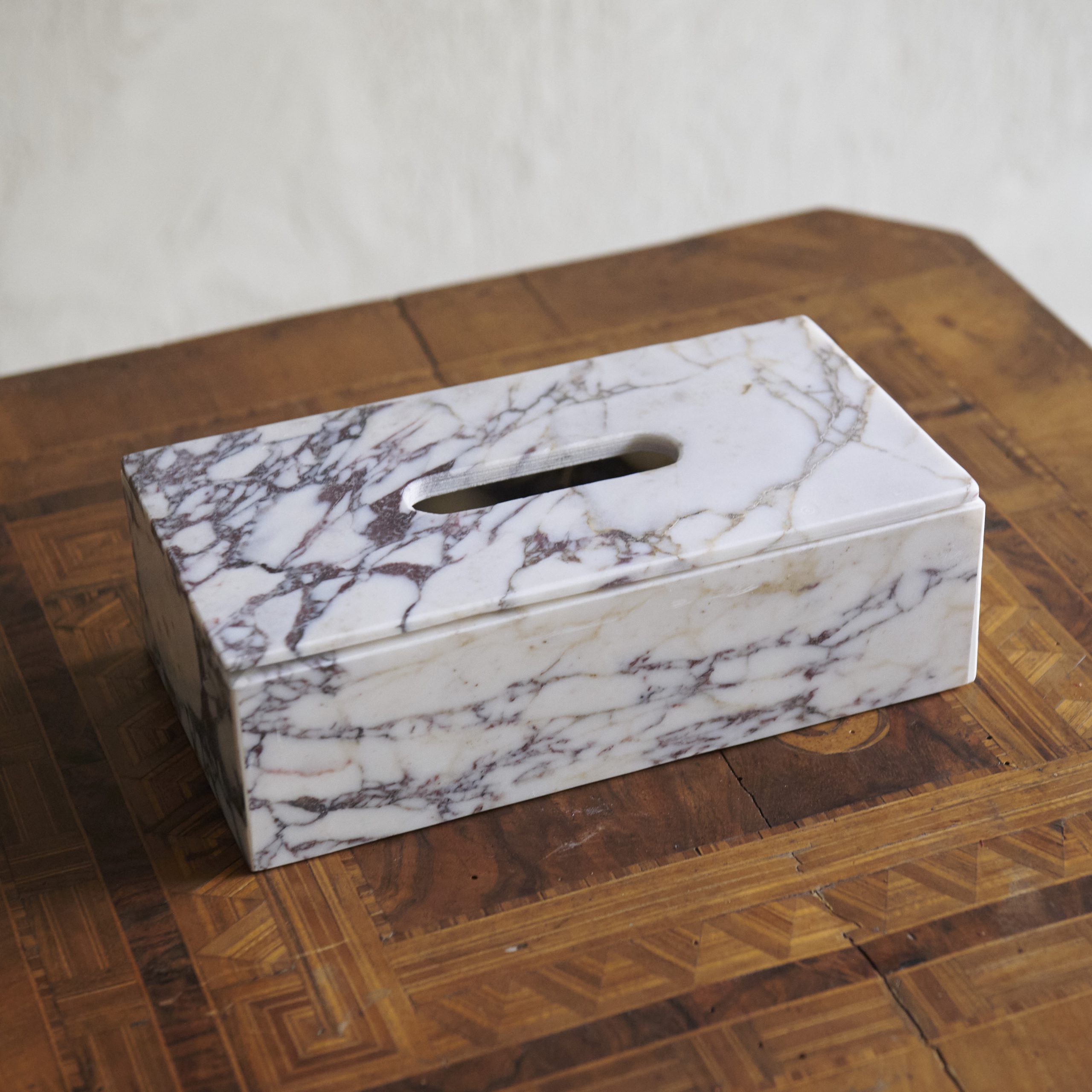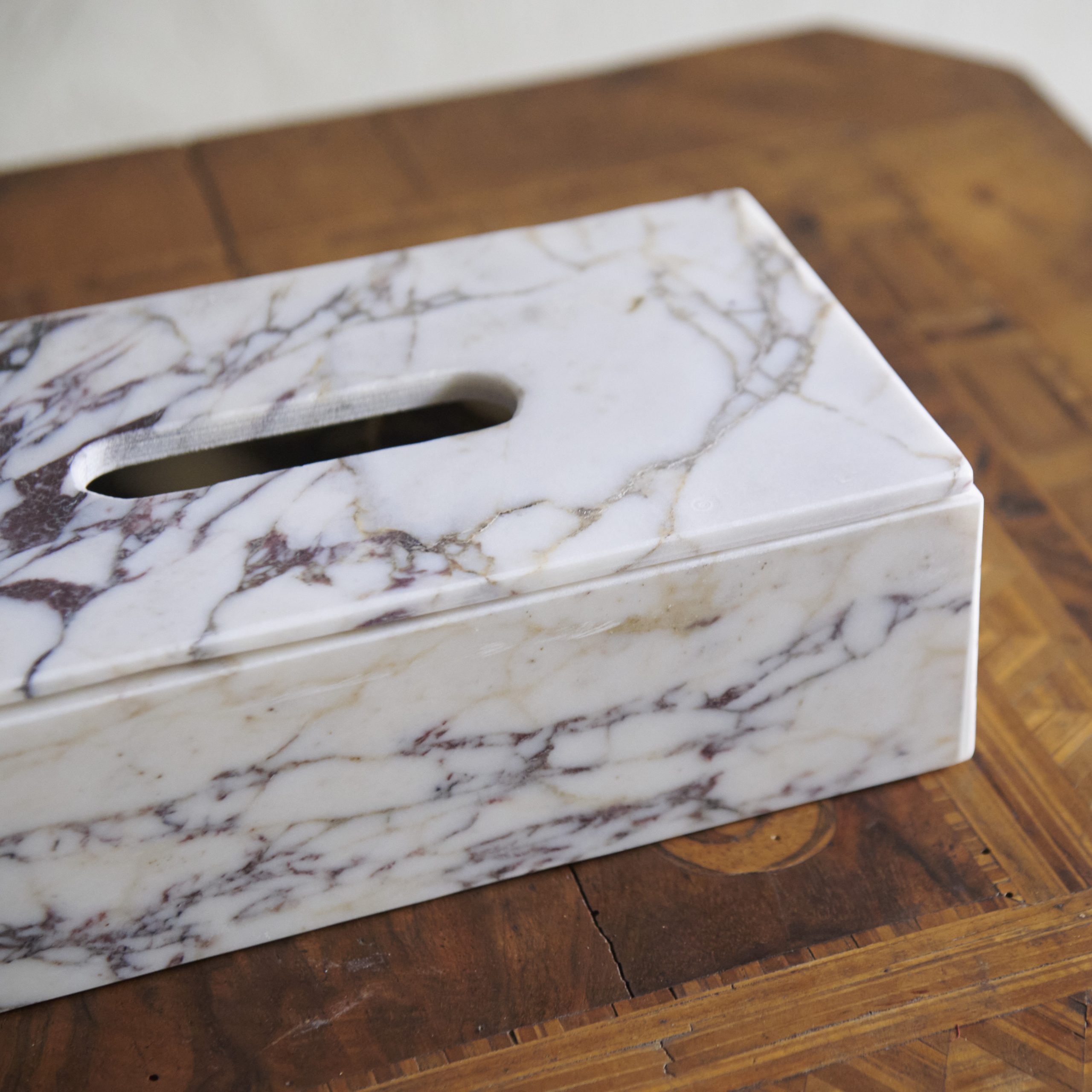 Caja de pañuelos de mármol Calacatta. Un complemento para el hogar tan funcional como decorativo. De dimensiones justas, esta caja de pañuelos encaja en cualquier rincón aportando la elegancia y sofisticación que otorga el mármol Calacatta, con su particular cromatismo en el que el blanco se ve salpicado por finas vetas de color grises a veces apareciendo también pequeñas notas doradas.