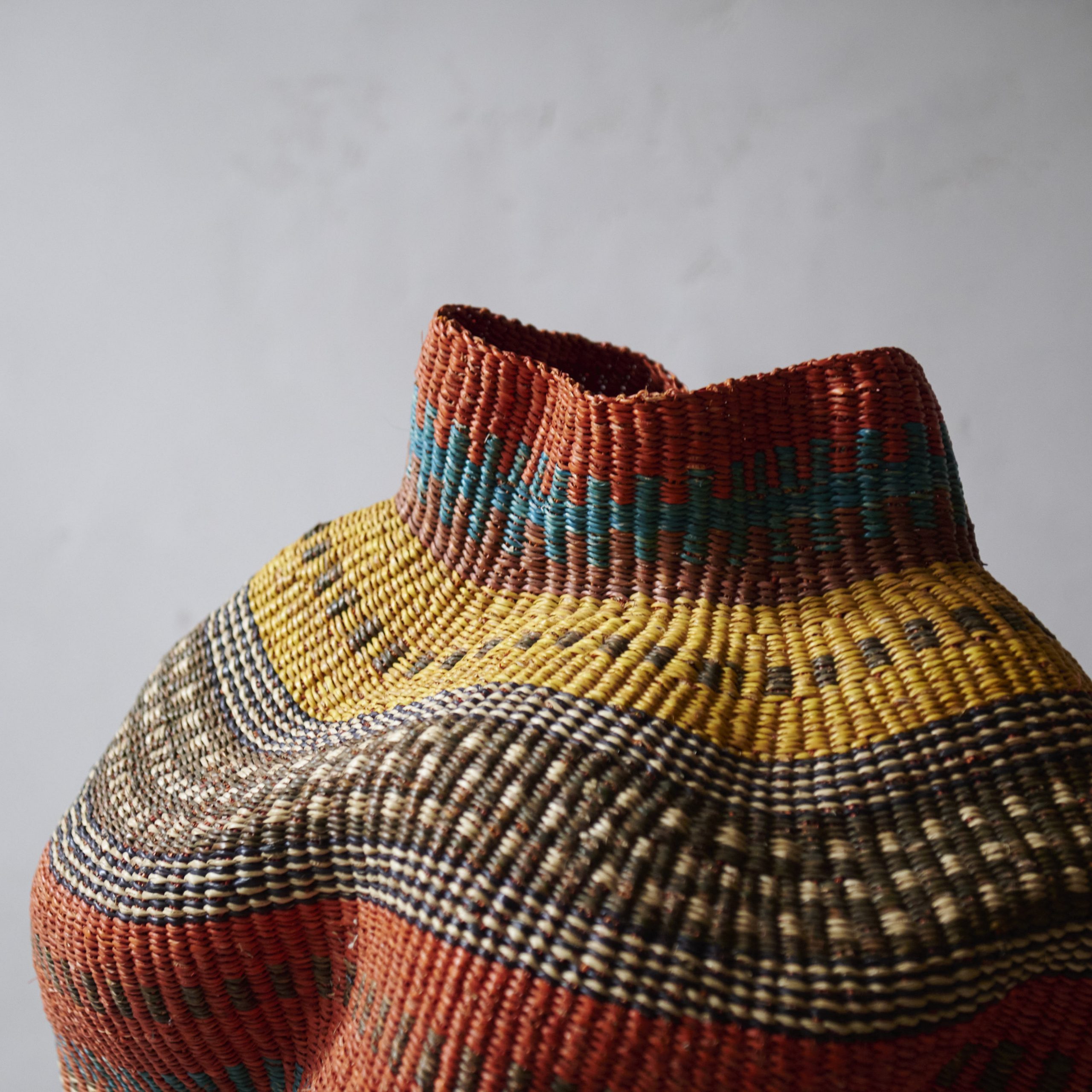 Cesto de mimbre artesanal tintes naturales tonos cálidos L. Tejido artesanalmente en Ghana con hierbas propias de sus llanuras y conocidas como “hierbas elefante”, este cesto es un colorido objeto decorativo étnico y con un toque boho-chic. Tejas, marrones, amarillos y turquesas predominan en perfecta armonía creando una pieza decorativa especial.