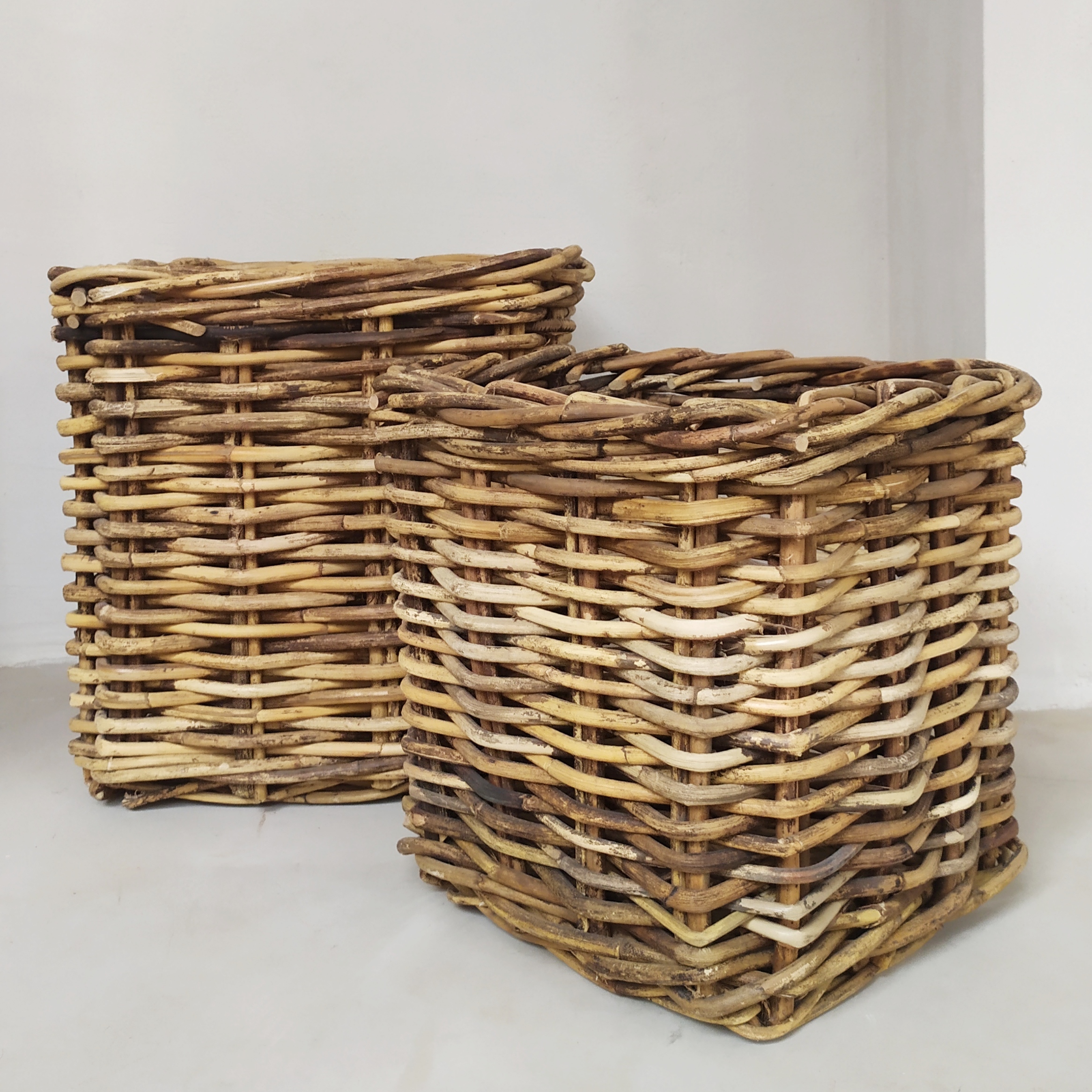 Cesto rectangular de ratán pequeño. Trenzado a mano en ratán, material robusto de gran belleza natural y máxima durabilidad. Sirve para almacenaje y también como macetero y es apto para exteriores.