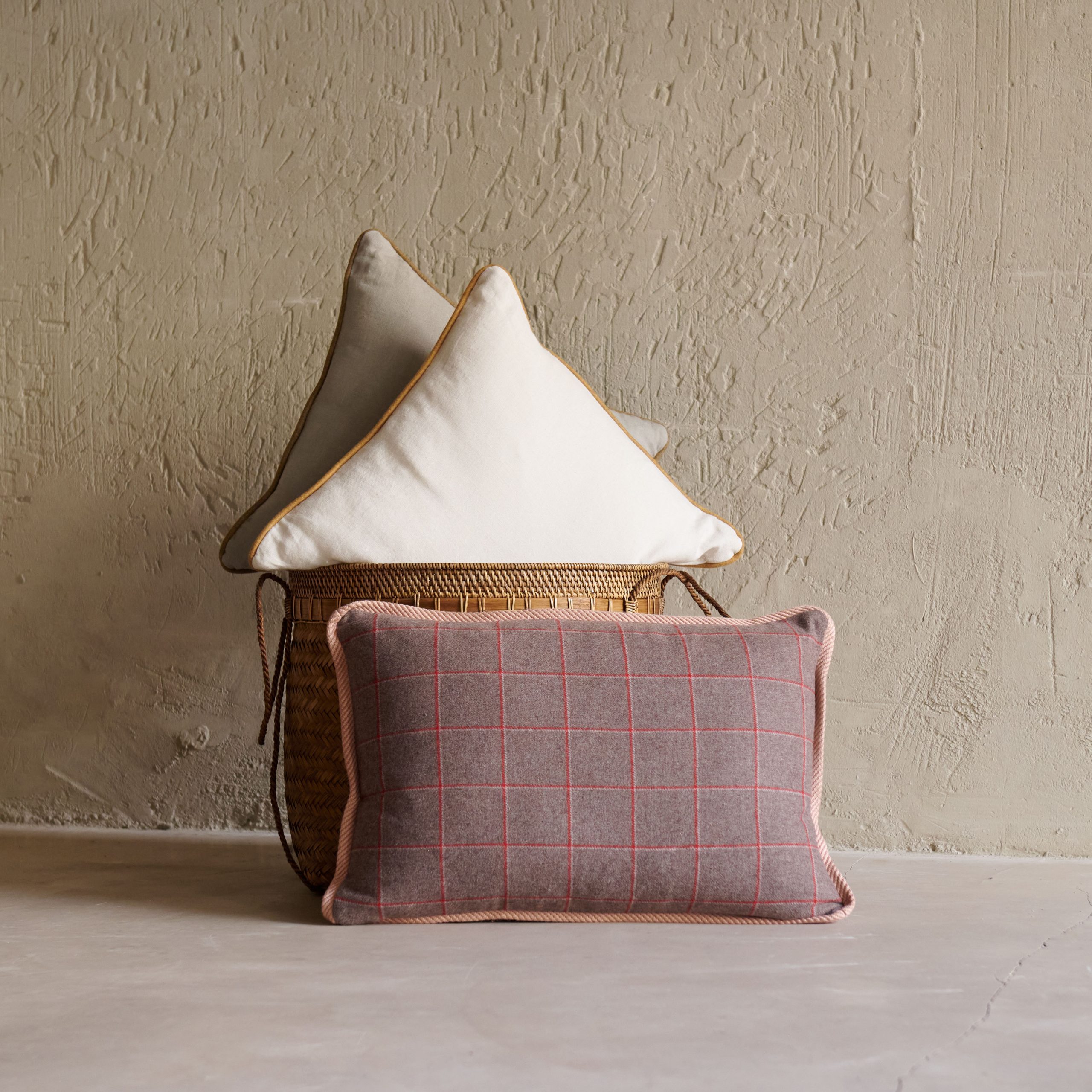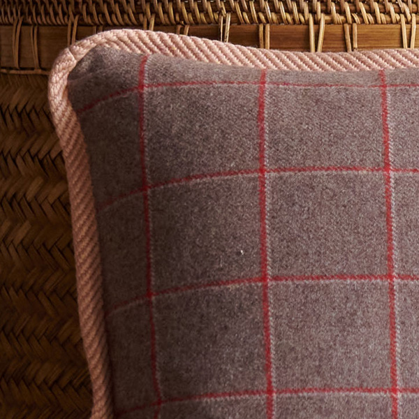 Cojín de cuadros marrón con ribete de pasamanería rosa 60×40 cm. Tejido en lana con un estampado de cuadros finos en tonos tierra y rojos, con un ribete rosa cuidadosamente rematado.