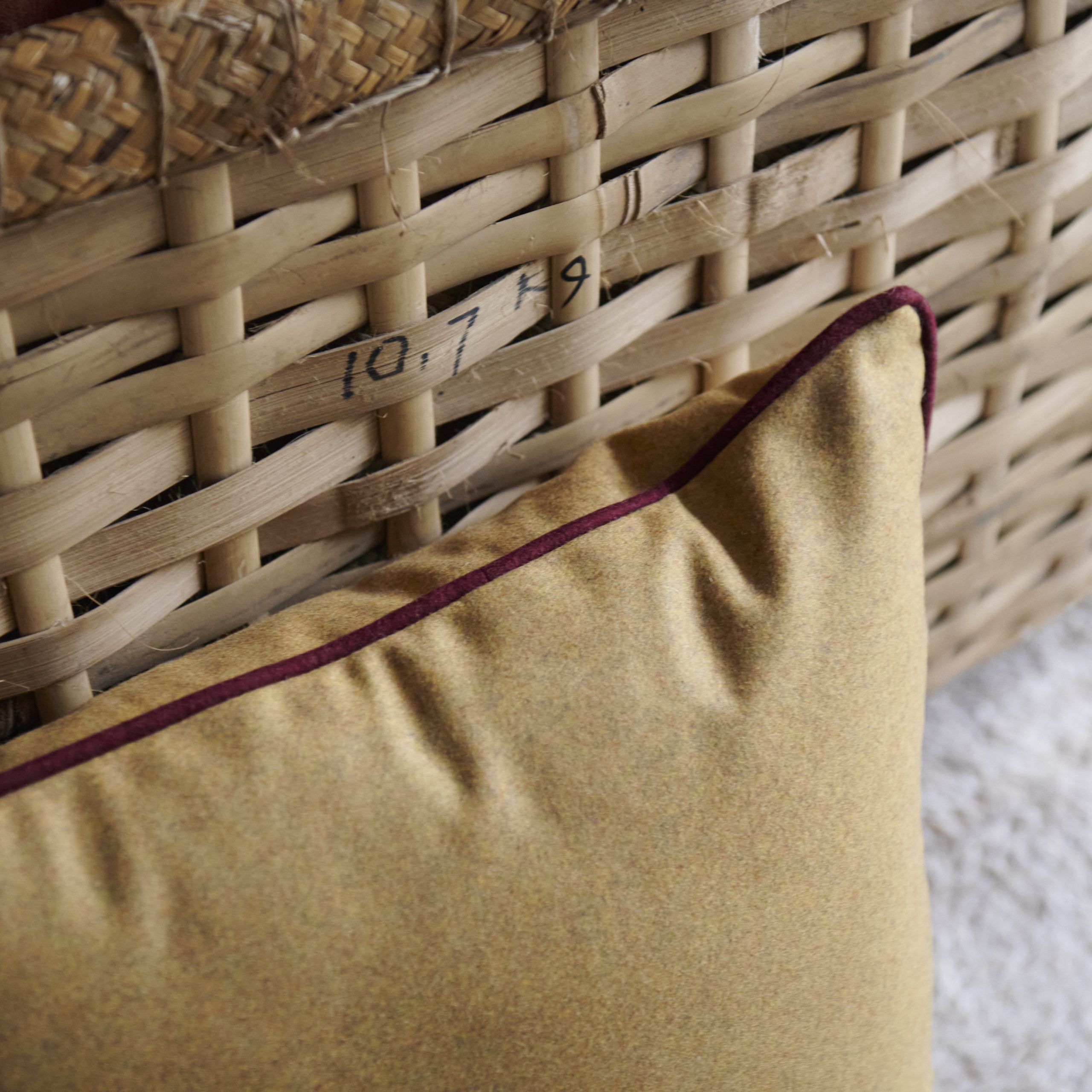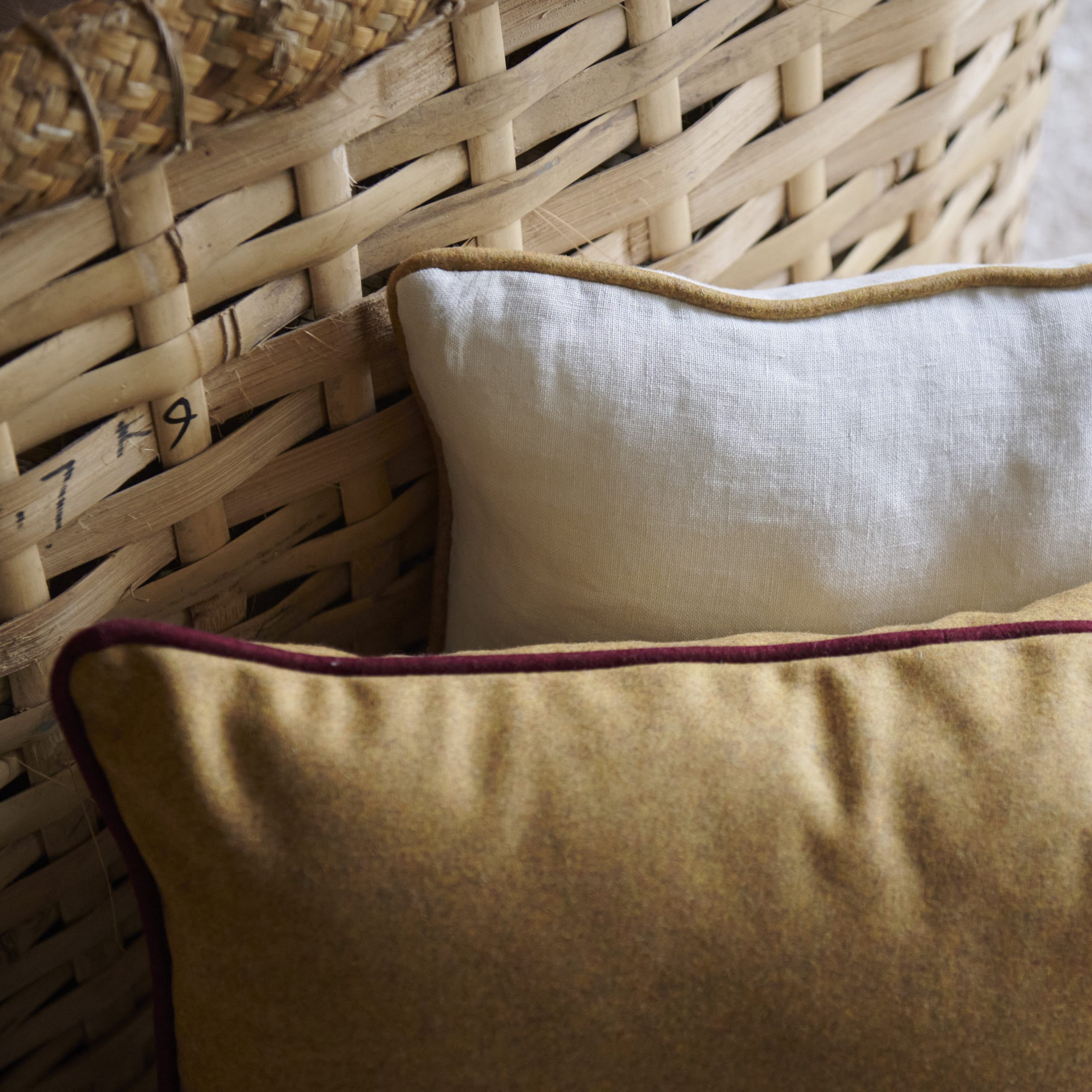 Cojín de lana mostaza con ribete granate. Presenta un diseño elegante y sencillo y su tela de lana virgen tiene una textura suave y cálida, con un tono amarilla mostaza rodeado por un sutil ribete granate que añade un toque de frescura.