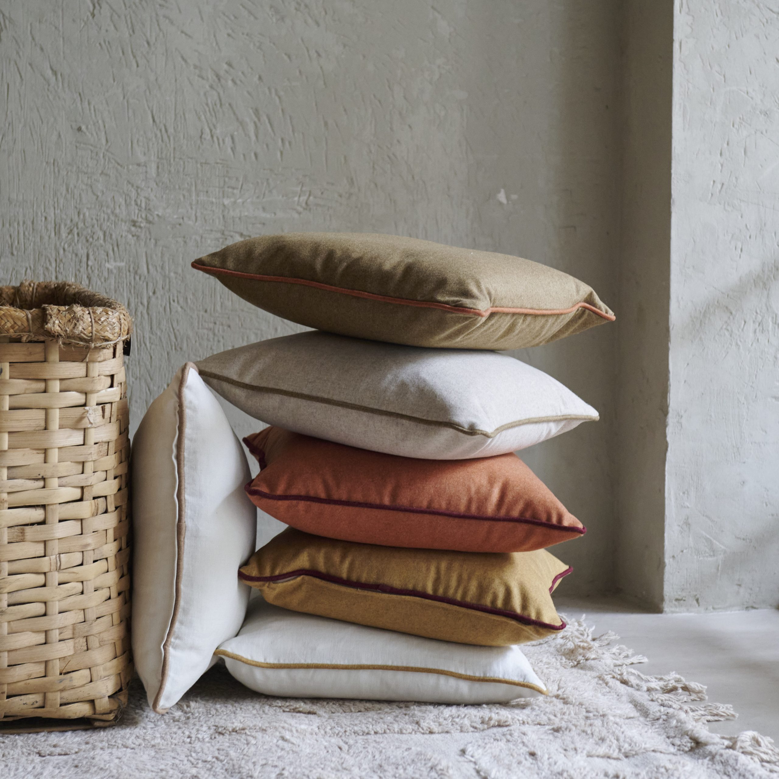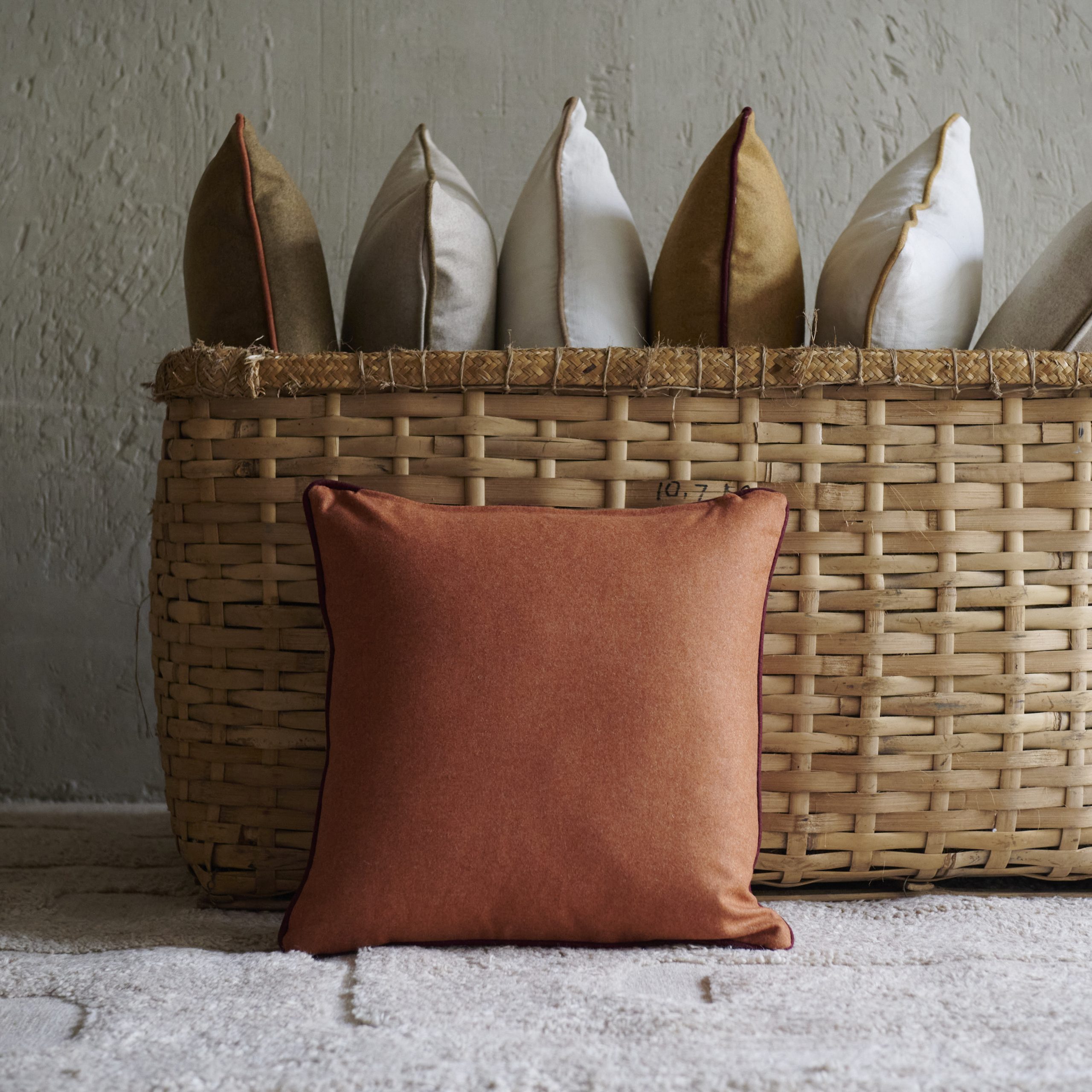 Cojín de lana teja con ribete granate. Presenta un diseño elegante y sencillo y su tela de lana virgen tiene una textura suave y cálida, con un tono teja rodeado por un sutil ribete granate que añade un toque de frescura.