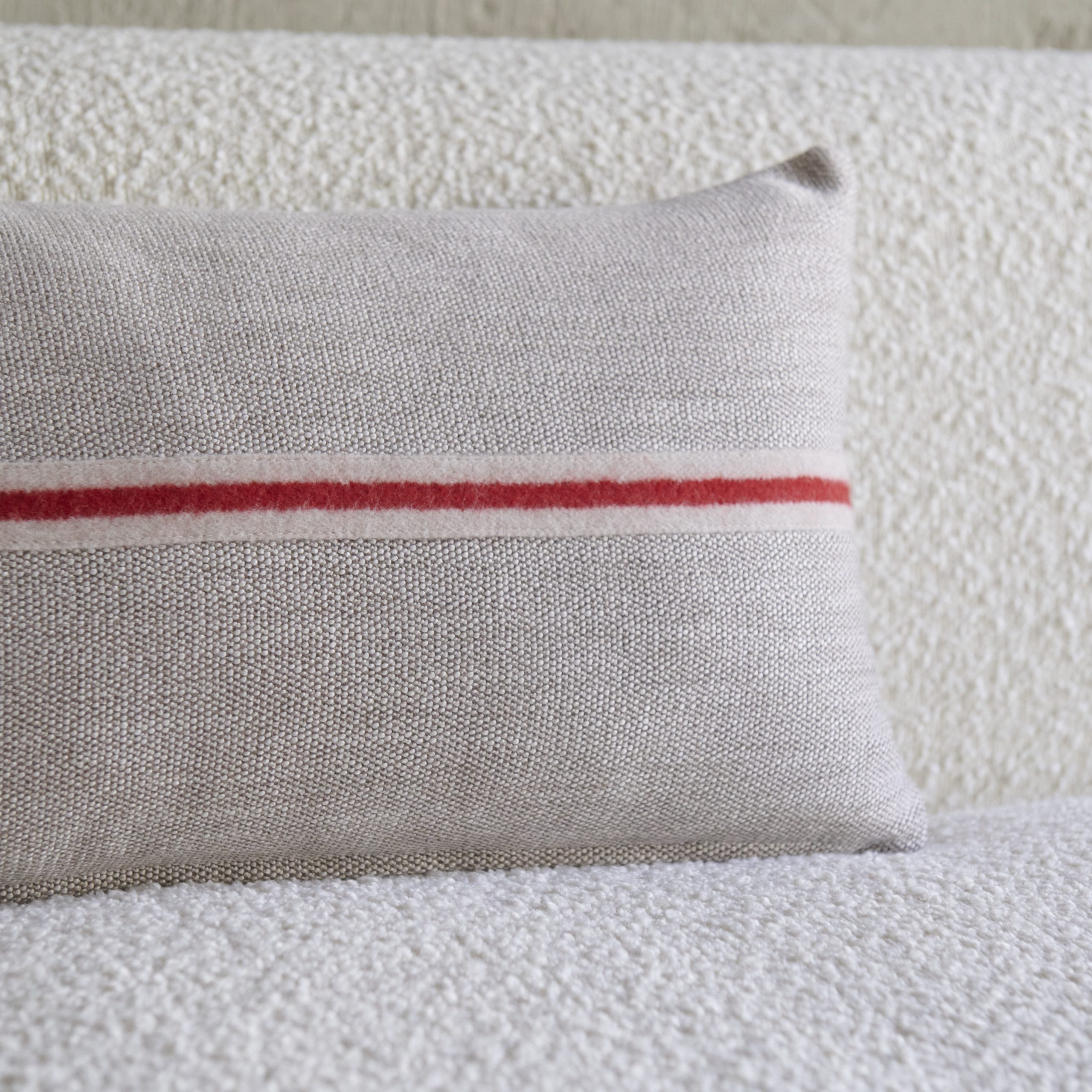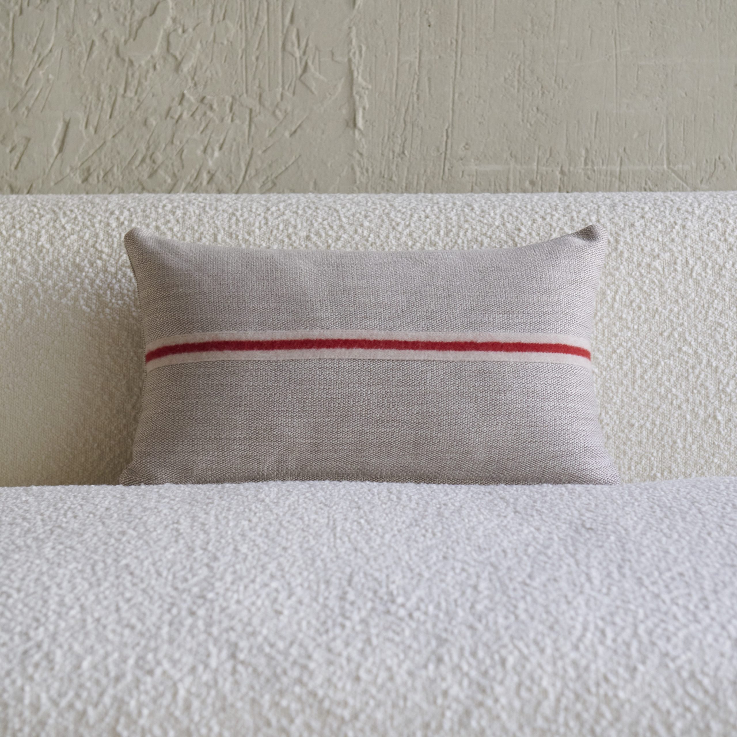 Cojín de lino beige con cenefa roja central 50×30. El color beige predominante crea una base neutra que aporta calidez y serenidad, en el centro del cojín, una cenefa roja resalta aportando un toque de contraste vibrante y sofisticado.