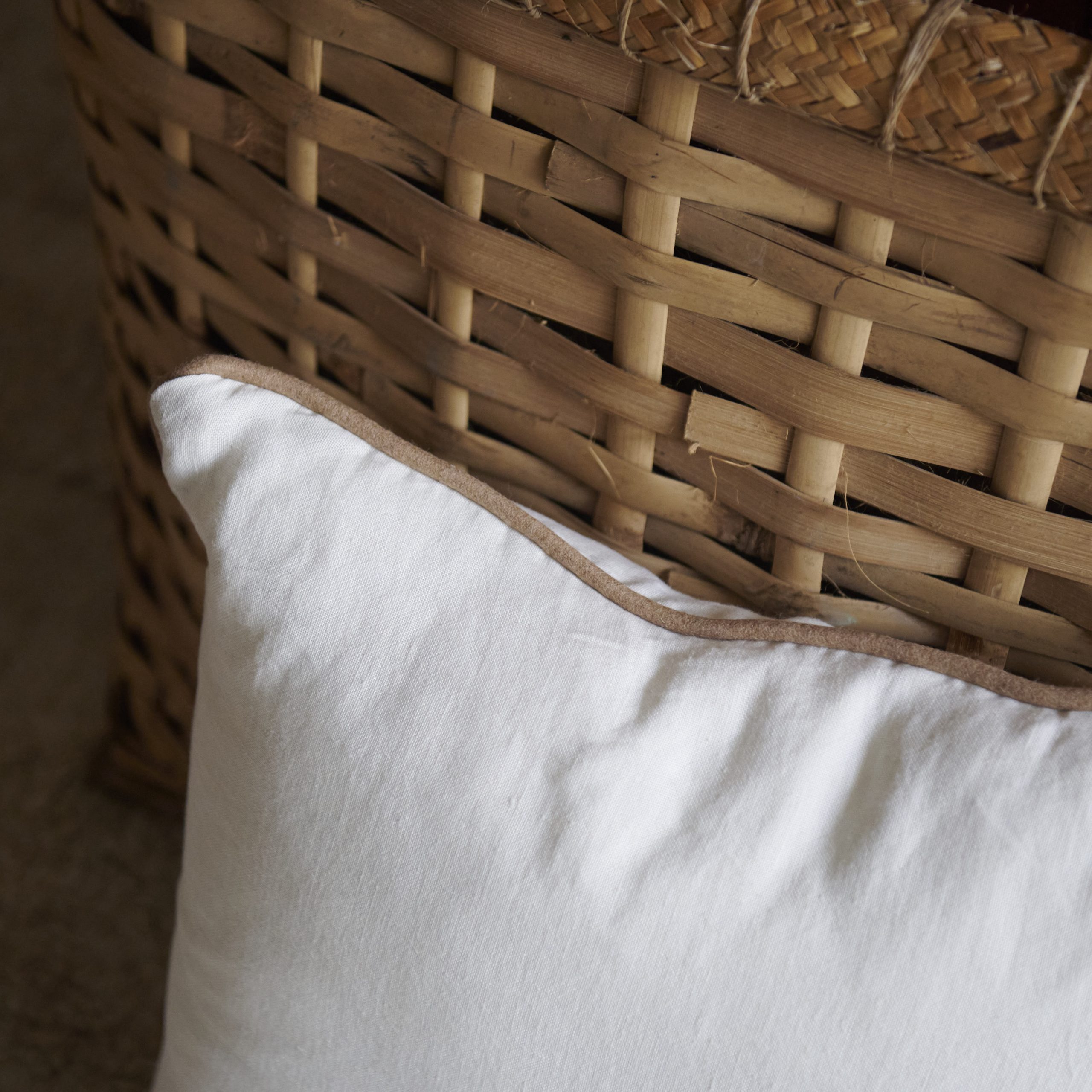 Cojín de lino beige con ribete tostado. Presenta un diseño elegante y sencillo, su tela de lino tiene una textura suave y natural, con un tono color beige rodeado por un sutil ribete tostado que añade un toque de frescura.