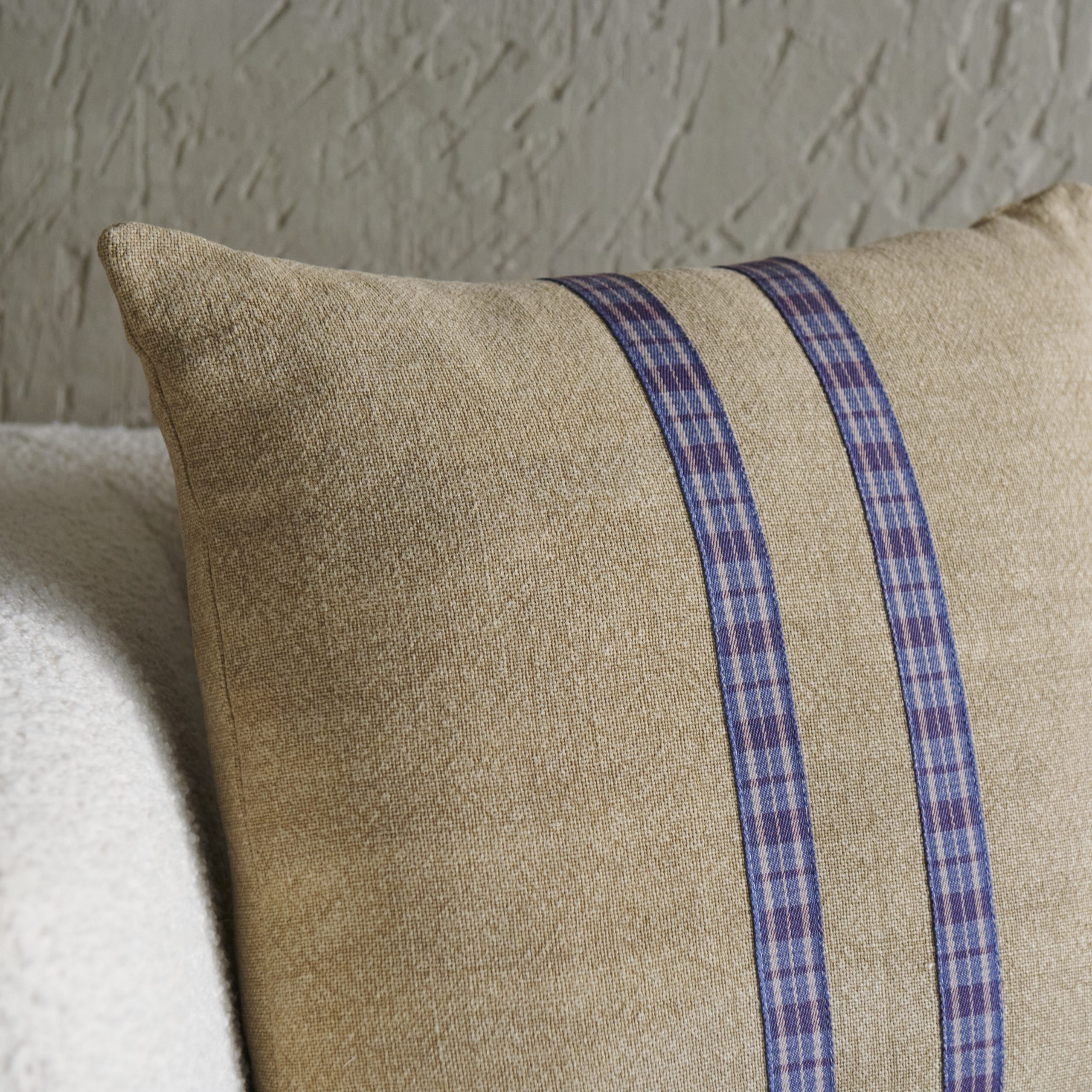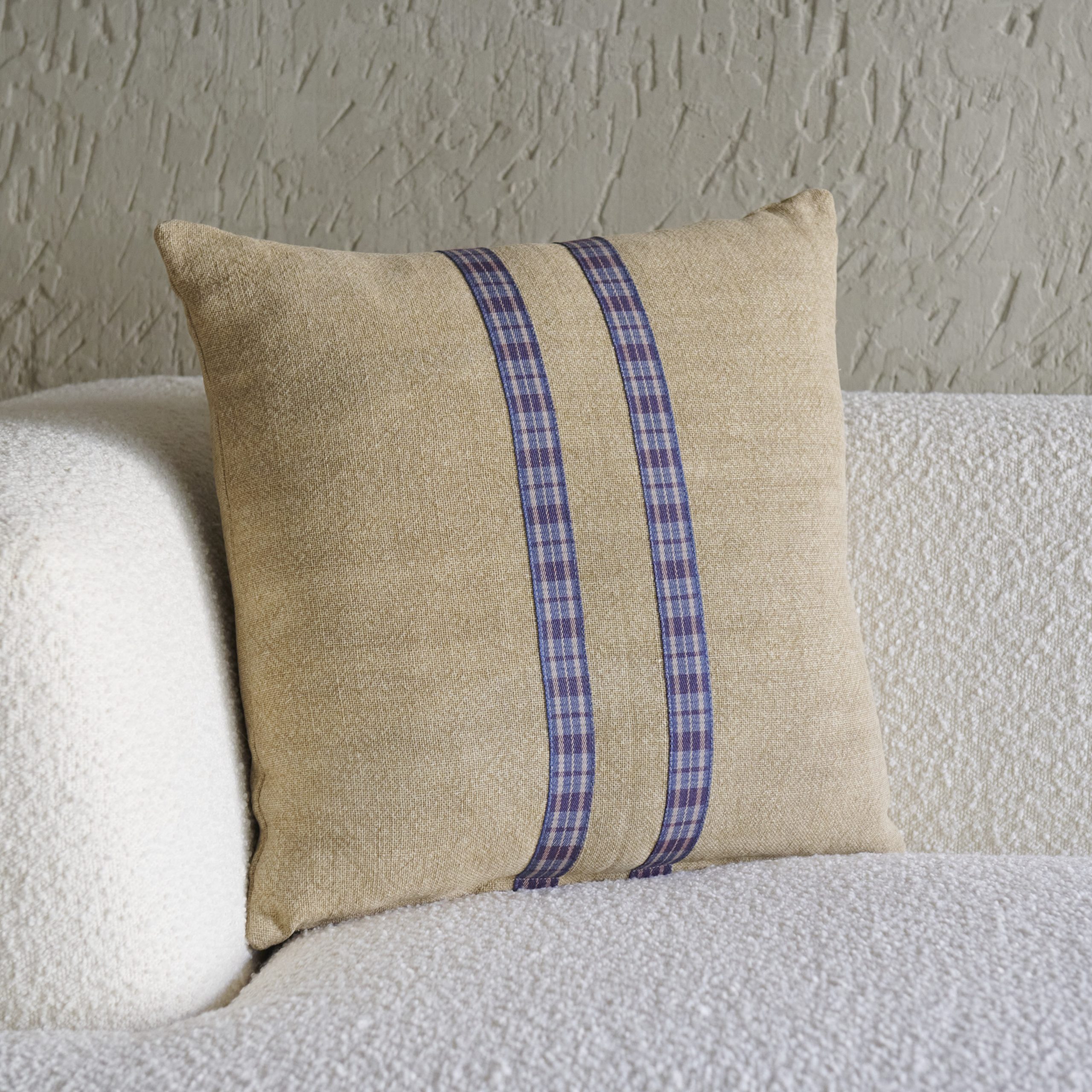 Cojín de lino con cenefa cuadros azules 50×50 cm. En un bonito lino color jute, este cojín tiene un diseño original con dos cenefas centrales de cuadros azules.