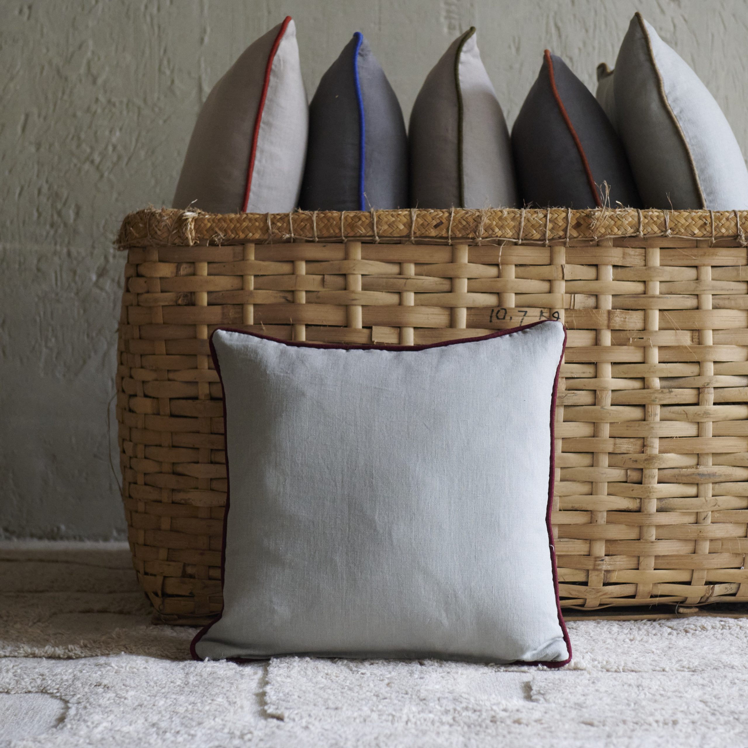 Cojín de lino piedra con ribete granate. Presenta un diseño elegante y sencillo, su tela de lino tiene una textura suave y natural, con un tono color piedra rodeado por un sutil ribete granate que añade un toque de frescura.