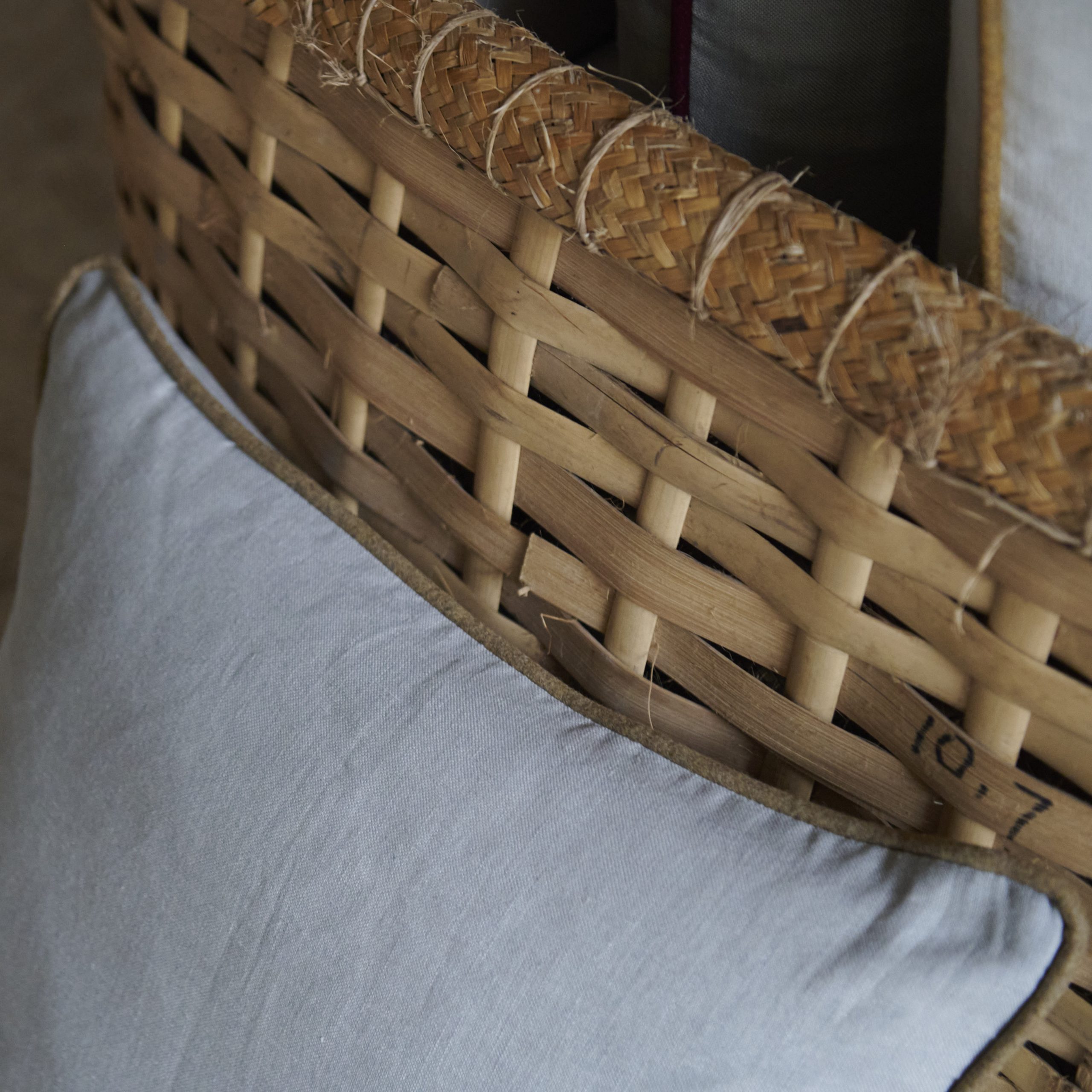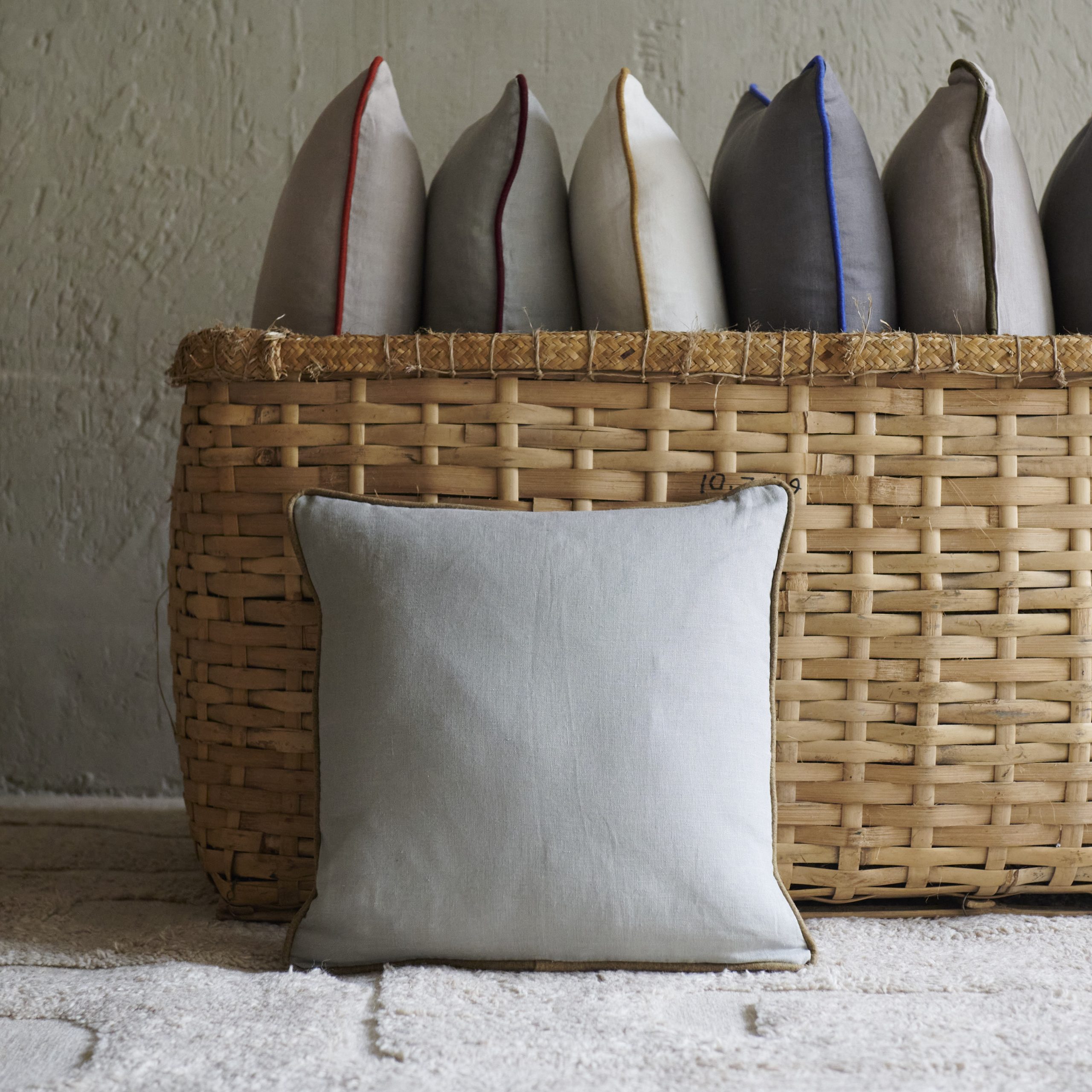 Cojín de lino piedra con ribete verde. Presenta un diseño elegante y sencillo, su tela de lino tiene una textura suave y natural, con un tono color piedra rodeado por un sutil ribete verde que añade un toque de frescura.