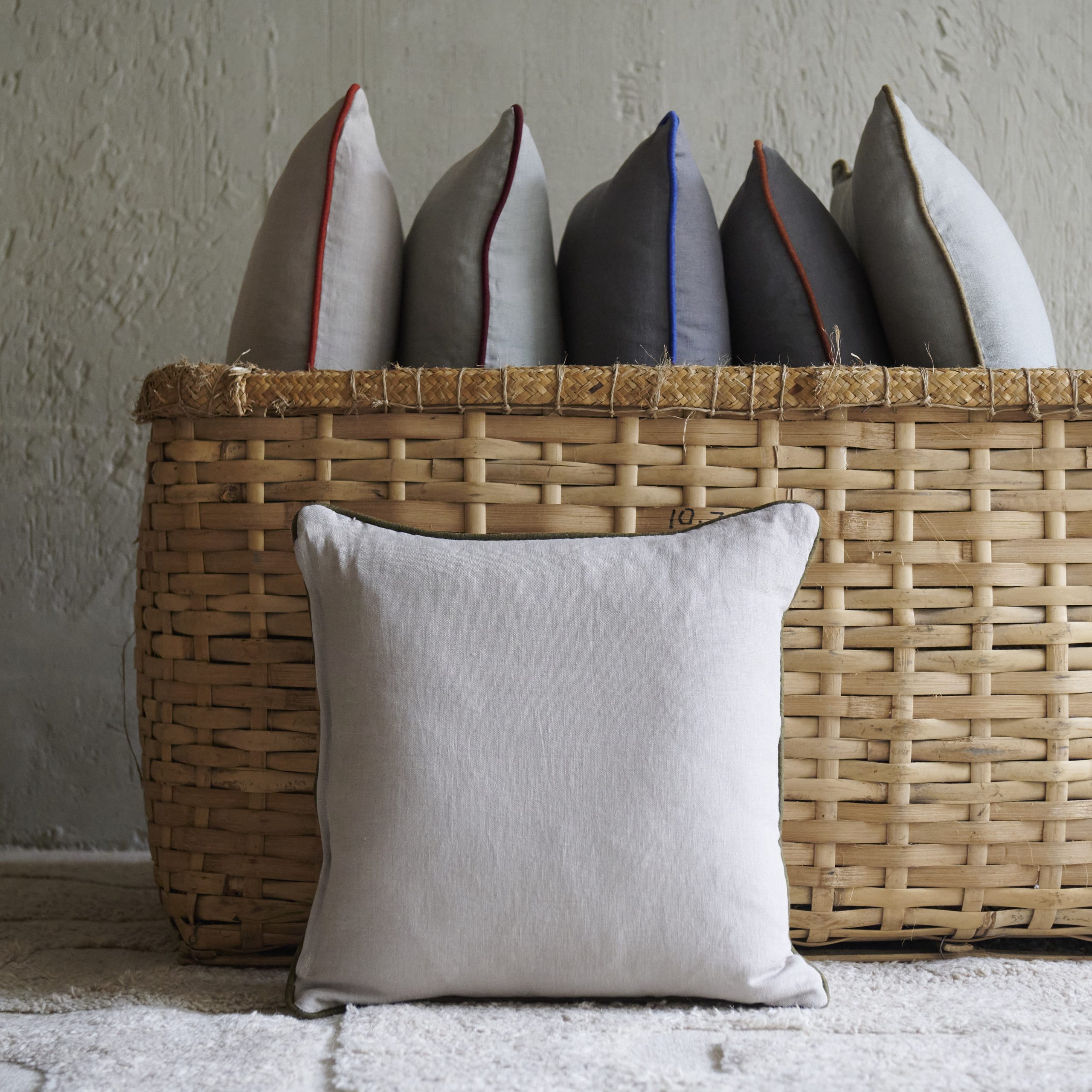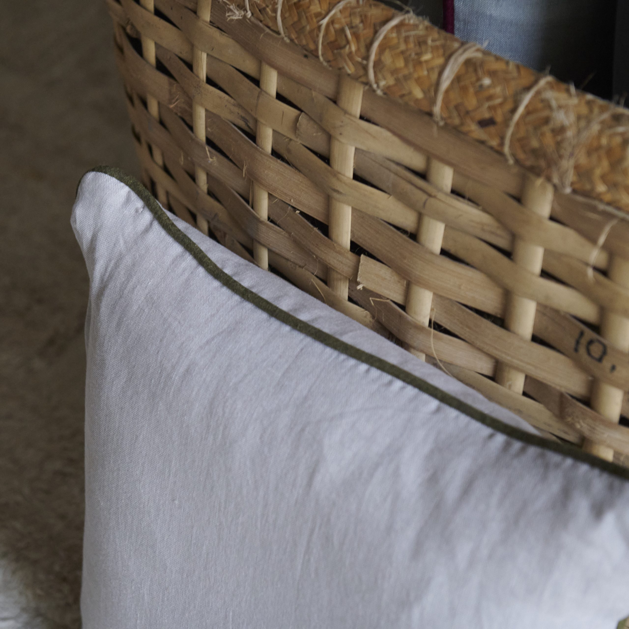 Cojín de lino topo con ribete verde. Presenta un diseño elegante y sencillo, su tela de lino tiene una textura suave y natural, con un tono color topo rodeado por un sutil ribete verde que añade un toque de frescura.