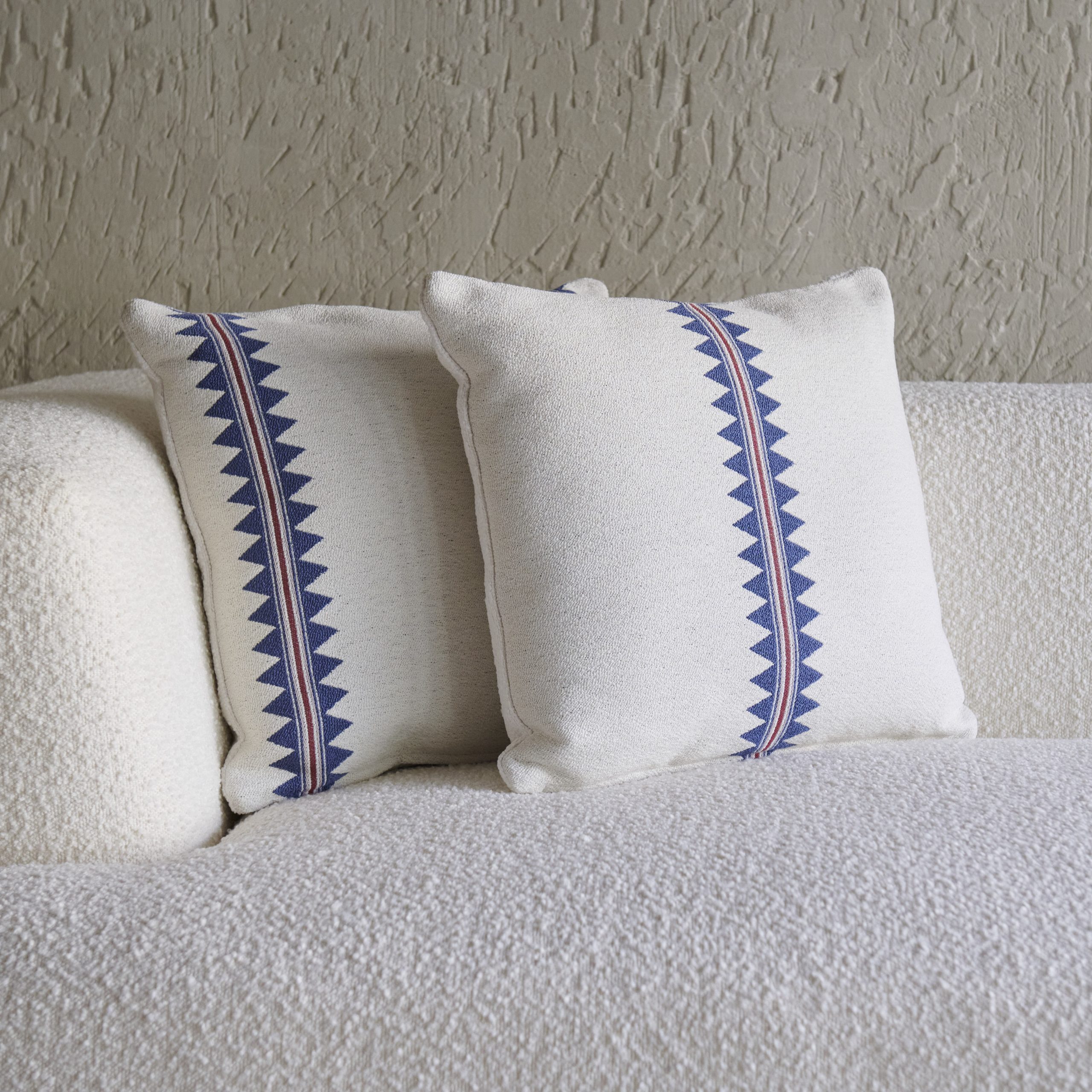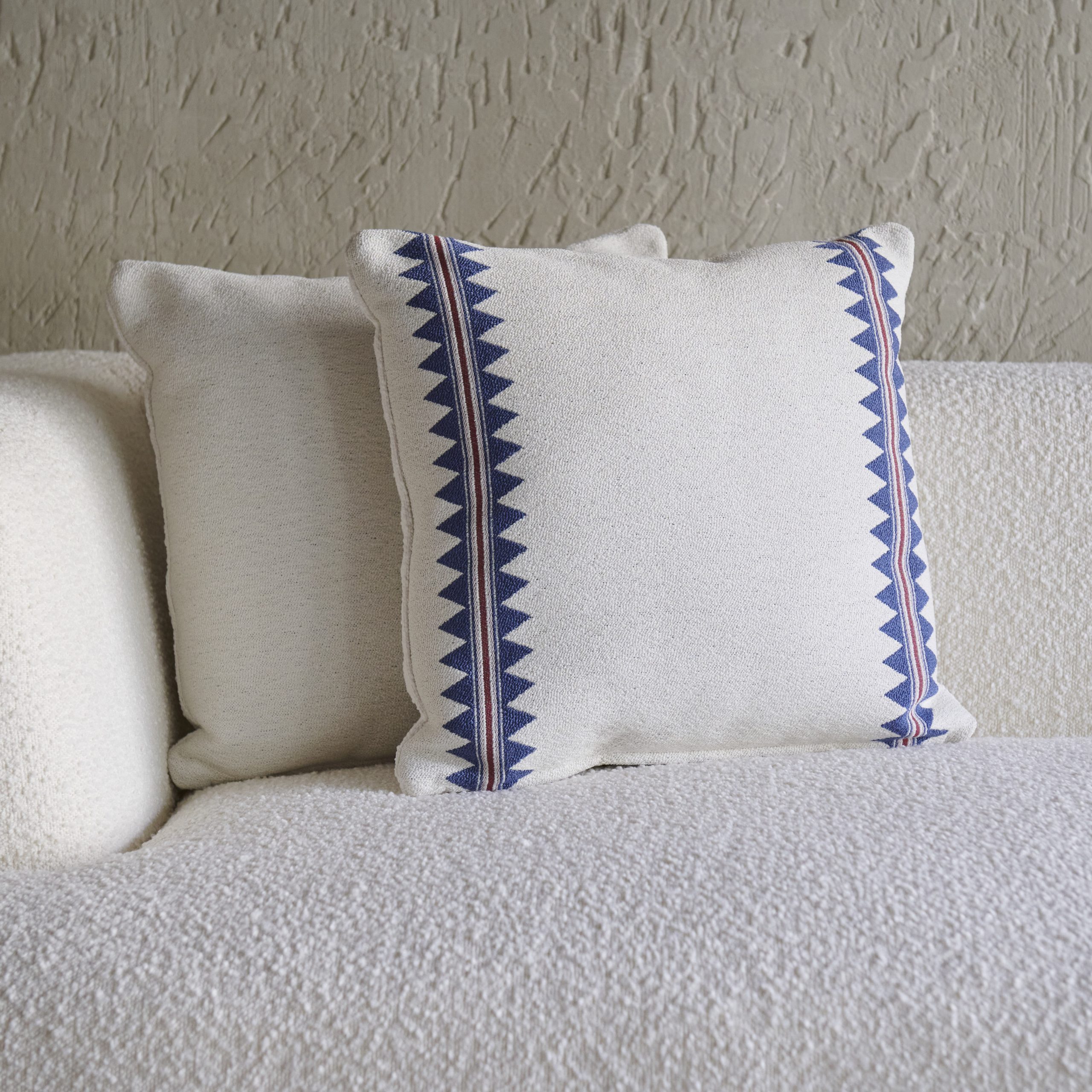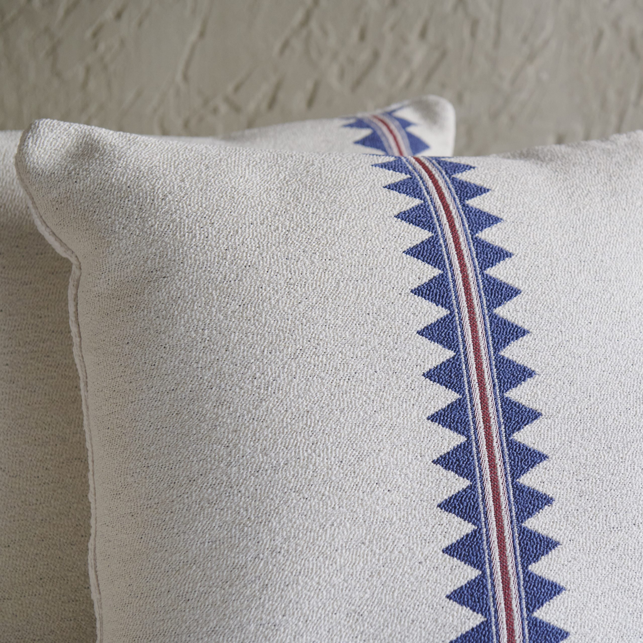 Cojín de tela pamuk greca azul 55×55 cm. Confeccionado con lino y algodón, el diseño sigue un patrón de rayas con motivos étnicos sobre fondo blanco. Sirve para exterior.