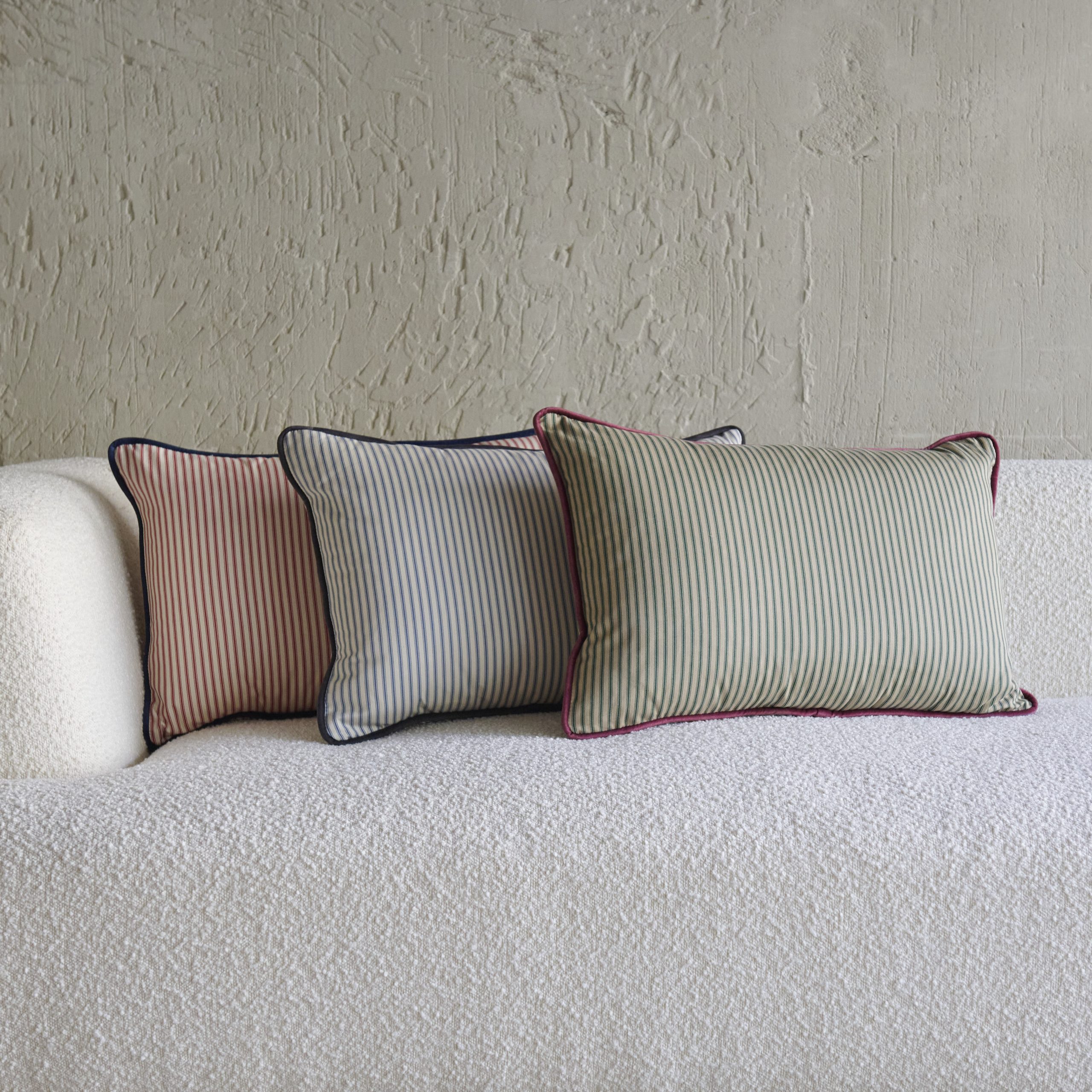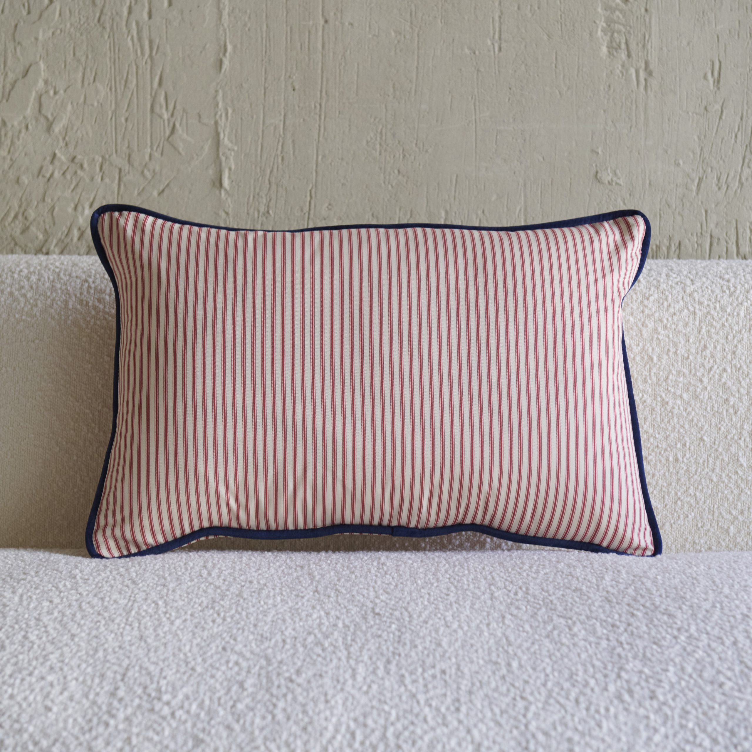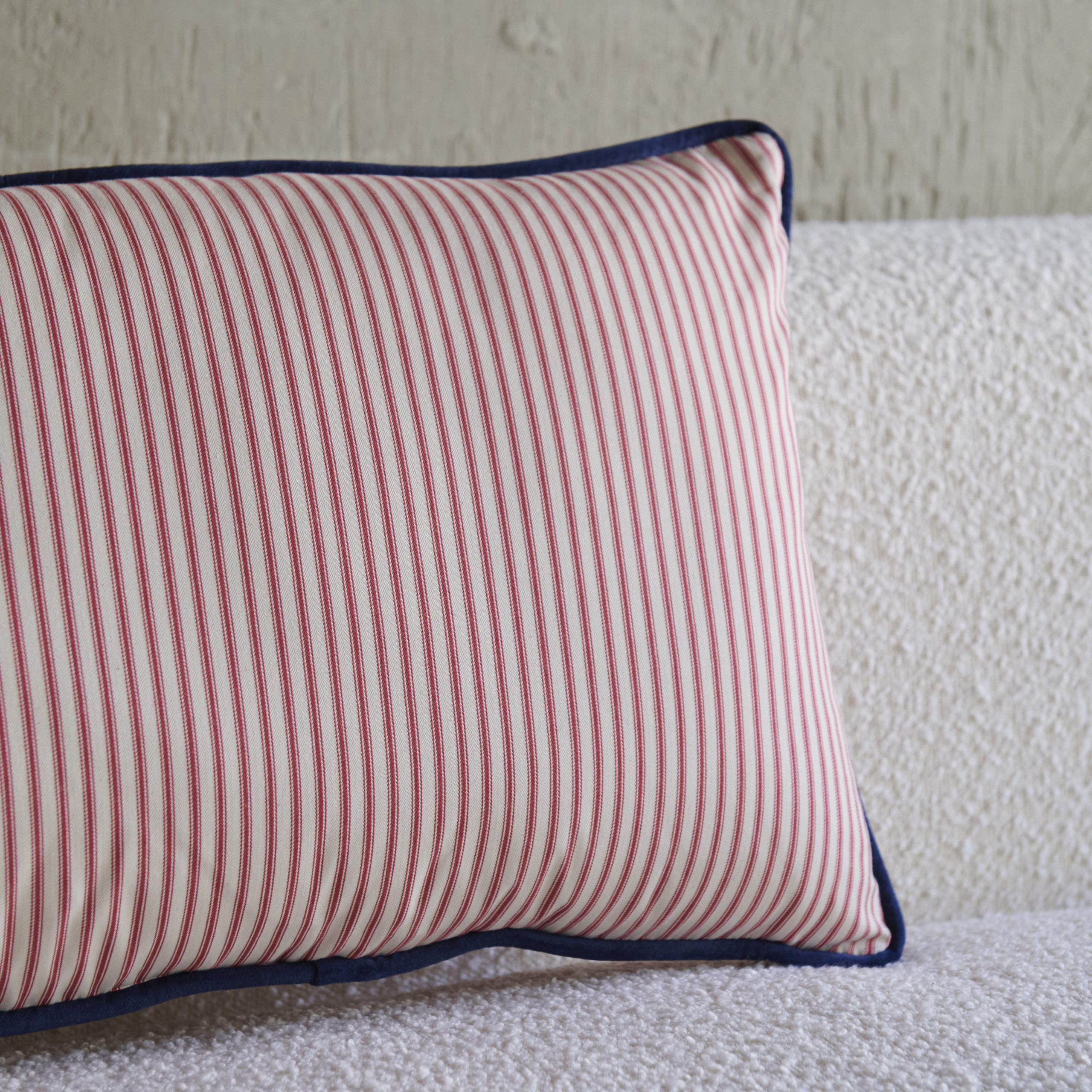 Cojín rayas rosas con ribete en terciopelo 60×40. Fabricado con un tejido tradicional de finas rayas verticales que comprende ricos tonos rosas y lino rústico. Va rematado con un ribete en terciopelo azul marino. Un cojín elegante a la par que lleno de frescura.