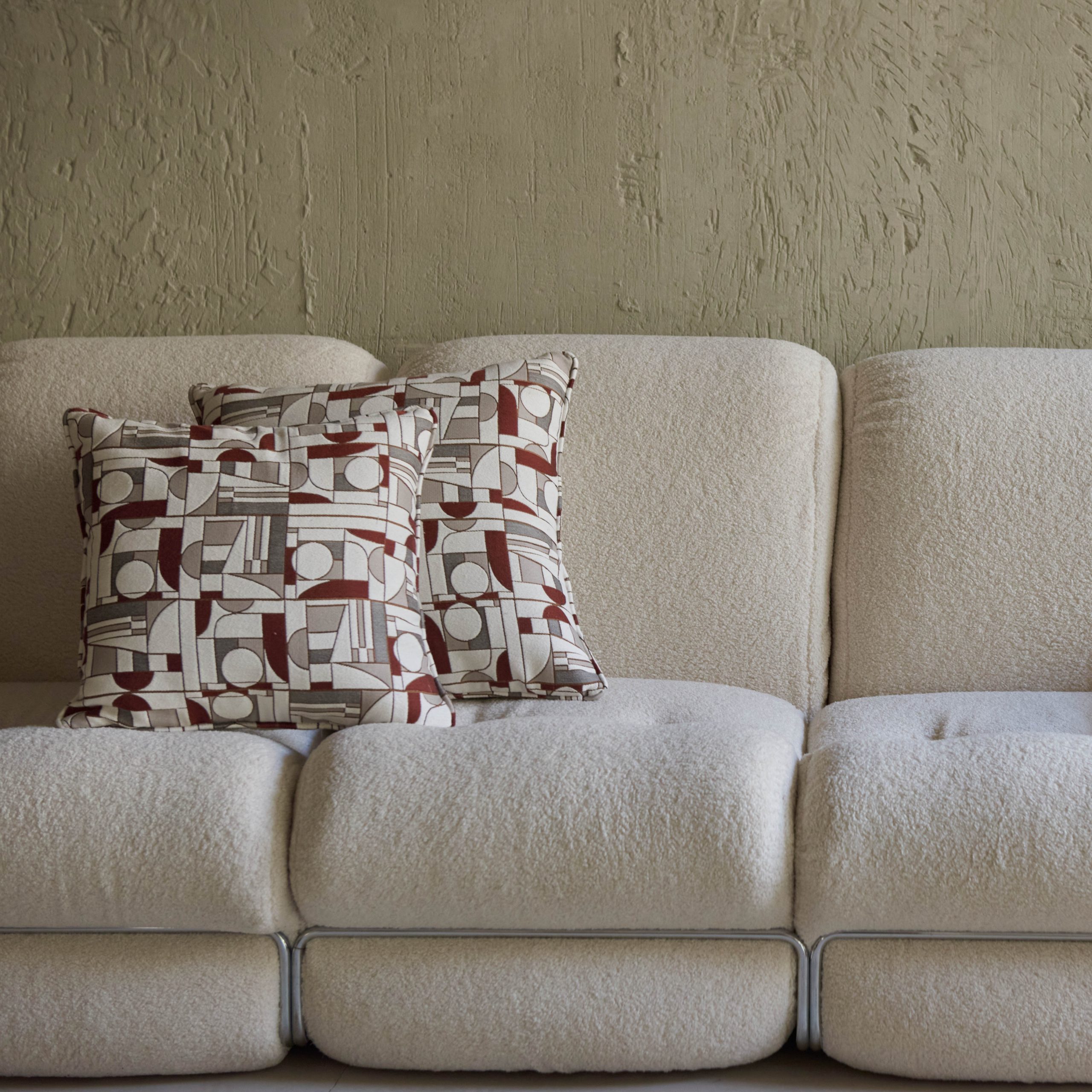 Cojín de formas geométricas e inspiración cubista en tonos terracota. Medidas: 45×45 cm