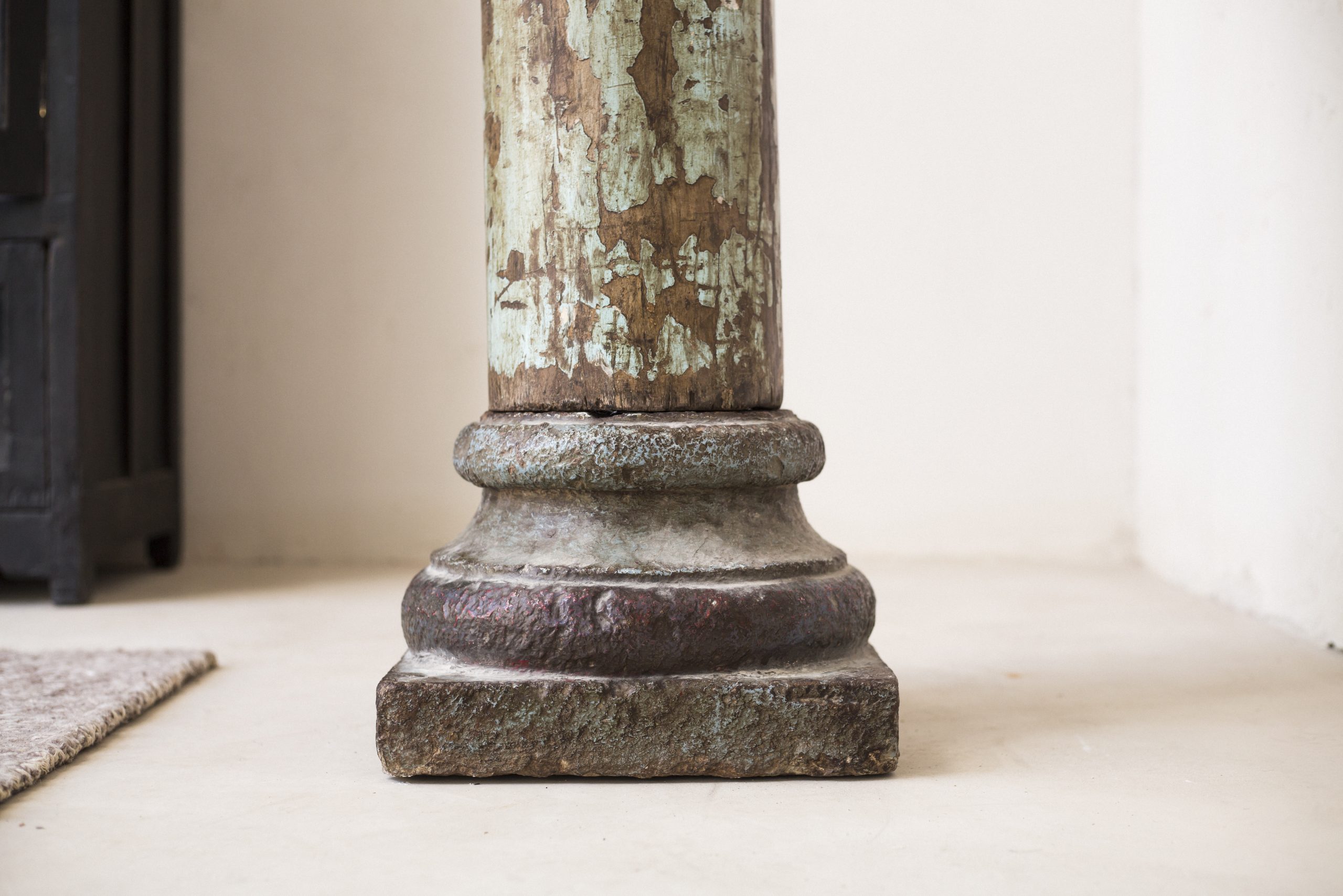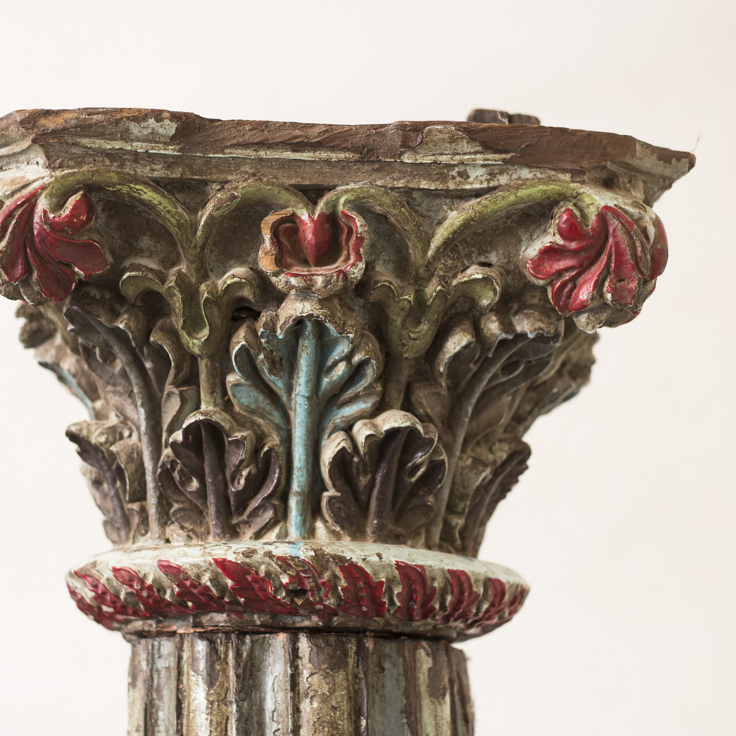 Columna antigua de madera con precioso capitel labrado a mano con motivos florales. Se trata de una pieza única de madera maciza. Medidas: 265×36 cm.