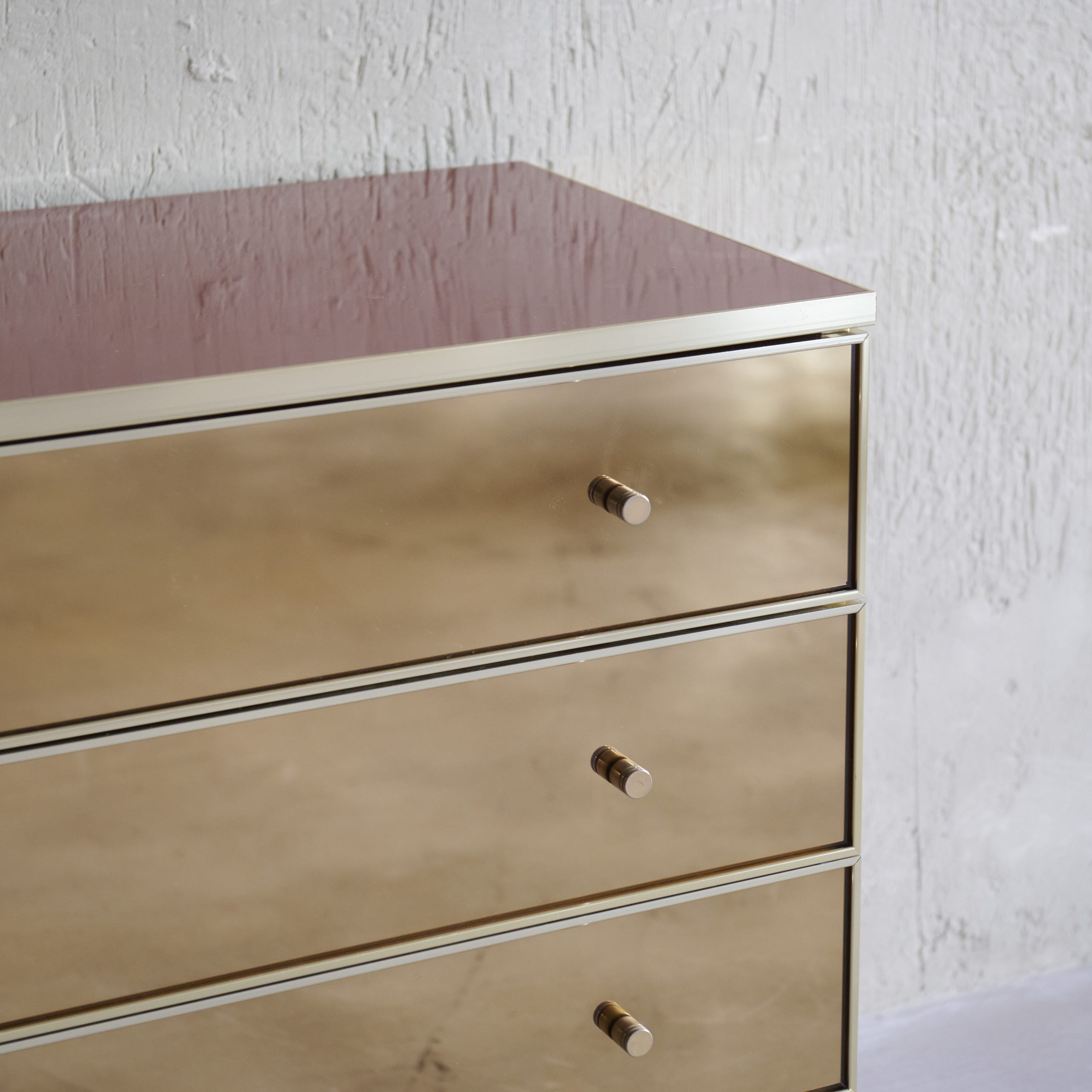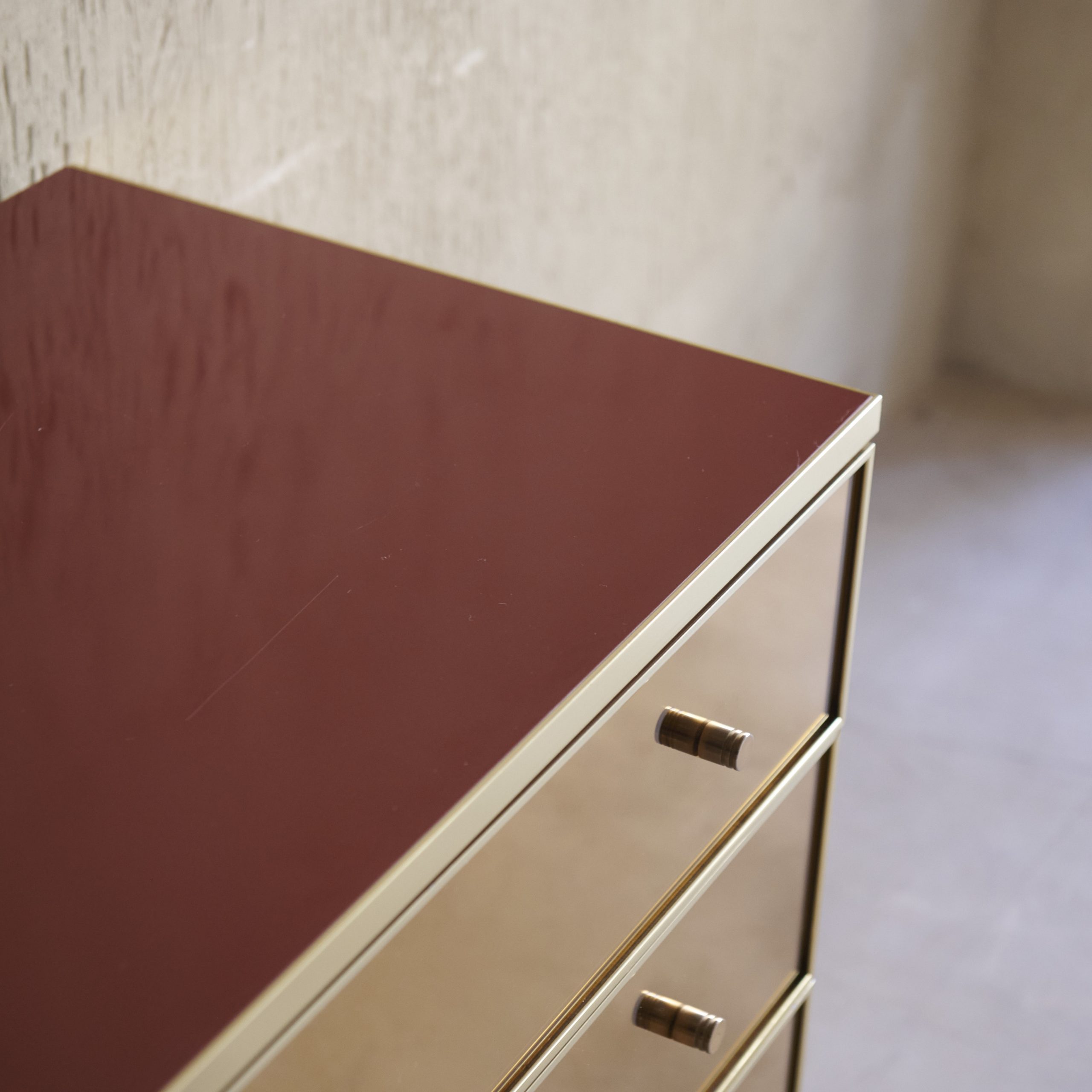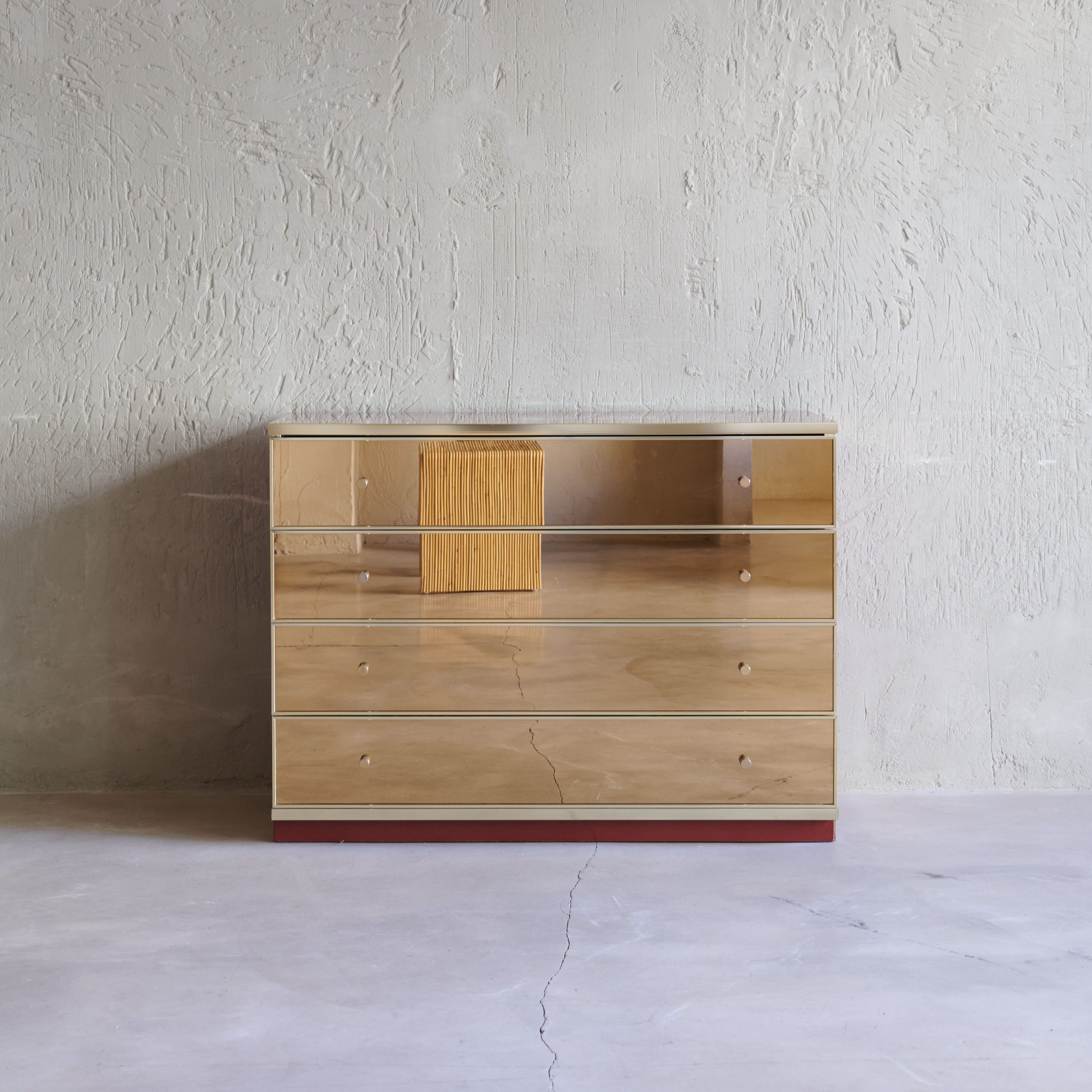 Cómoda vintage de espejo diseño Renato Zevi. Impresionante pieza vintage, una cómoda original de la década de los 70, hecha a mano en Italia, por el conocido diseñador. Una pieza deslumbrante que captura la esencia de la modernidad y diseño atrevido de la época. Su estructura de madera lacada en un bonito color rojo presenta líneas sencillas y limpias, con cajones acabados en espejo ligeramente ahumado. Es un mueble que irradia belleza con un aire moderno y chic que nunca pasa de moda.