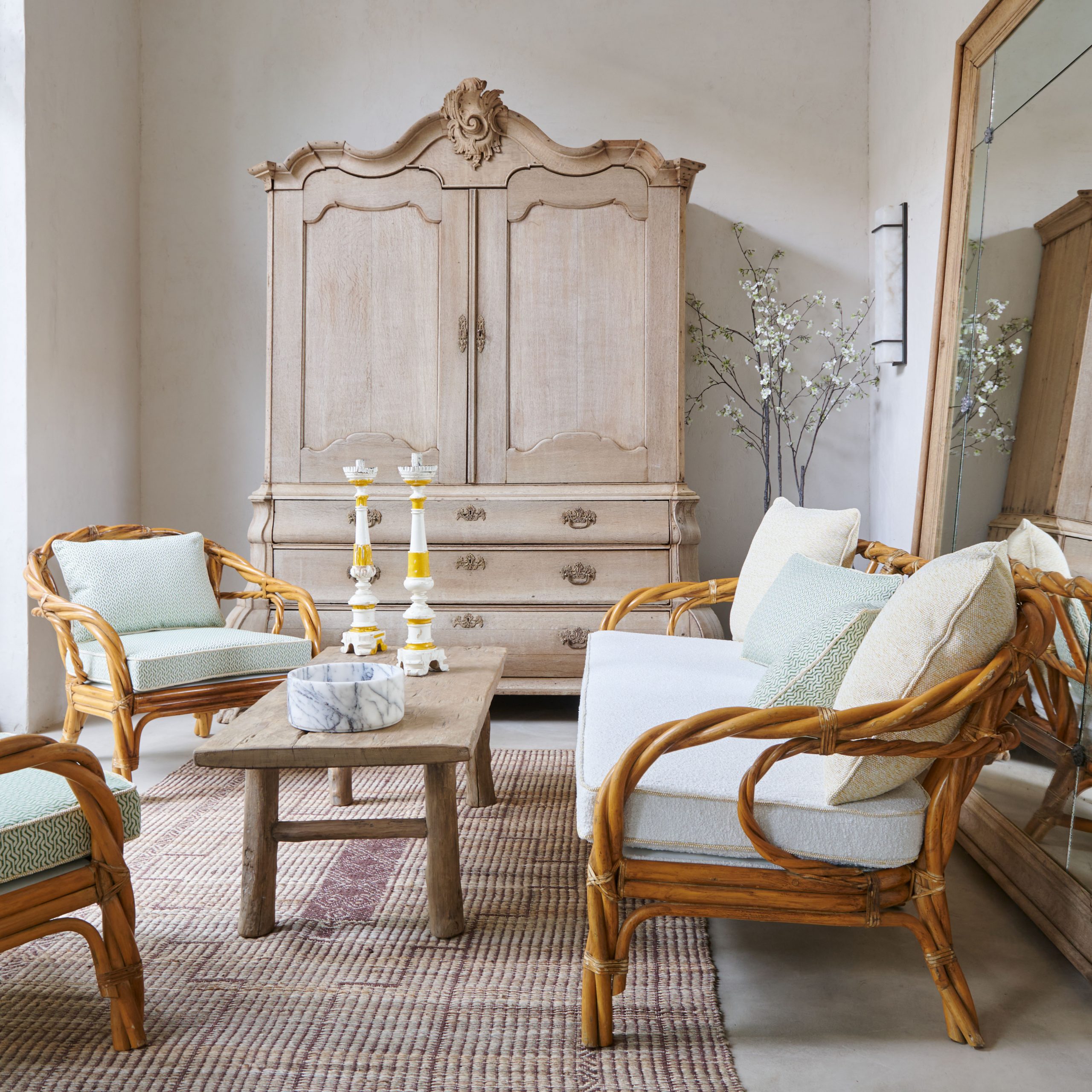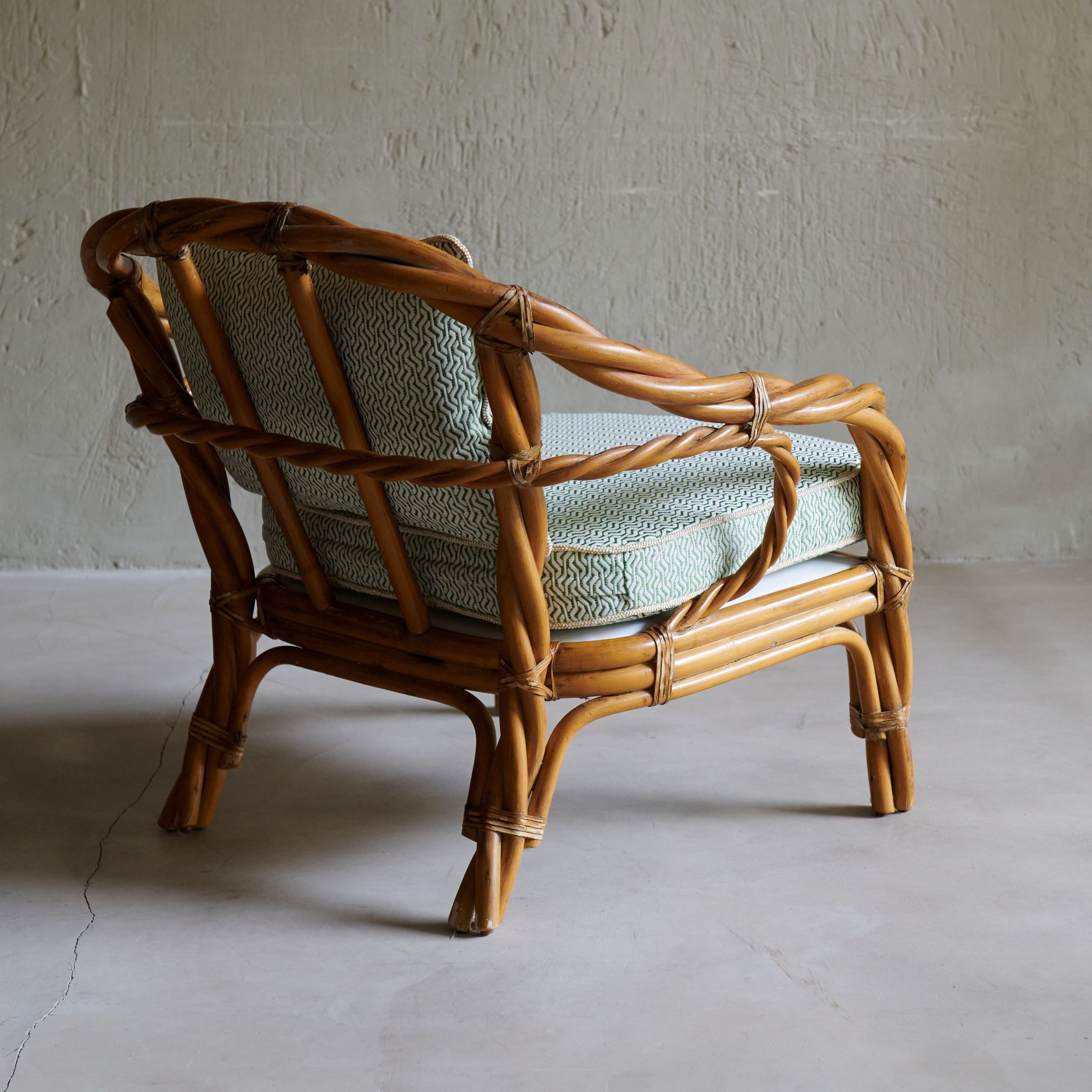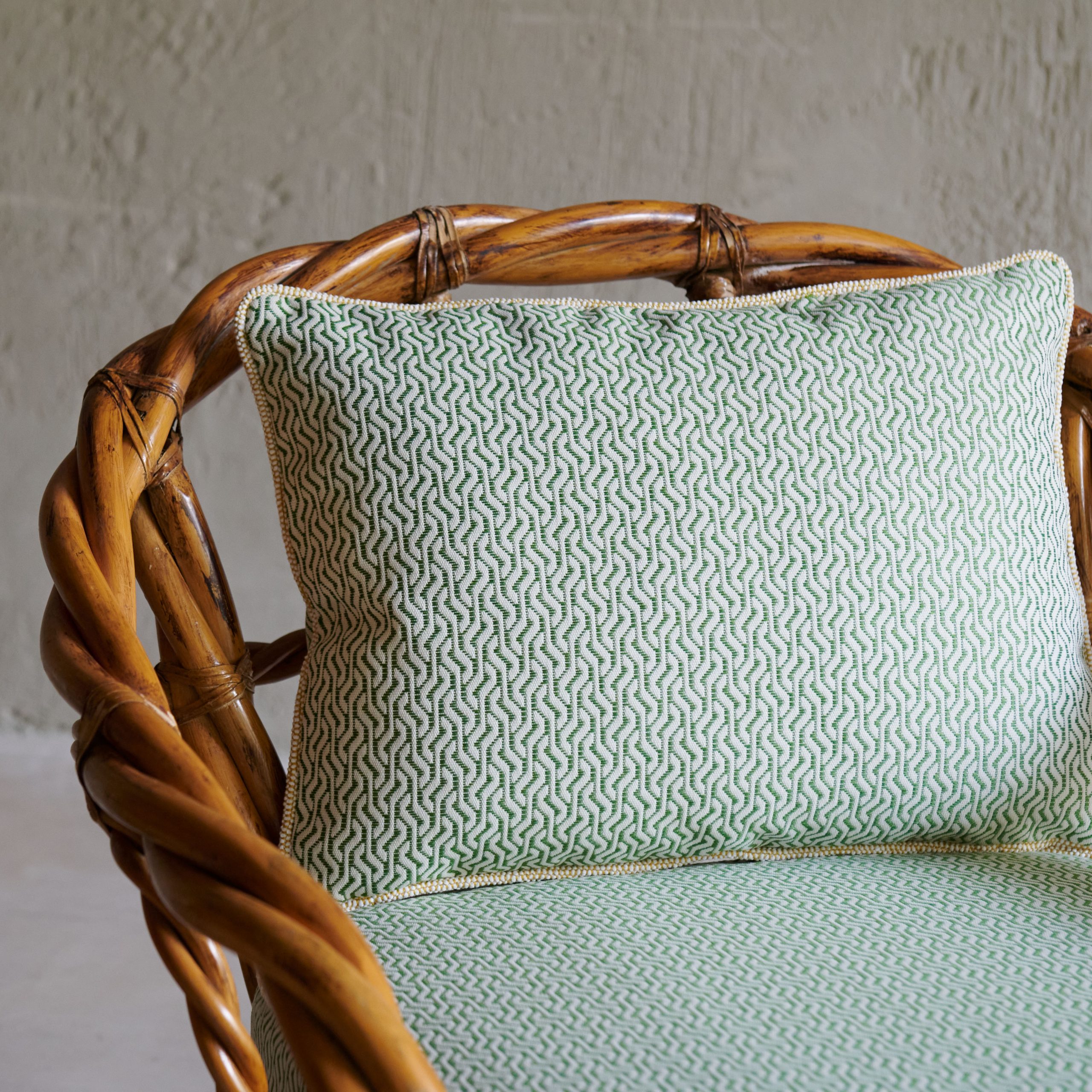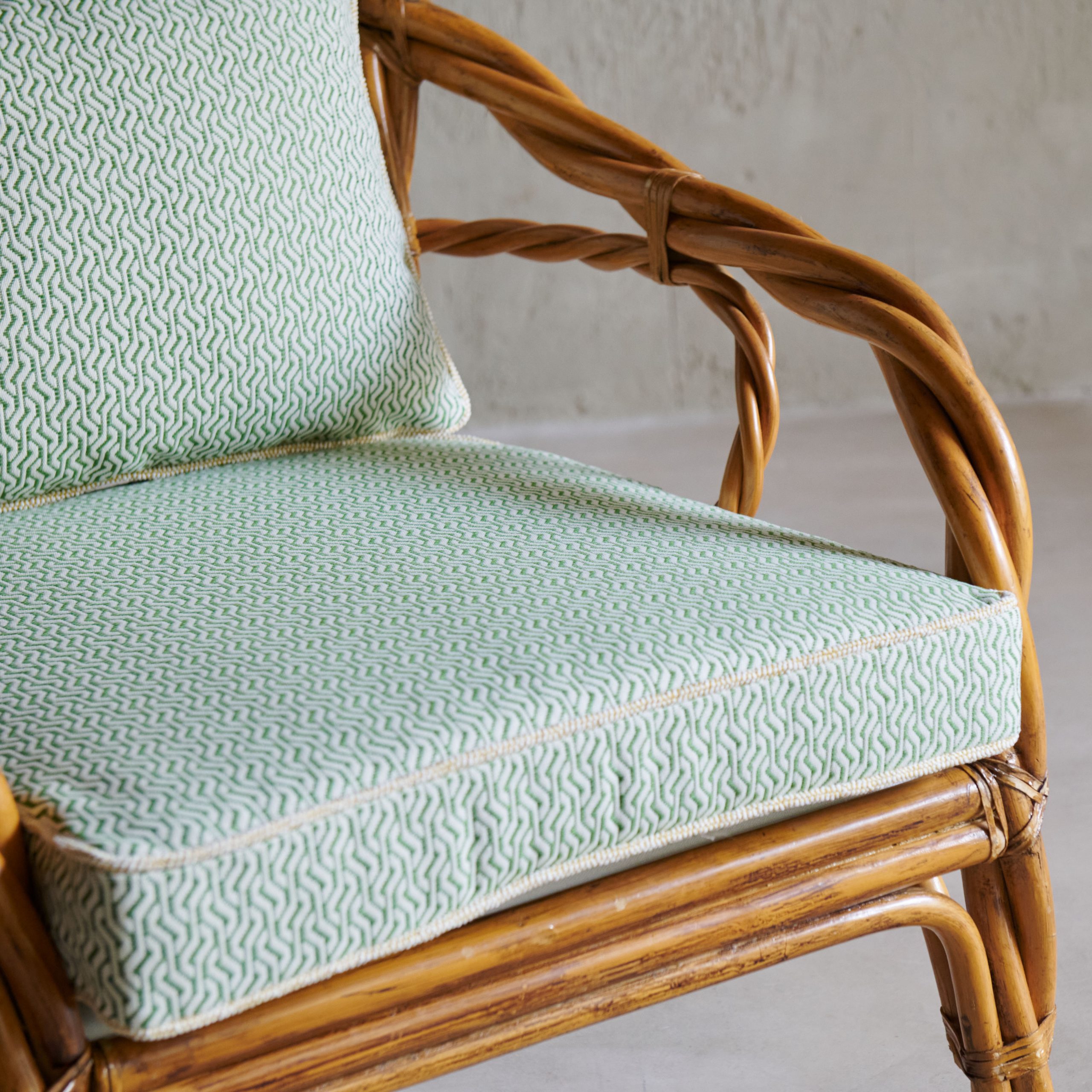 Pareja de butacas de jardín vintage francés de caña. Fabricado en Francia alrededor de la década de los 60, es 100% artesanal. Las butacas mantienen su estado original y las hemos acompañado de bonitos y mullidos asientos de fresco colorido y elegante diseño, siempre con las mejores telas. Verdes y blancos rotos que harán las delicias de cualquier jardín, porche o terraza.