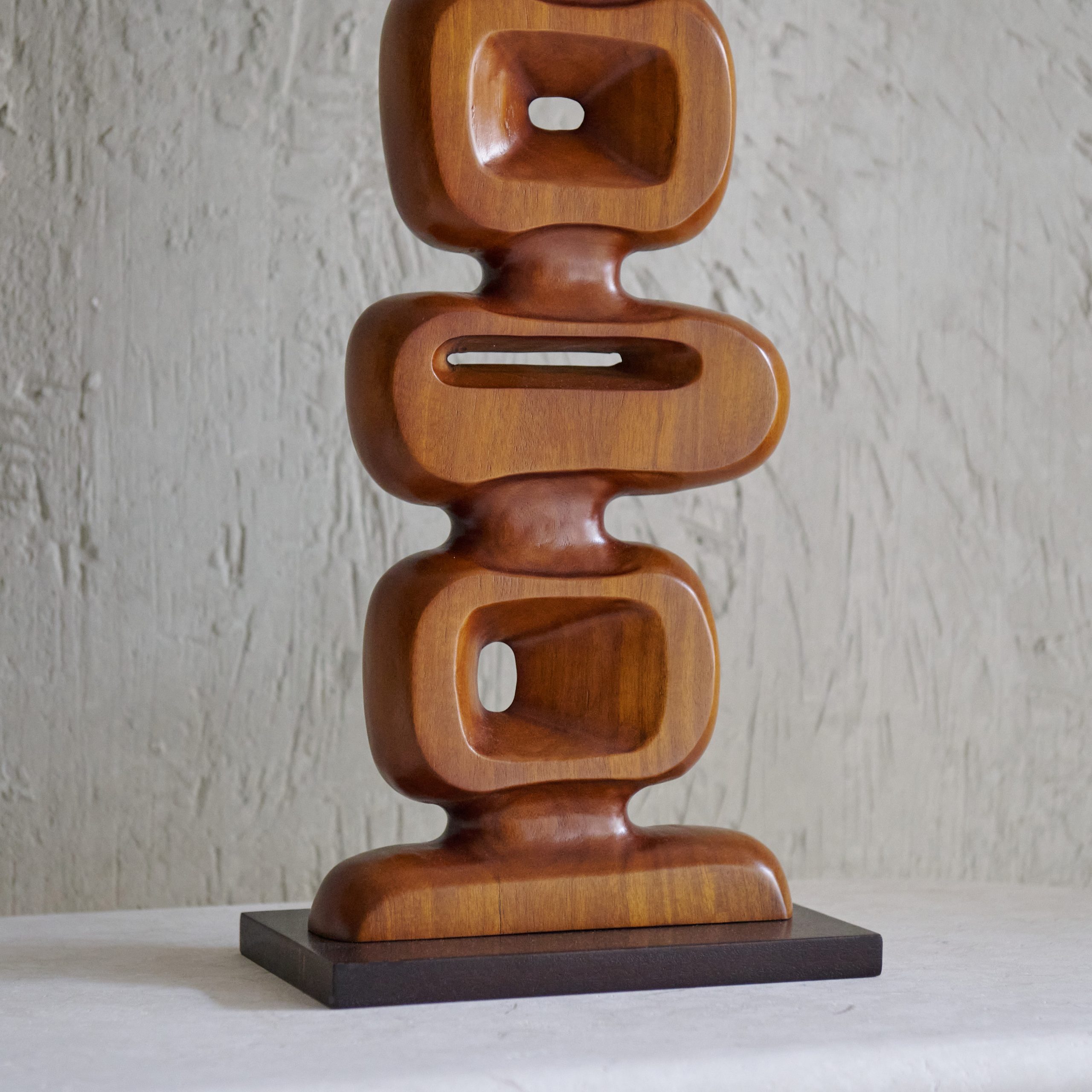 Escultura de madera tallada a mano, exhibe la destreza artesanal y la creatividad del escultor. El diseño resalta su belleza natural y singularidad, es una obra de arte que trasciende el tiempo.