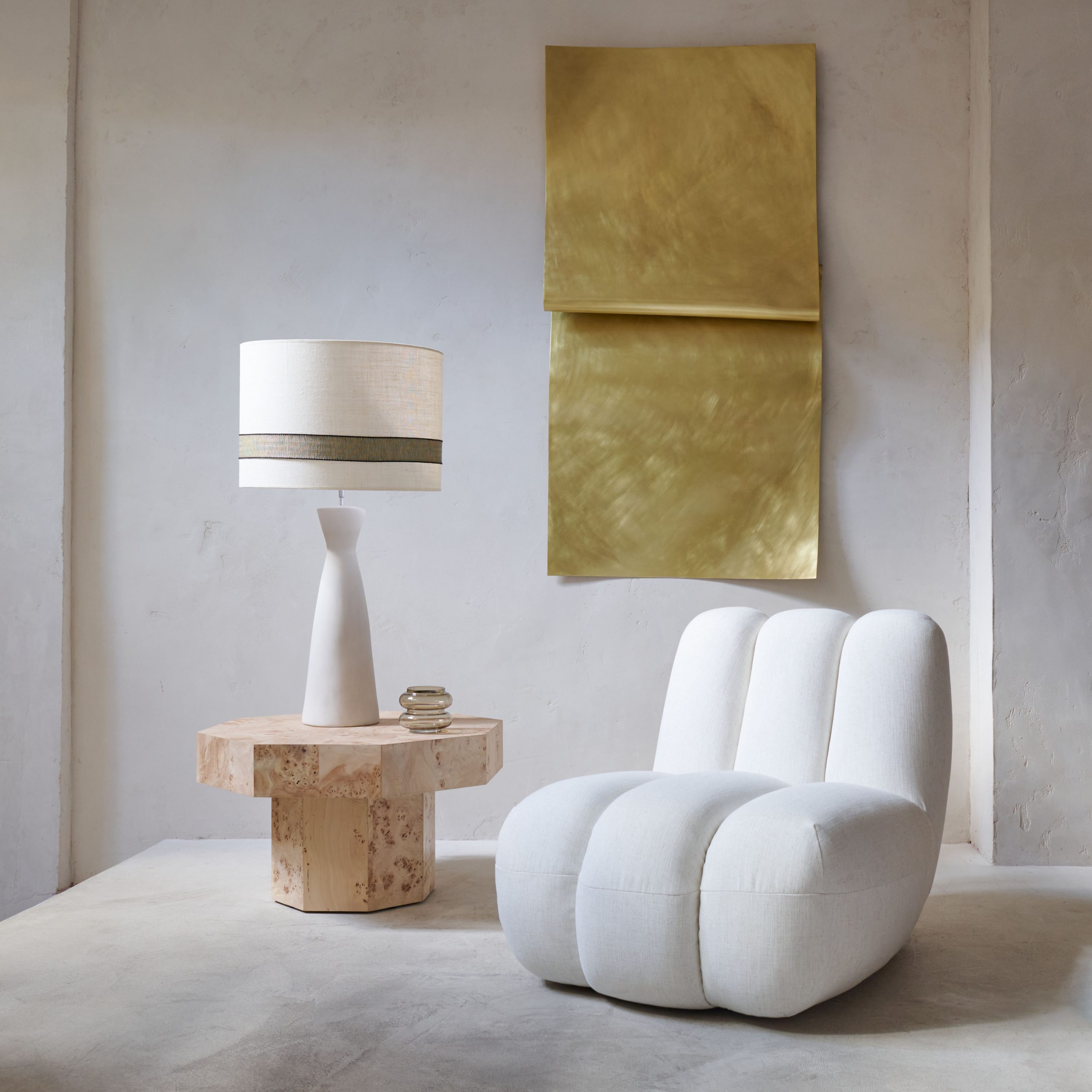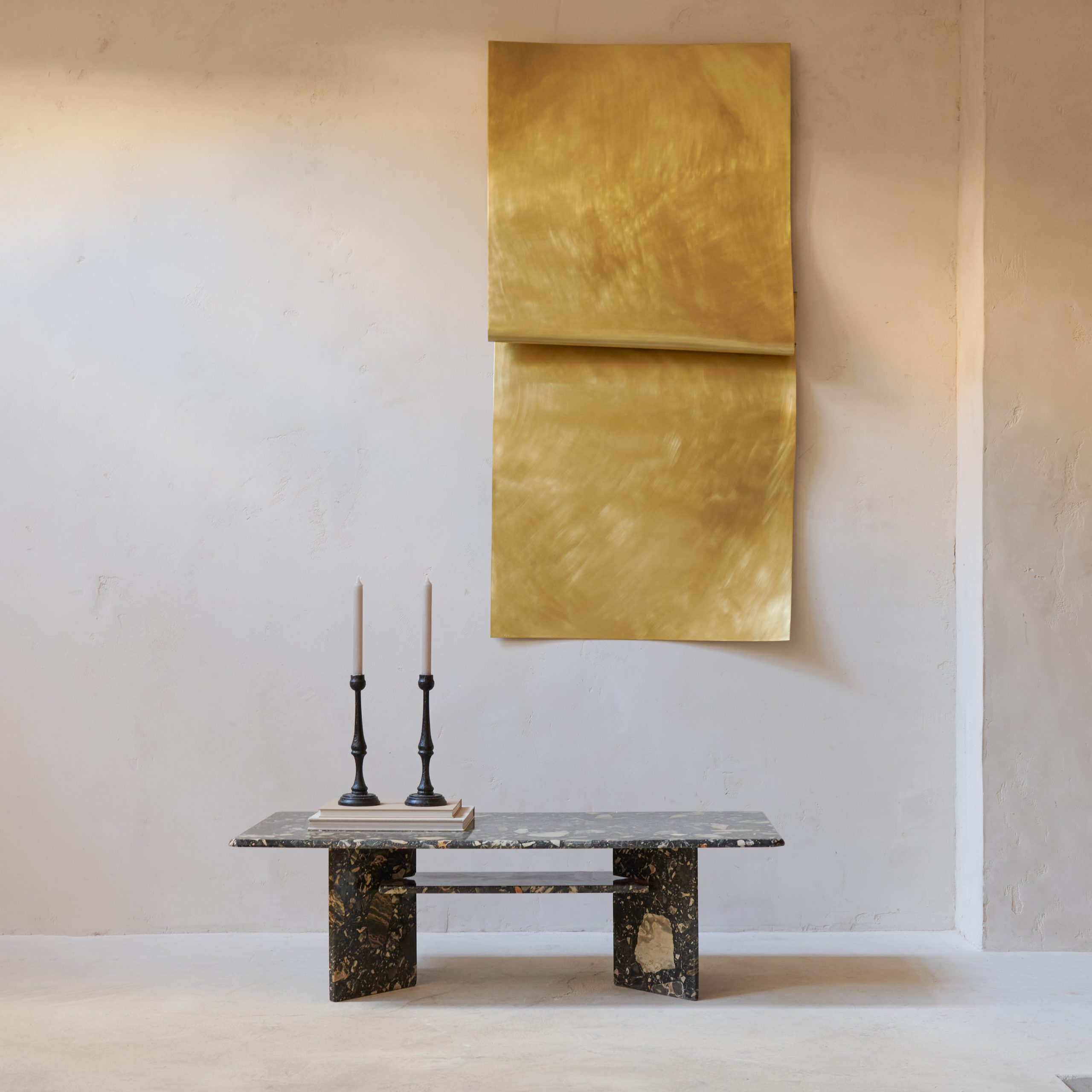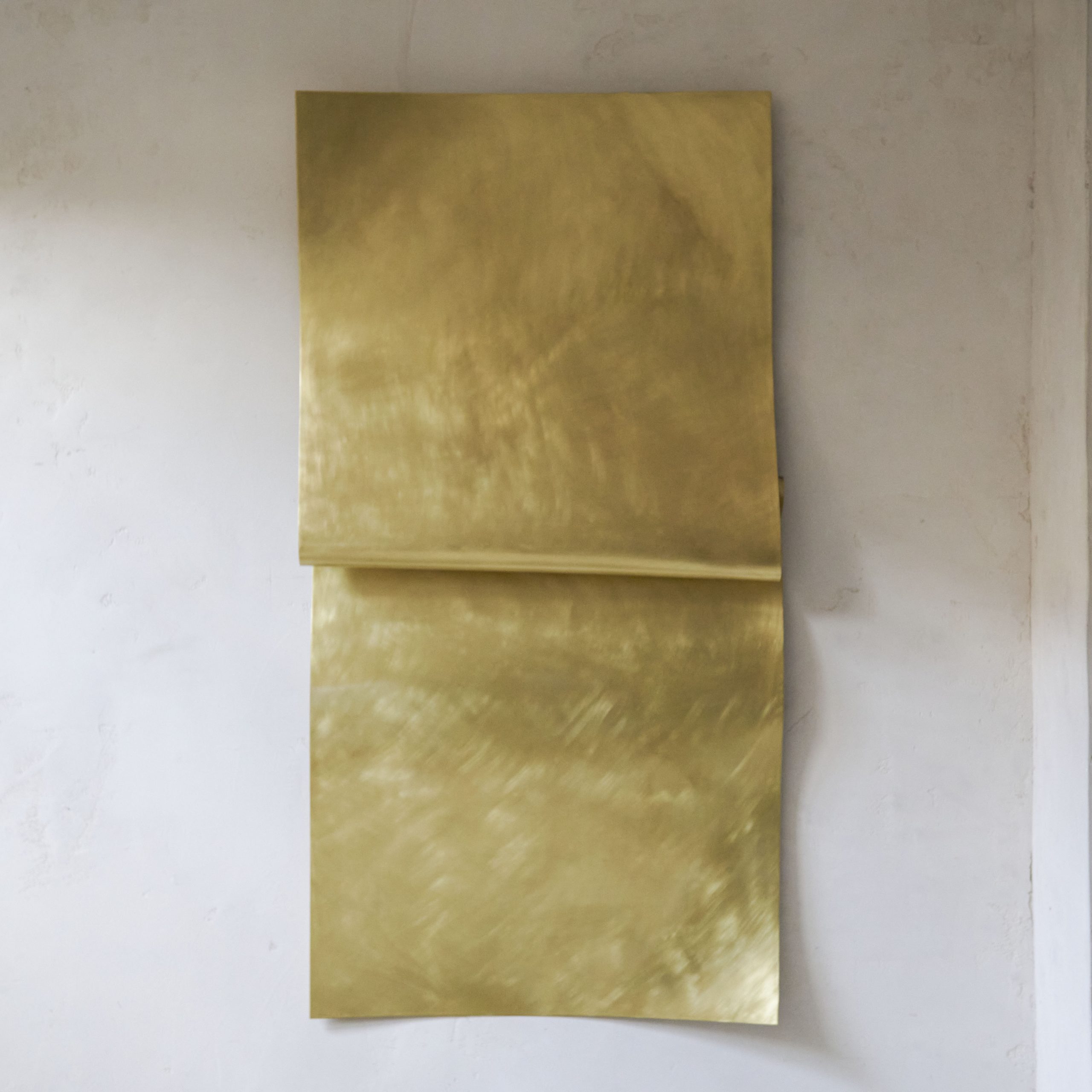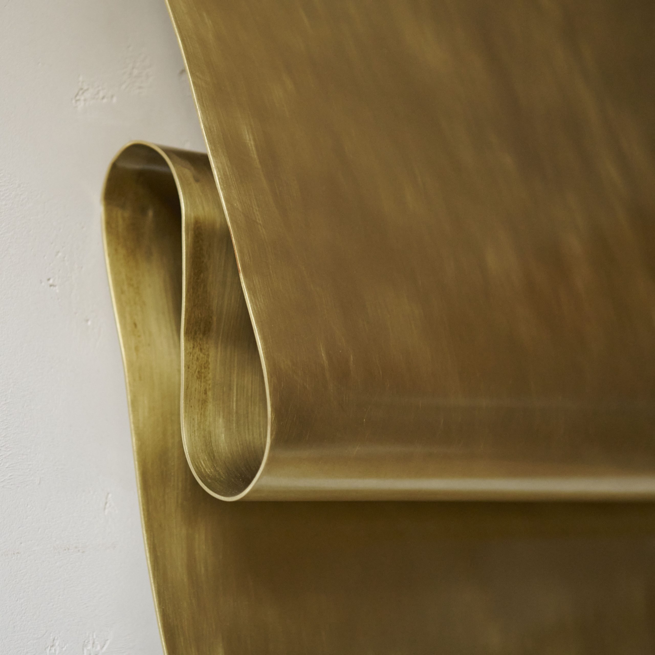 Esta escultura, elaborada en latón bruñido y lacado, presenta una superficie con textura y un brillo cálido. La forma abstracta de la escultura permite una interpretación libre por parte del observador, quien puede encontrar en ella diferentes significados y emociones. Su diseño dinámico y fluido crea una sensación de movimiento y energía.