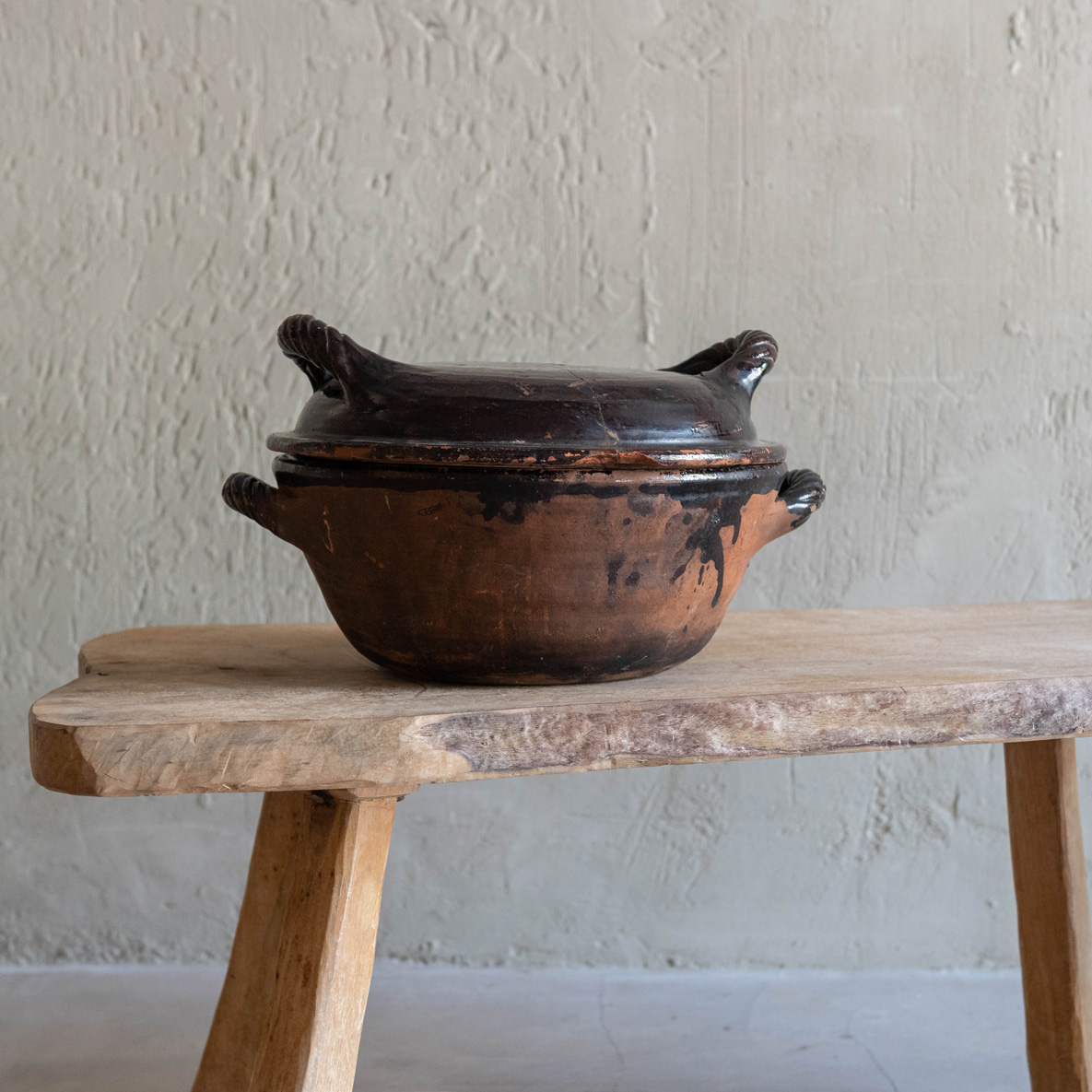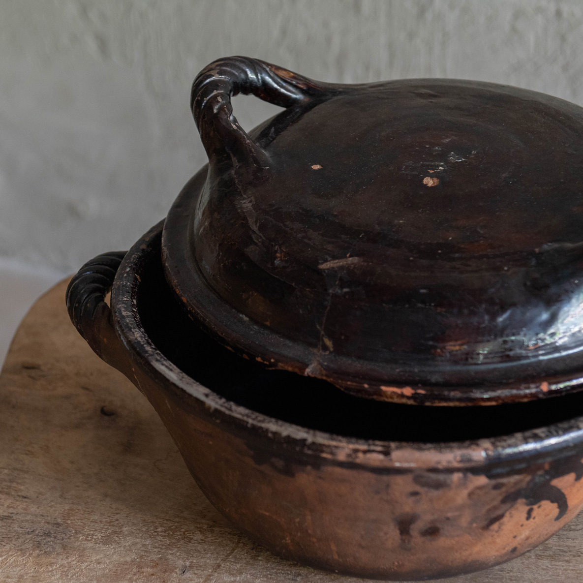 Esta fuente de horno de leña del siglo XVIII de Hungría es una verdadera joya de la alfarería tradicional. Su forma redonda y robusta revela su propósito funcional, pero es su apariencia envejecida y su pátina oscura la convierte en una pieza cargada de historia y carácter. El barro cocido, con su acabado en tonos oscuros y profundos, habla de muchas décadas de uso y cuidado. Las asas entrelazadas, gruesas y simétricas, no solo son prácticas, sino que también aportan una elegancia rústica que resalta el trabajo artesanal. Las grietas visibles muestran las tradiciones pasadas de generación en generación.