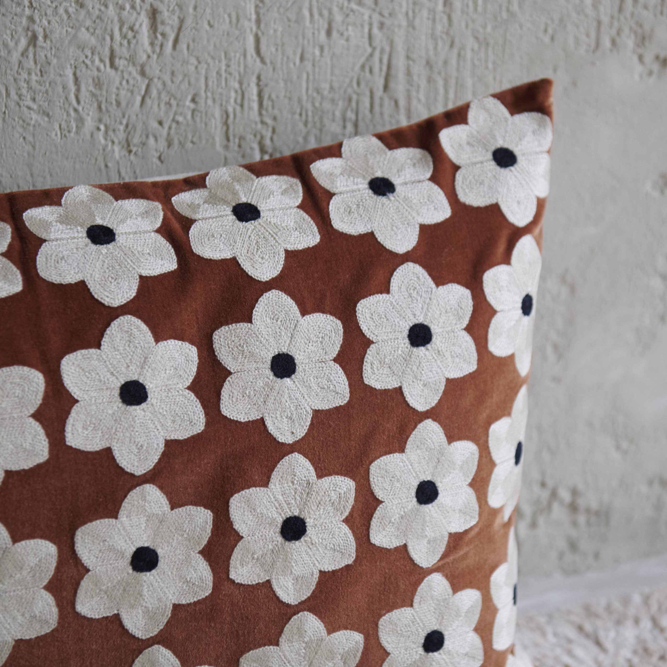 Funda cojín flores óxido. Con un acabado en terciopelo de algodón en un vibrante color óxido con bonitas flores bordadas y trasera en chambray, tela muy duradera de dos colores hecha de hilos de algodón. Una pieza que aporta frescura y color.