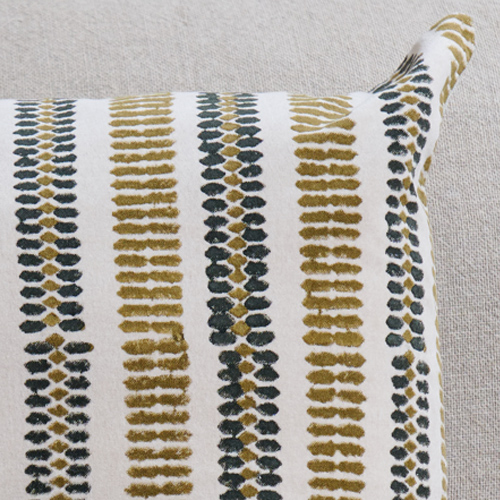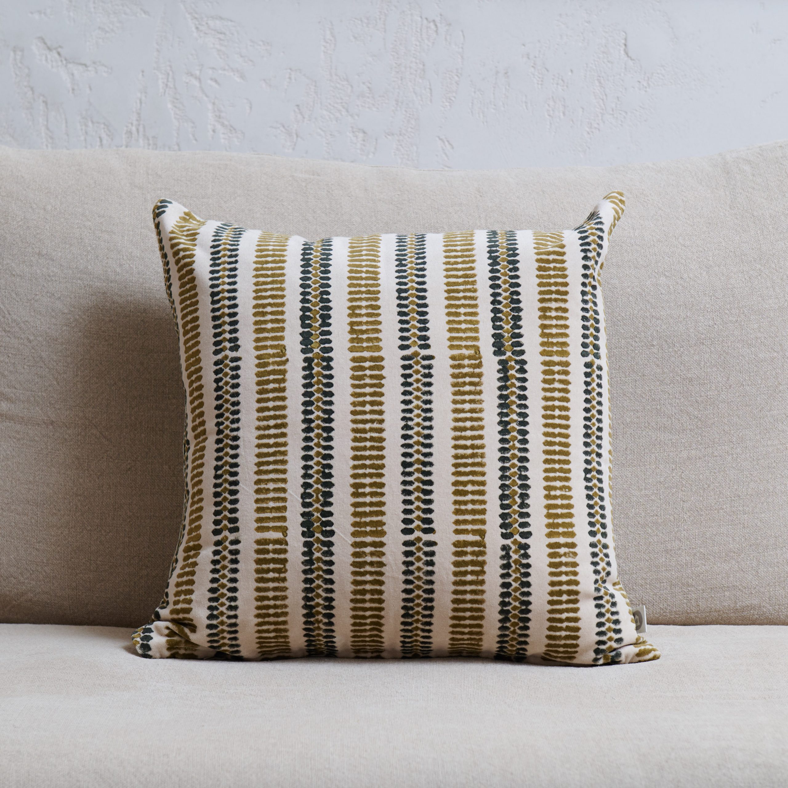 Funda de cojín blanco roto y pistacho. Funda de cojín de terciopelo de algodón elaborada a mano, en blanco roto y motivos verde pistacho y verde oscuro. Su original diseño lleva de vida cualquier espacio.