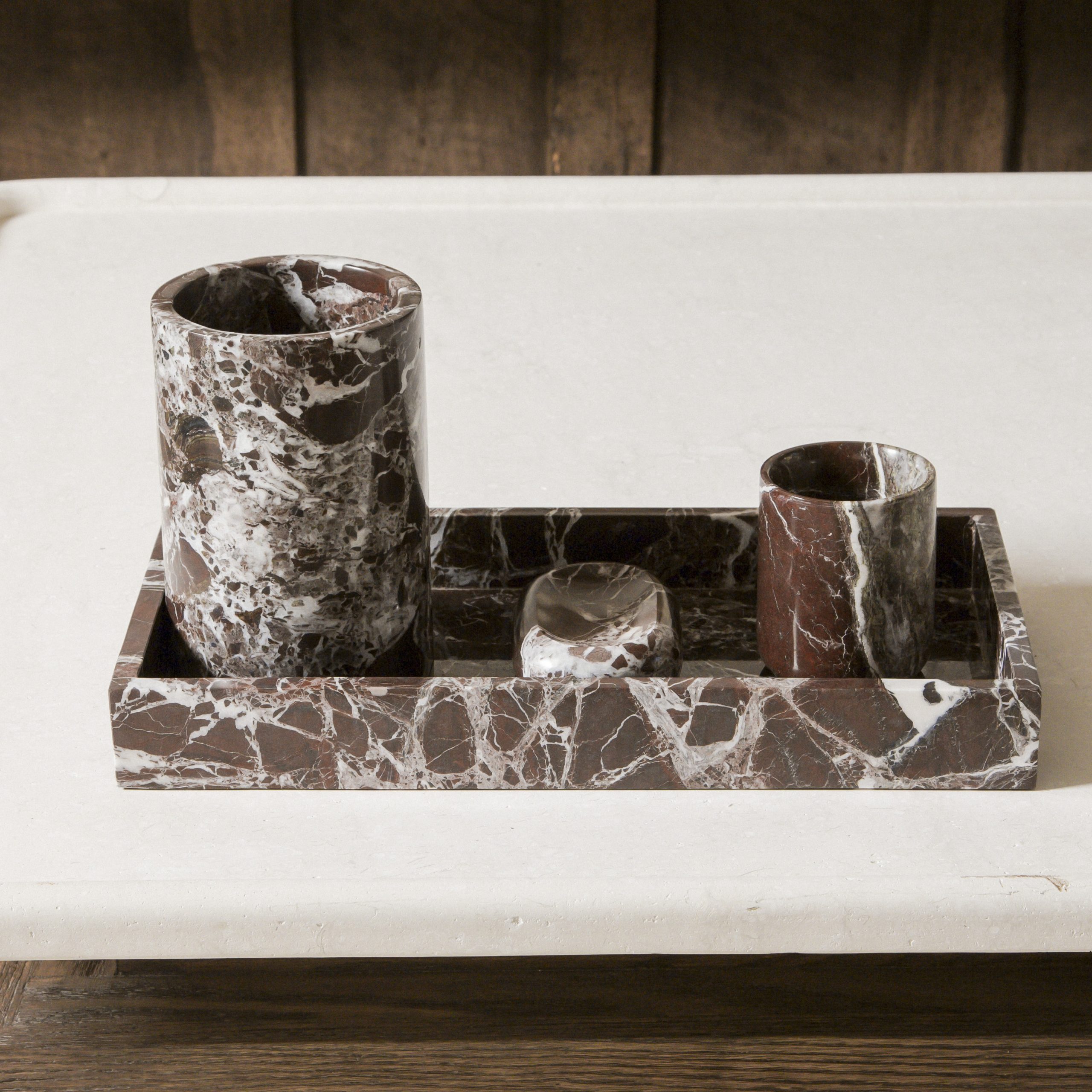 Jabonera de mármol burdeos. Es el complemento ideal para un cuarto de baño debido a la elegancia y durabilidad de su acabado en mármol natural. Sus diversos colores otorgan al espacio un toque exclusivo.