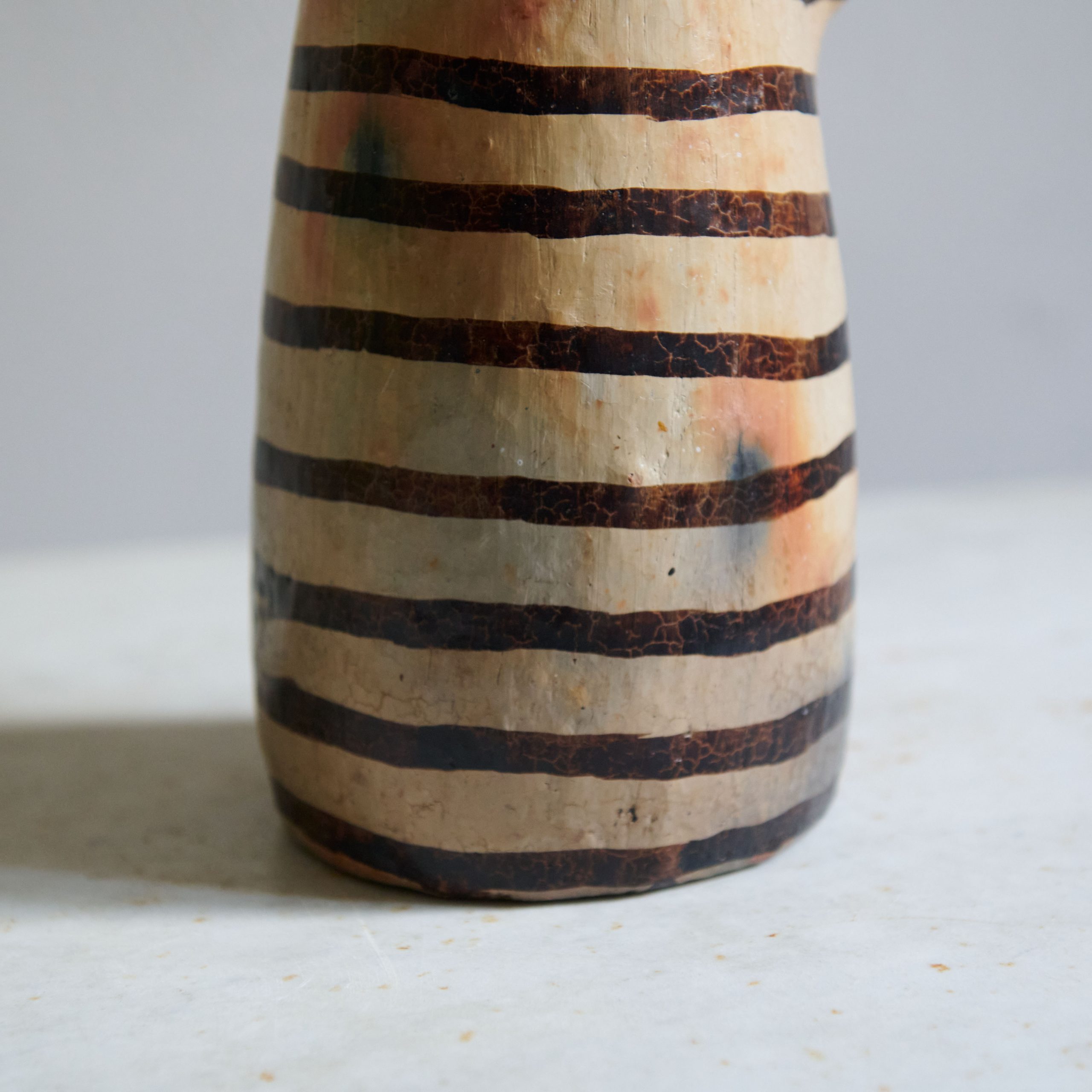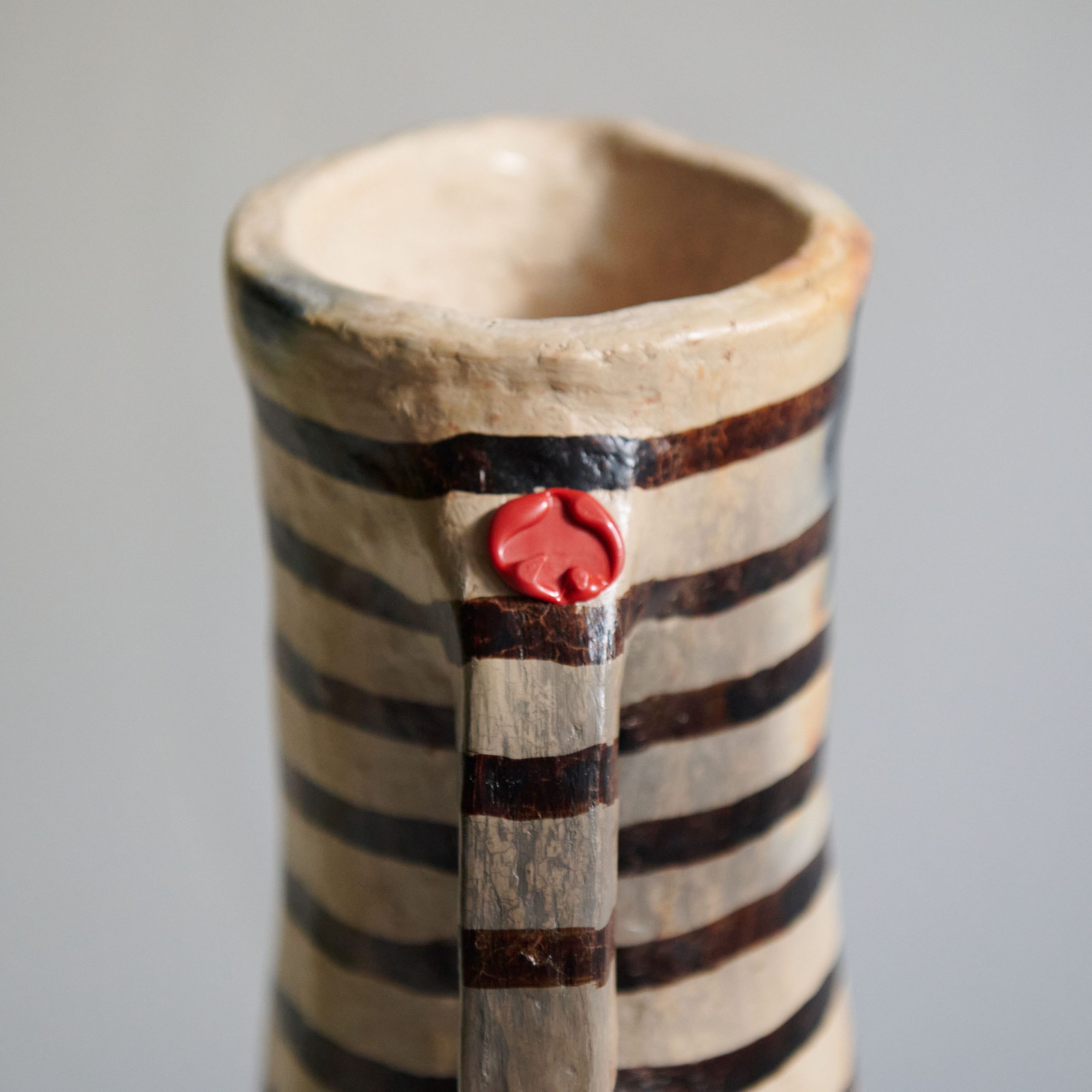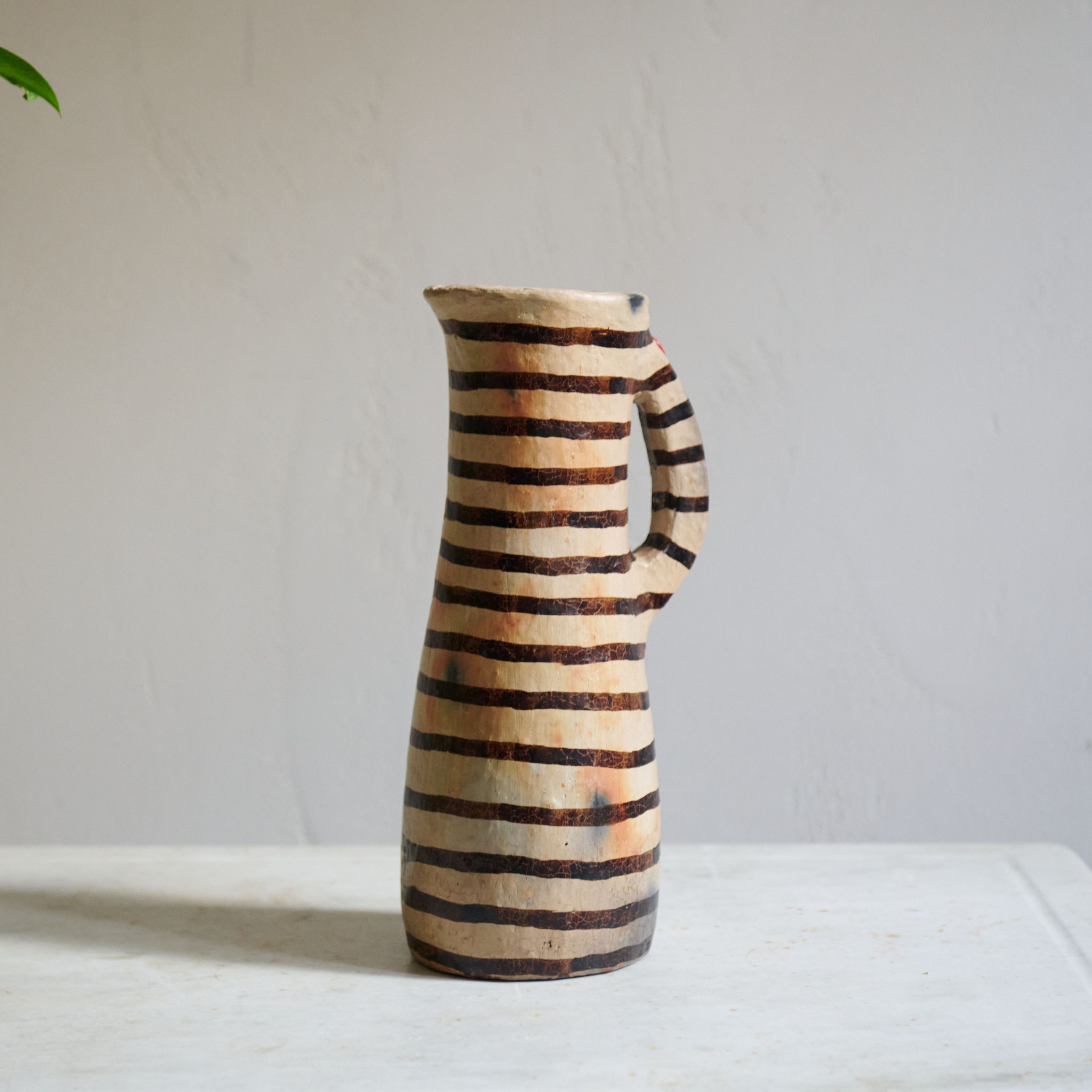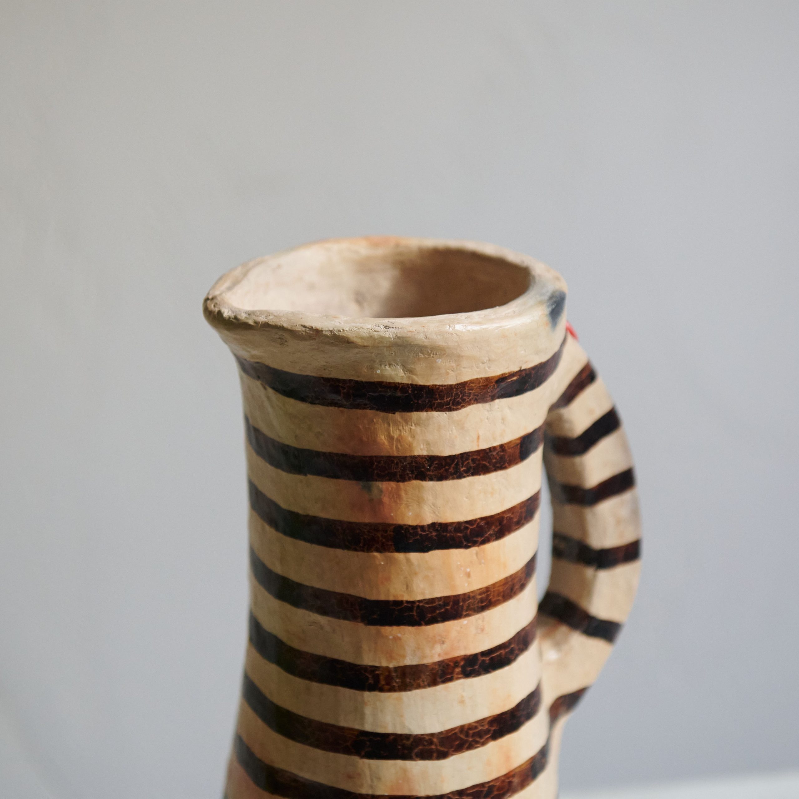 Jarra de cerámica tono arena con rayas. De origen tunecino y elaborado a mano basándose en su patrimonio y su artesanía tradicional, es una pieza muy especial que encaja en cualquier espacio. Una jarra diferente y original, esbelta y elegante.