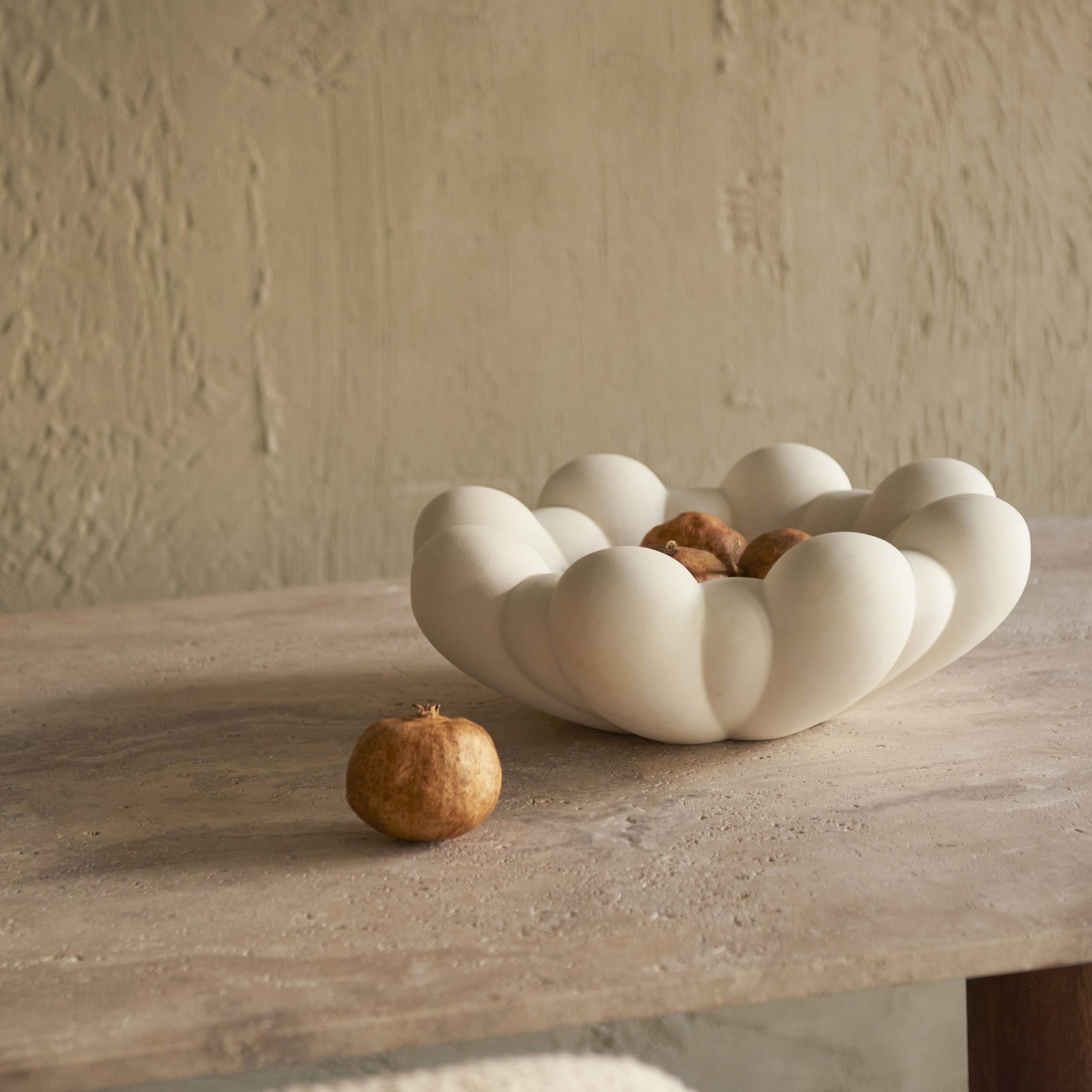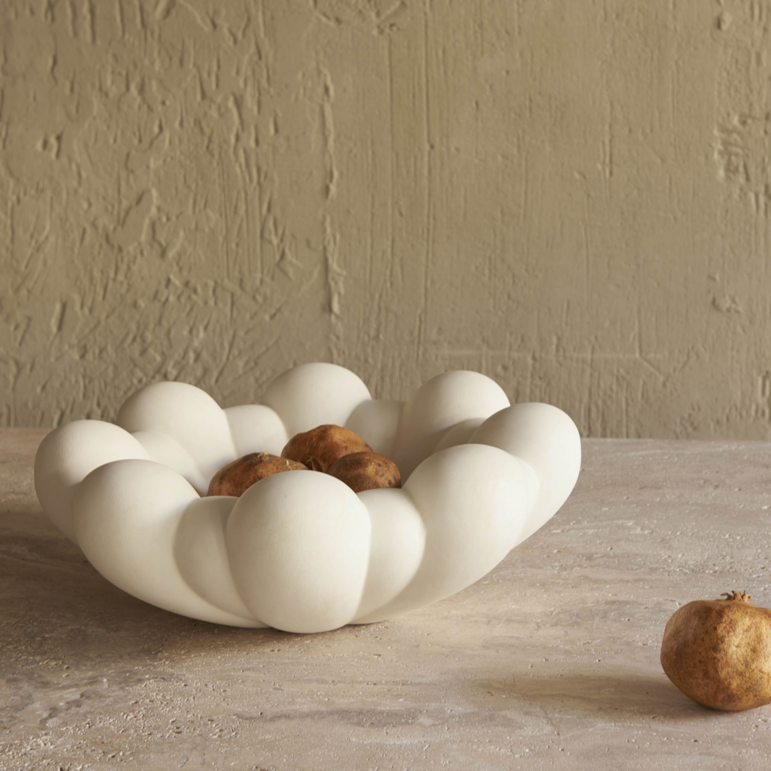 Jarrón blanco hueso de cerámica y hormigón diseño floral. De expresivo diseño y contundente tamaño, esta pieza, elegantemente esculpida, se caracteriza por una inspiración floral en la que las hojas se desvanecen entre sí, creando un bonito juego de relieves y texturas.