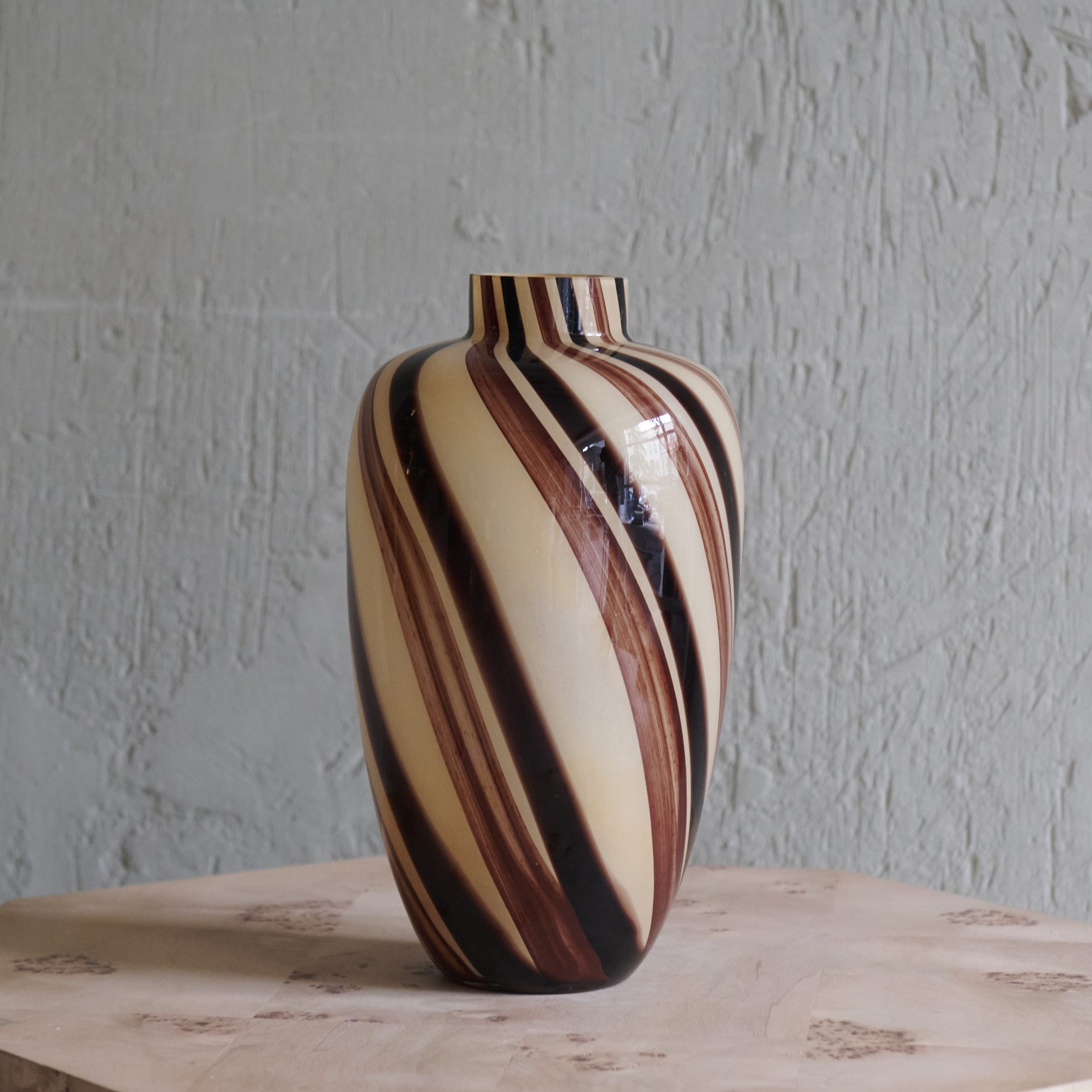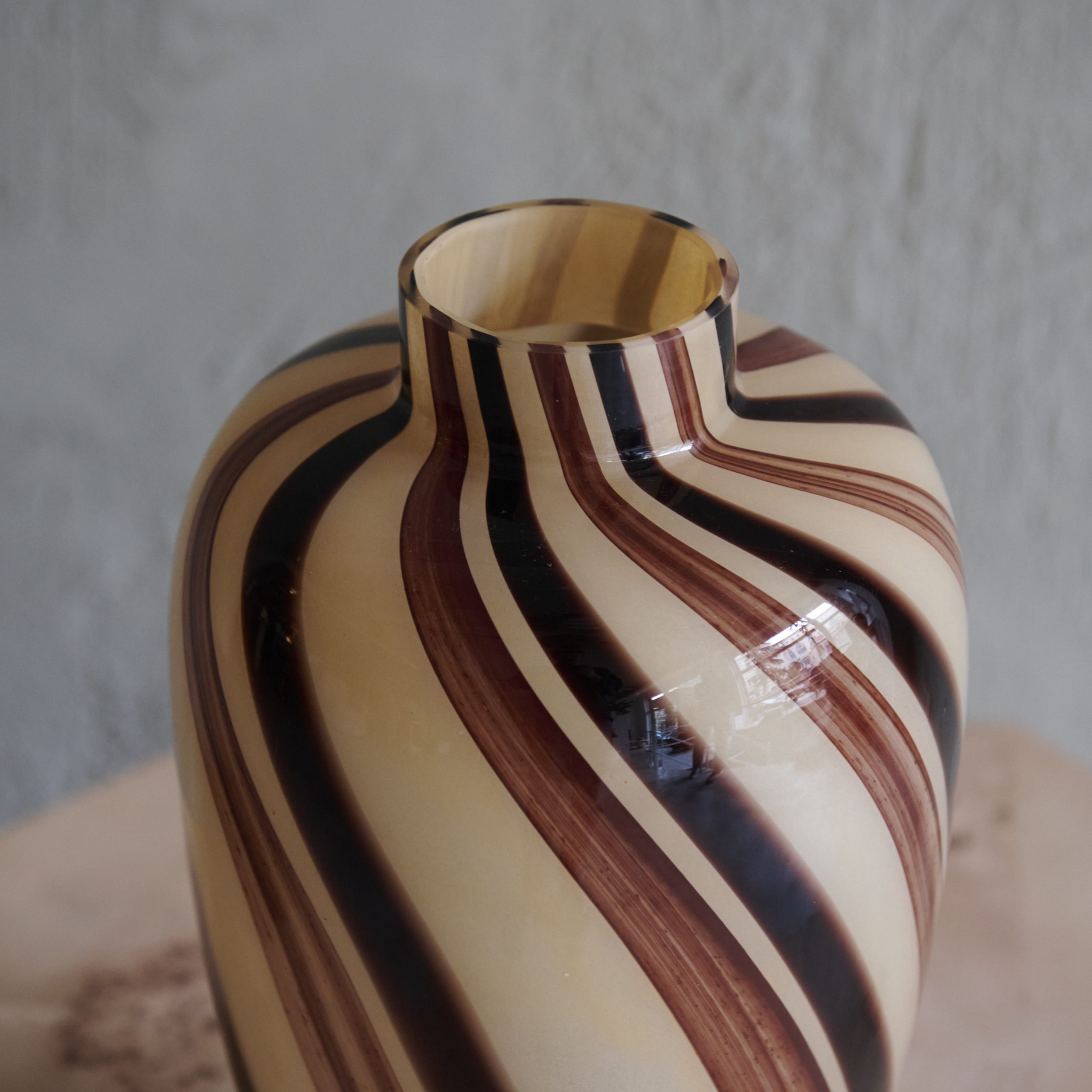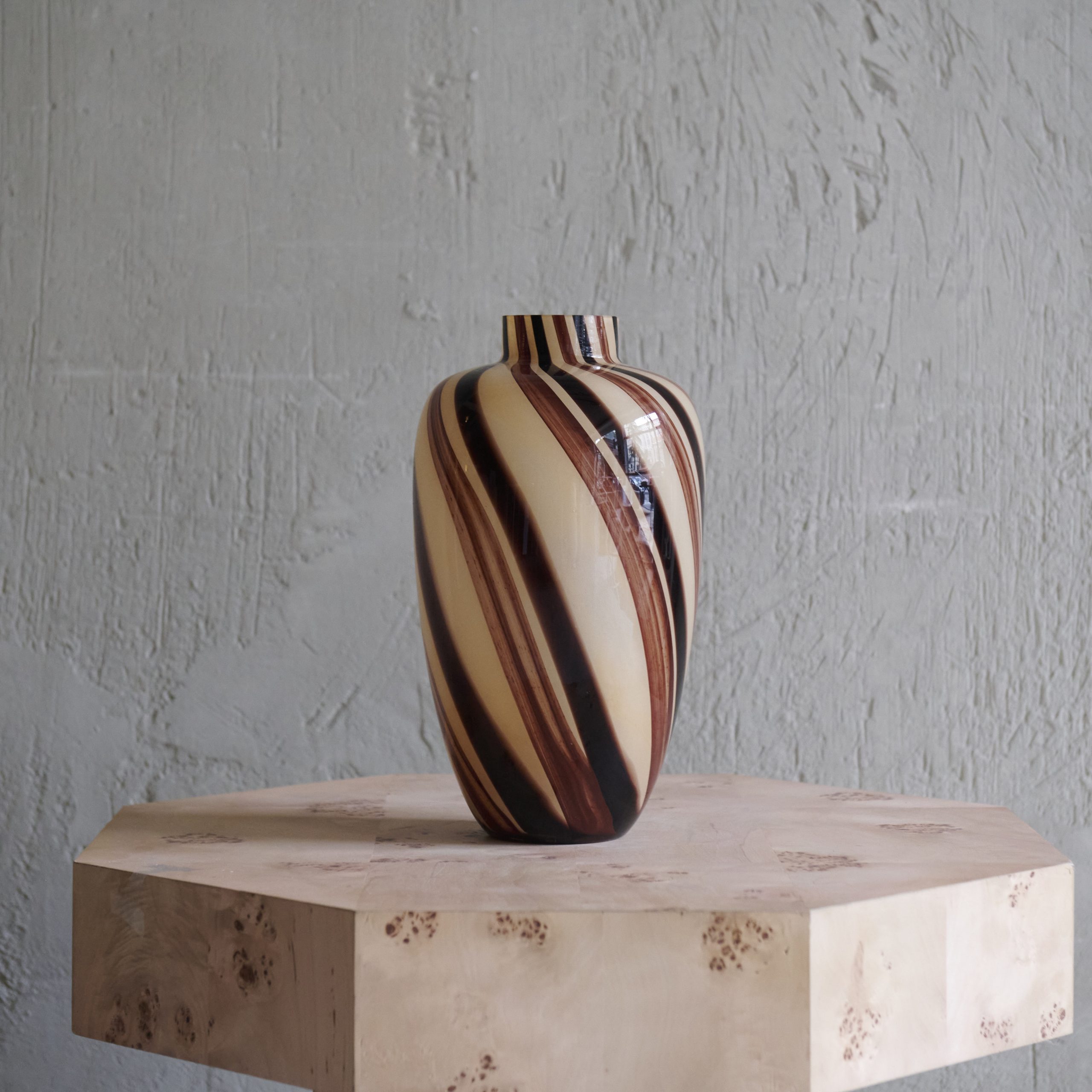 Jarrón de cristal en colores café. Un atractivo objeto decorativo de cristal decorado con un original dibujo en espiral, cuyo acabado se inspira en un famoso postre italiano a base de vainilla y café. Una pieza diferente y con mucho encanto que pone la nota de color y estilo en cualquier ambiente. Cada pieza es única y pueden variar los patrones.