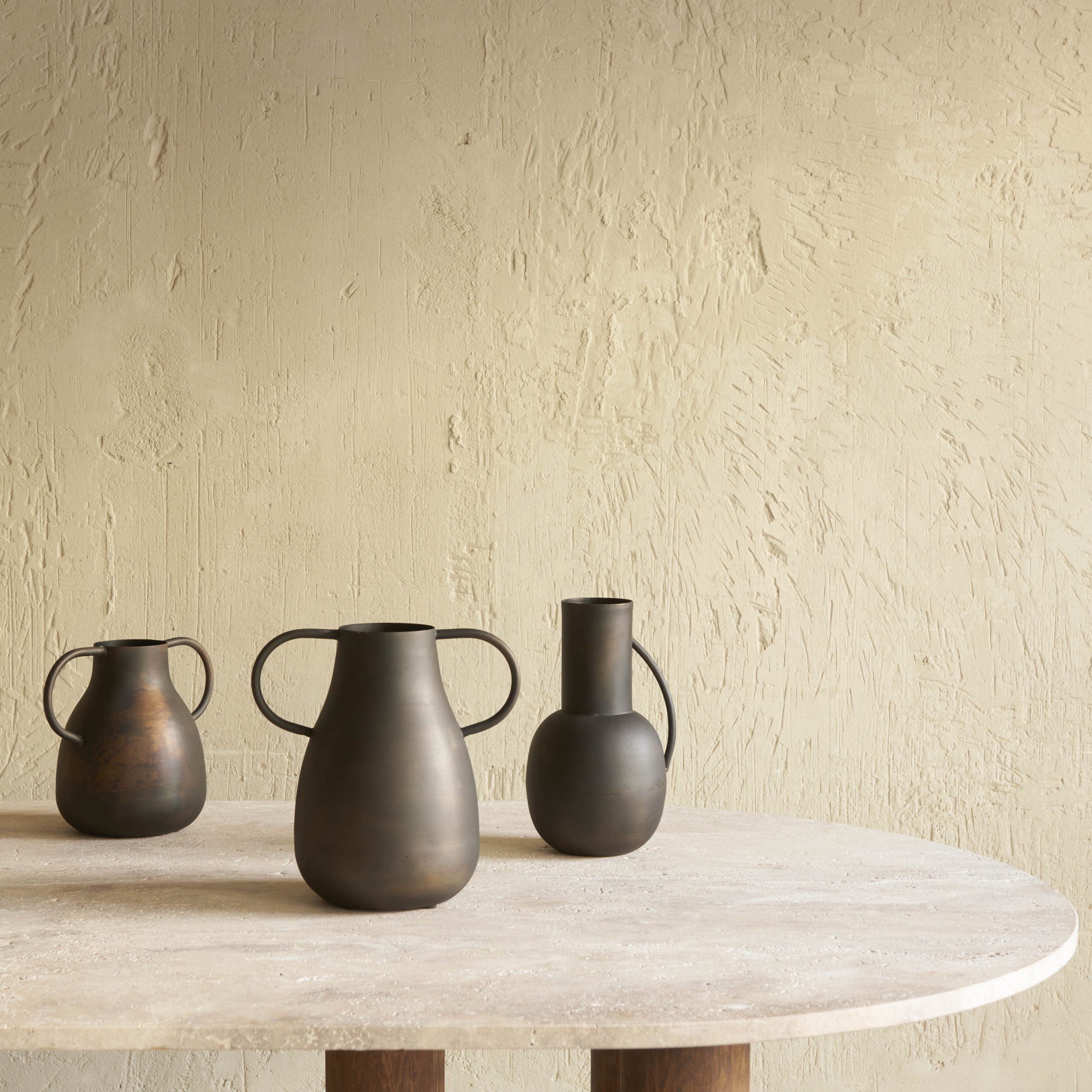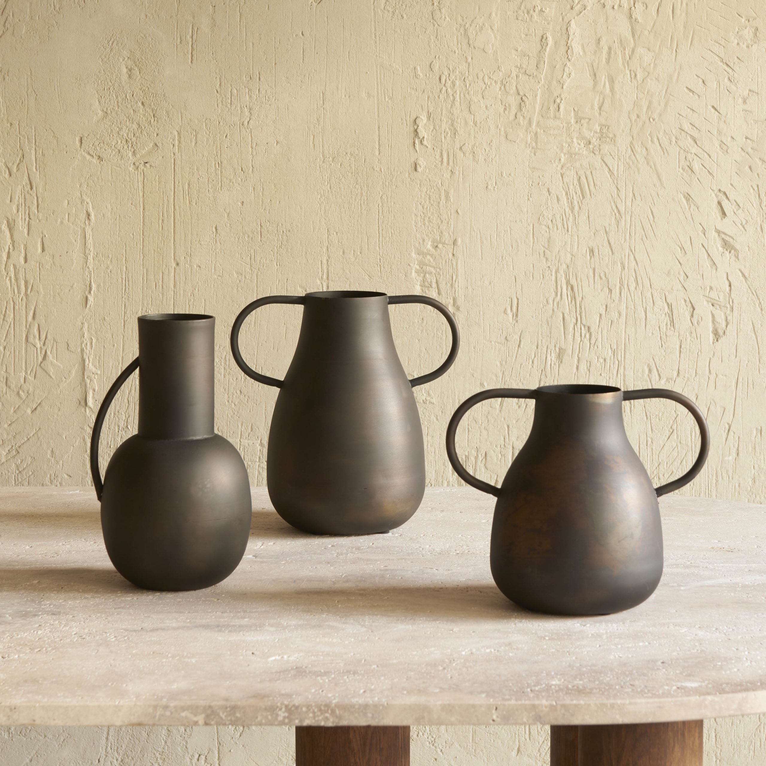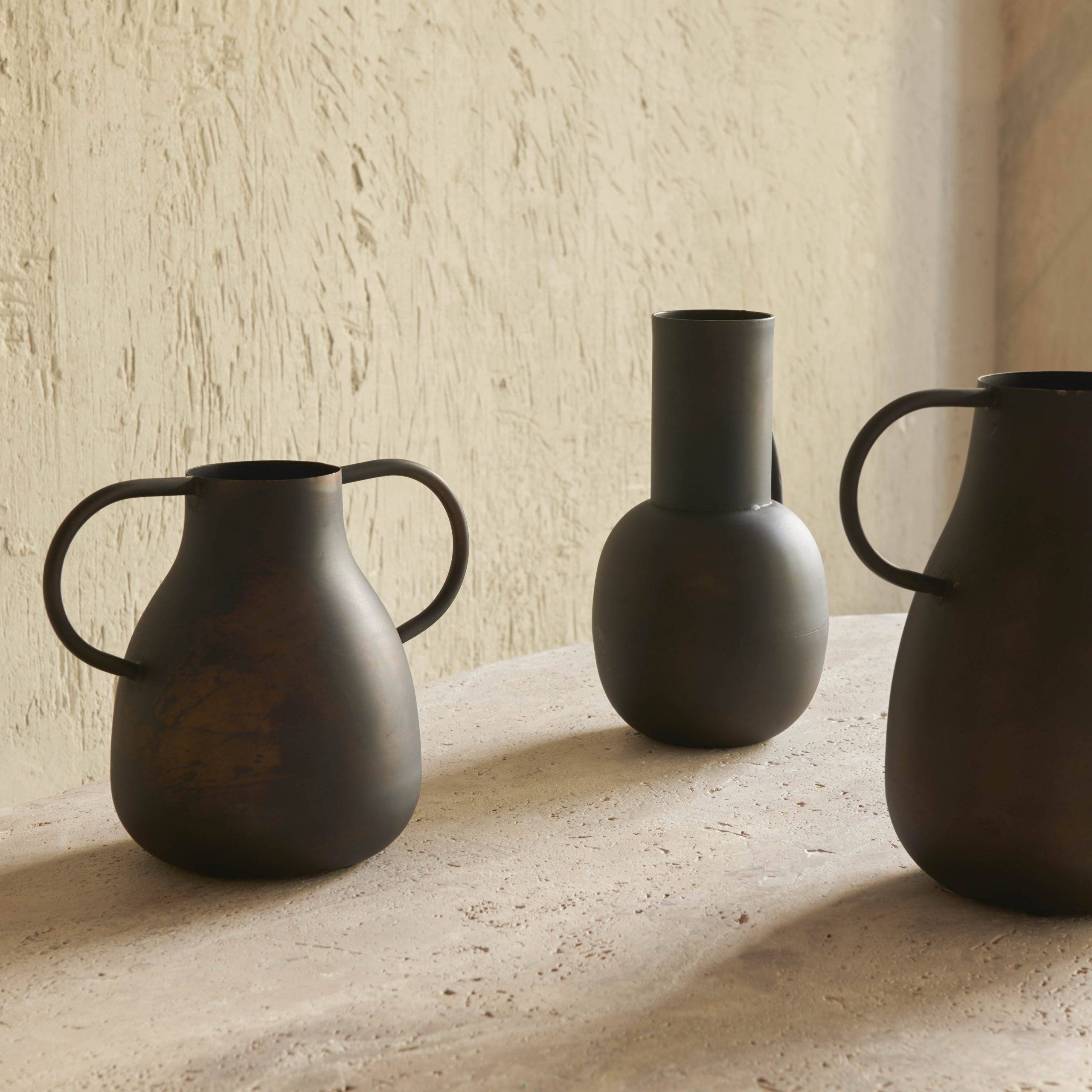 Jarrón de hierro envejecido con asas L. Sencillo y discreto jarrón de hierro con acabado en un original cobre envejecido.
