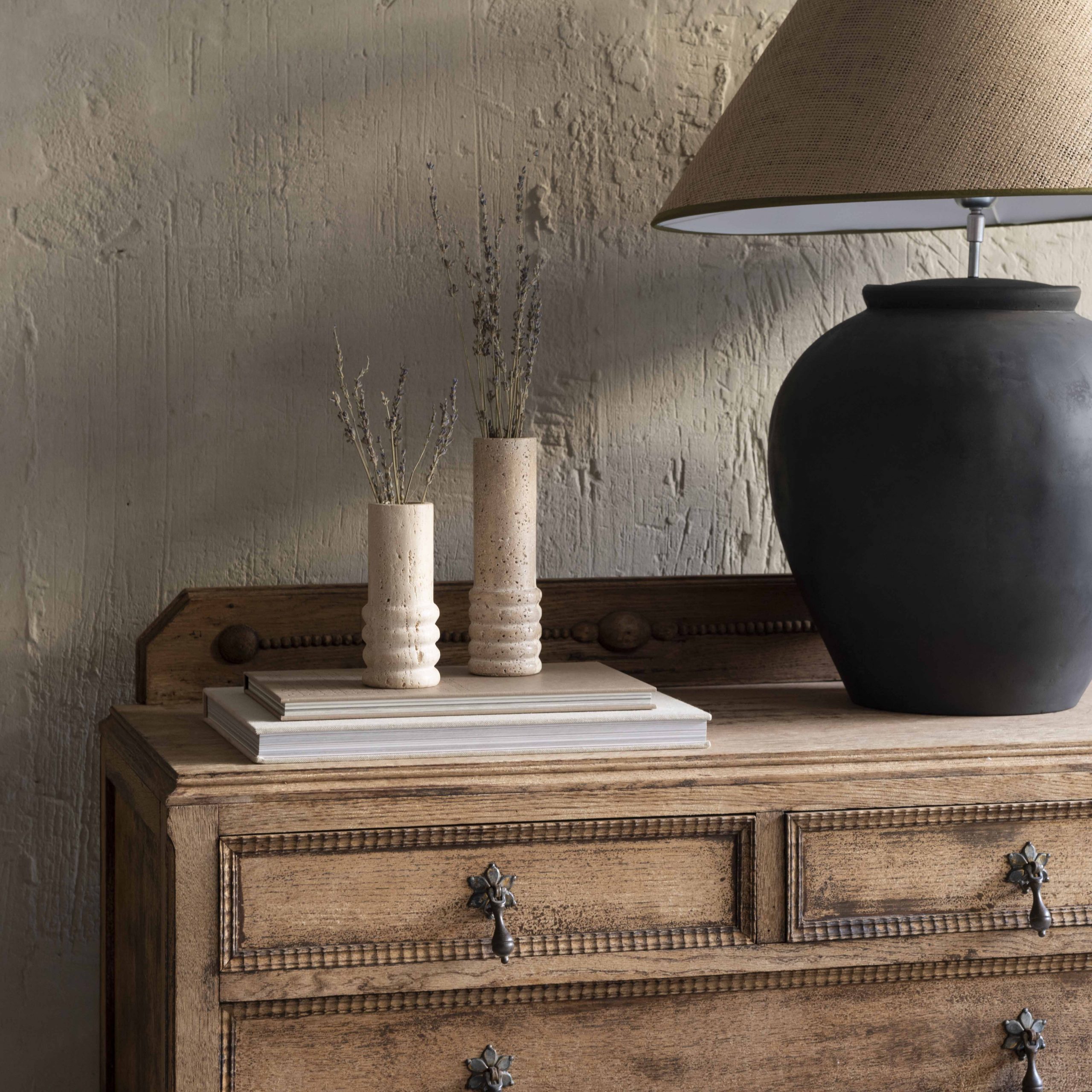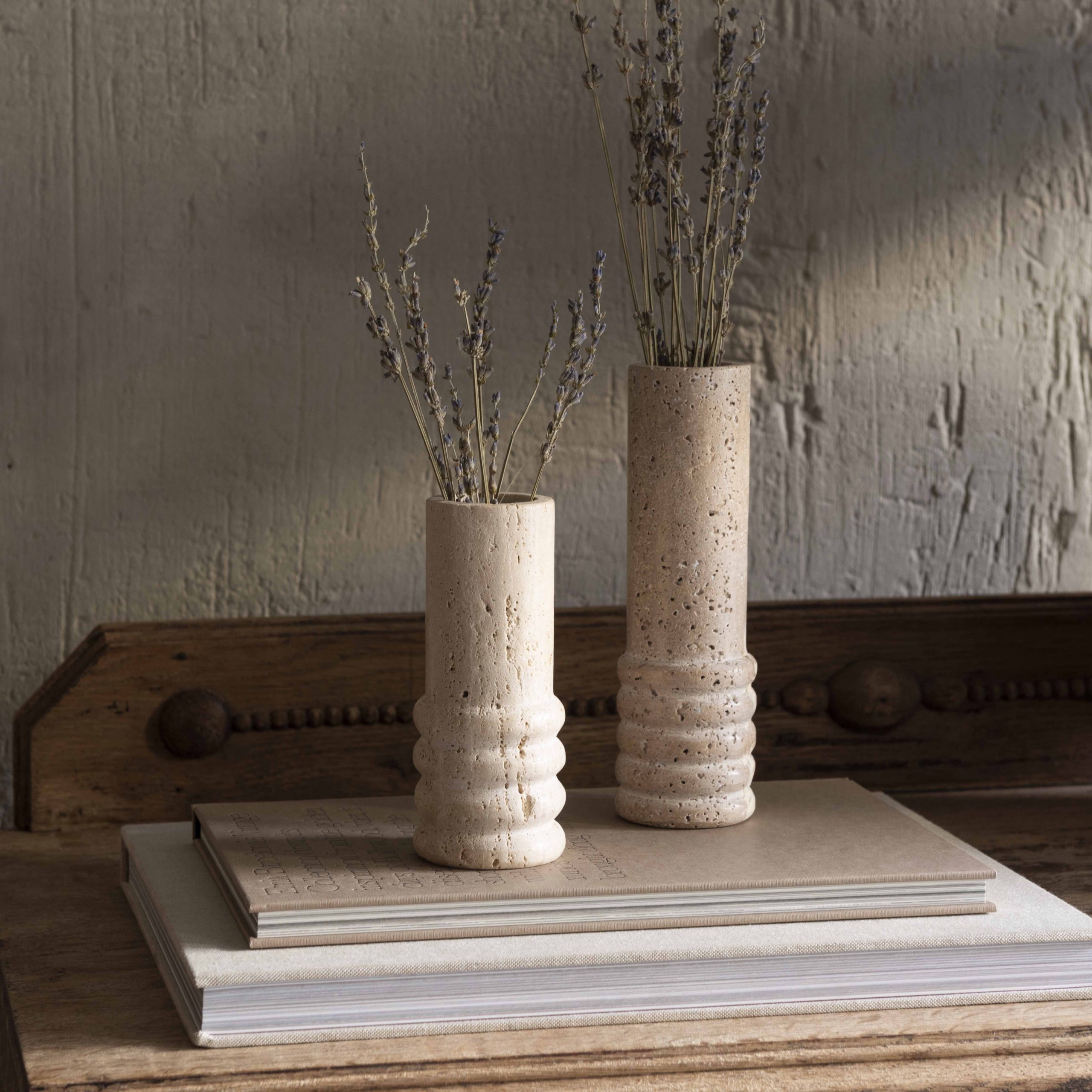 Jarrón de piedra caliza travertino L. Pequeño y elegante jarrón de travertino, perfecto para flores secas o sencillamente como elemento decorativo. Al estar fabricado con materiales naturales, cada pieza será exclusiva con tonalidades y texturas propias.