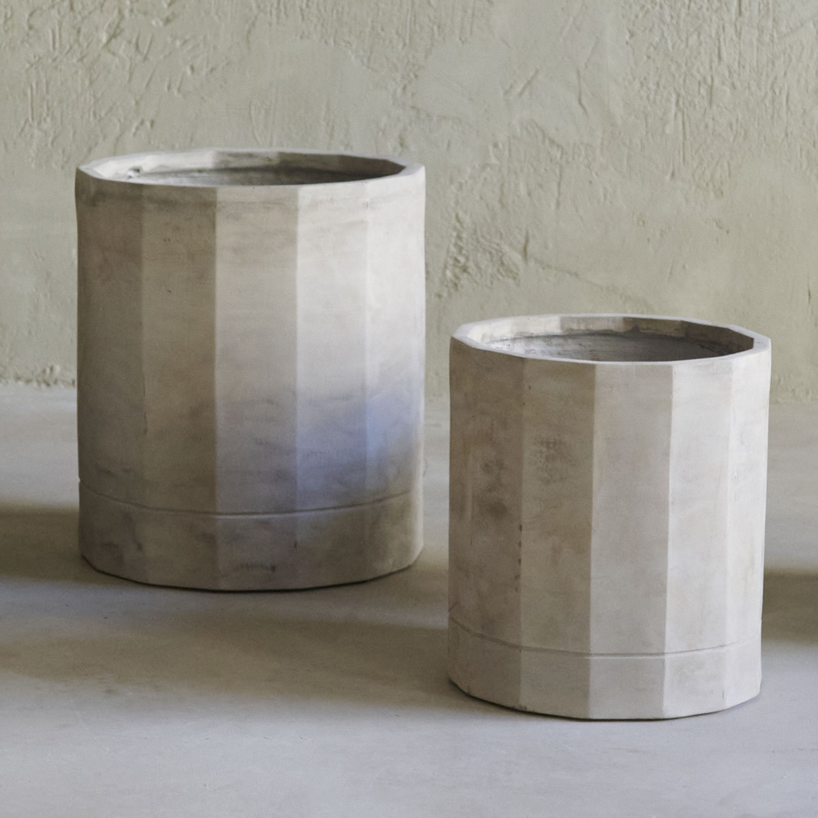 Macetero acanalado de cemento S. Maceta fabricada en cemento acabado gris, una pieza perfecta para crear un ambiente contemporáneo en terrazas y jardines. Su forma geométrica aporta un estilo neutro que se adapta a cualquier espacio.