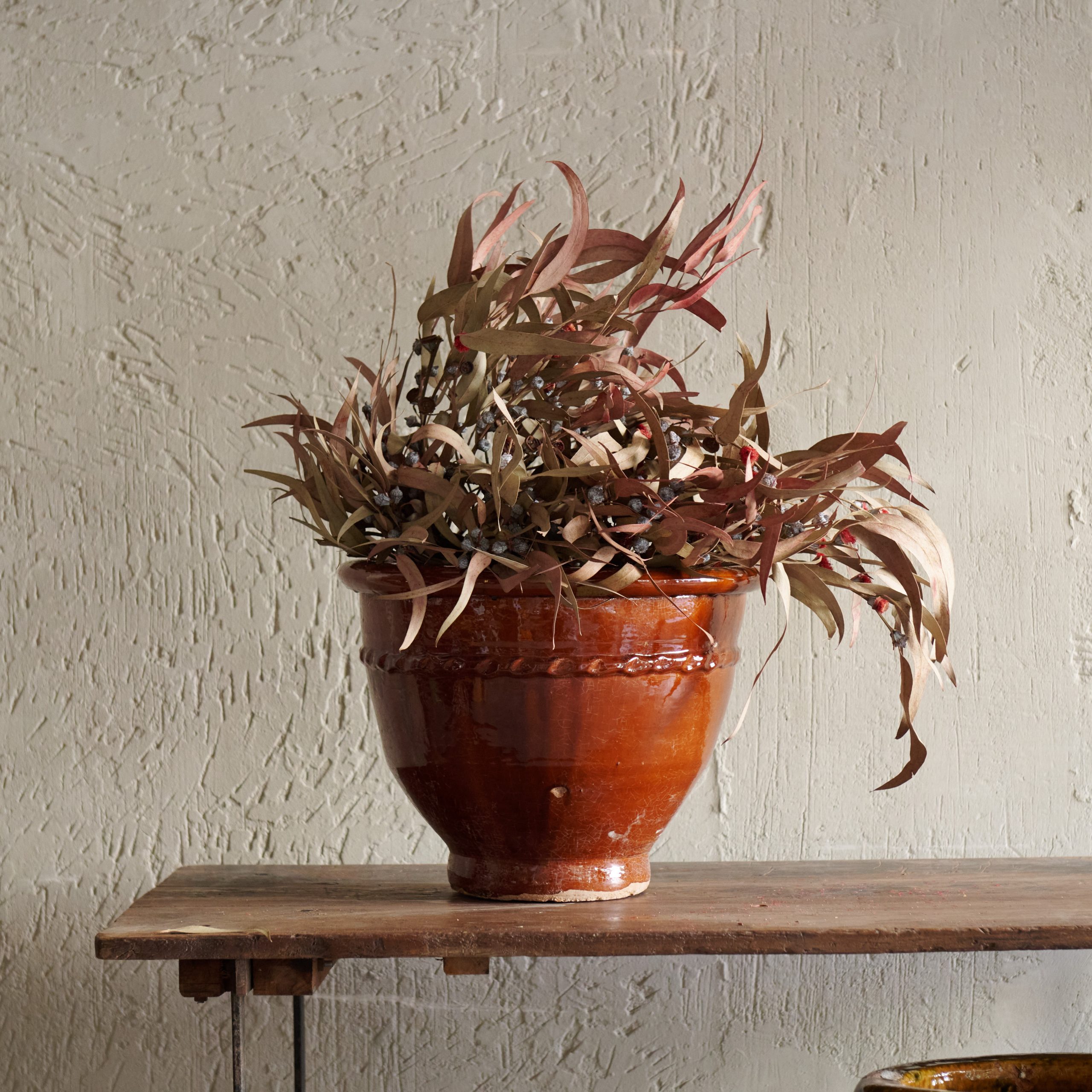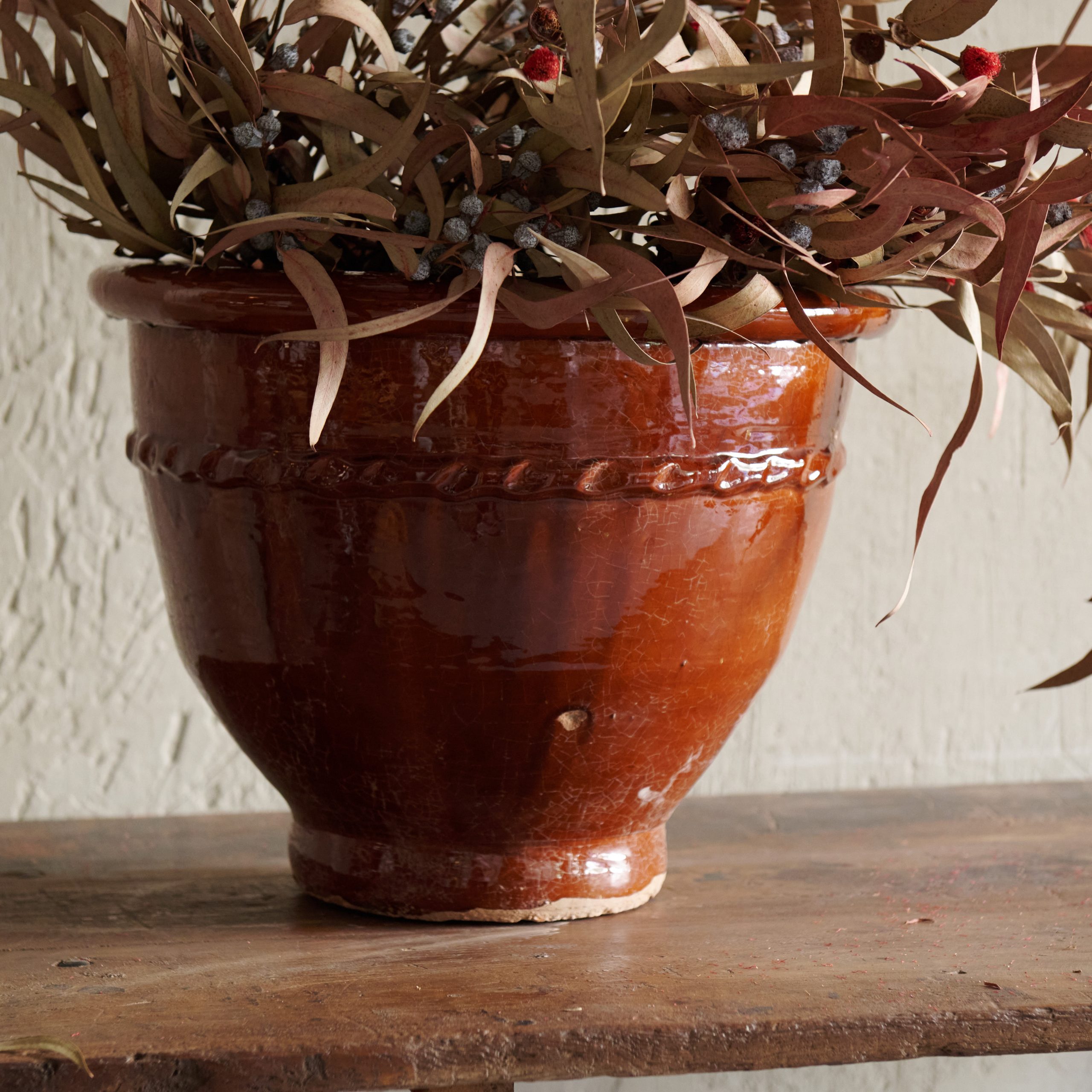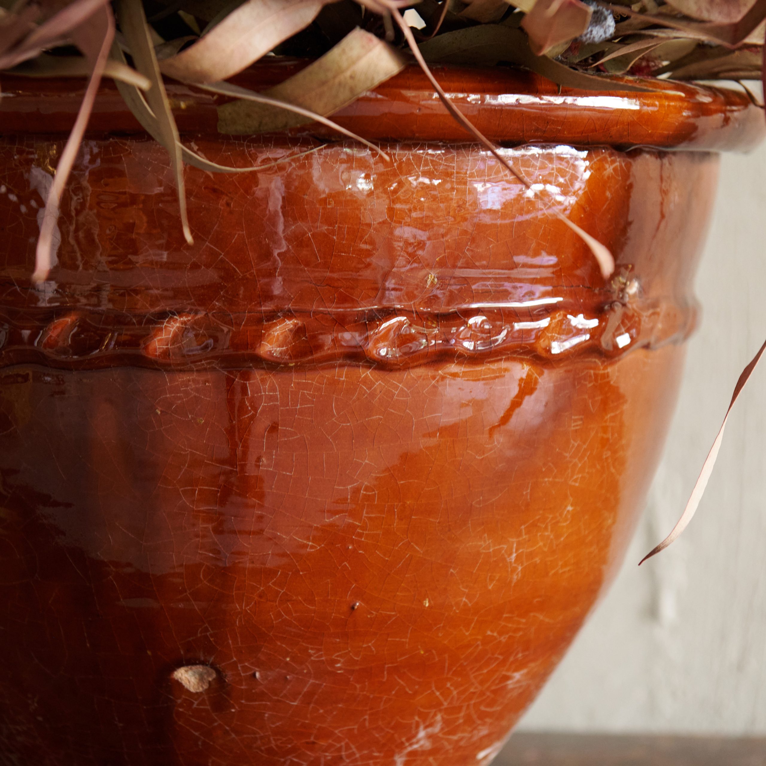 Macetero artesanal de cerámica esmaltado en teja M procedente de Marruecos. Una pieza que refleja la rica tradición y el arte marroquí elaborada a mano por artesanos locales. Combina la funcionalidad con la belleza estética. La cerámica se moldea cuidadosamente con estas bonitas formas redondeadas y su acabado esmaltado en un cálido tono teja resalta su carácter terracota, aportando una sensación de rusticidad y sofisticación al mismo tiempo. El esmalte le da al macetero un brillo sutil y una textura suave, al tiempo que protege la cerámica y realza su color profundo y terroso.