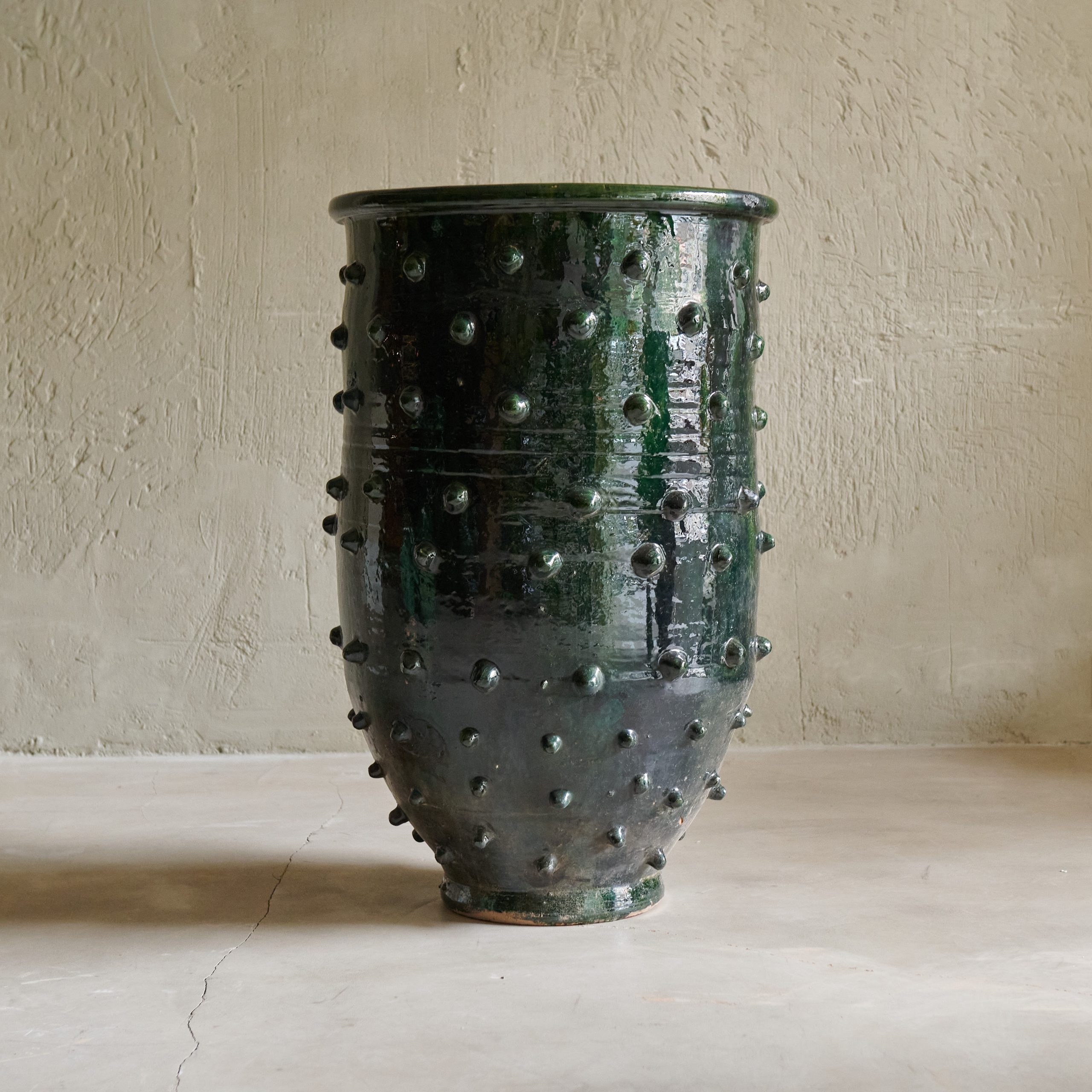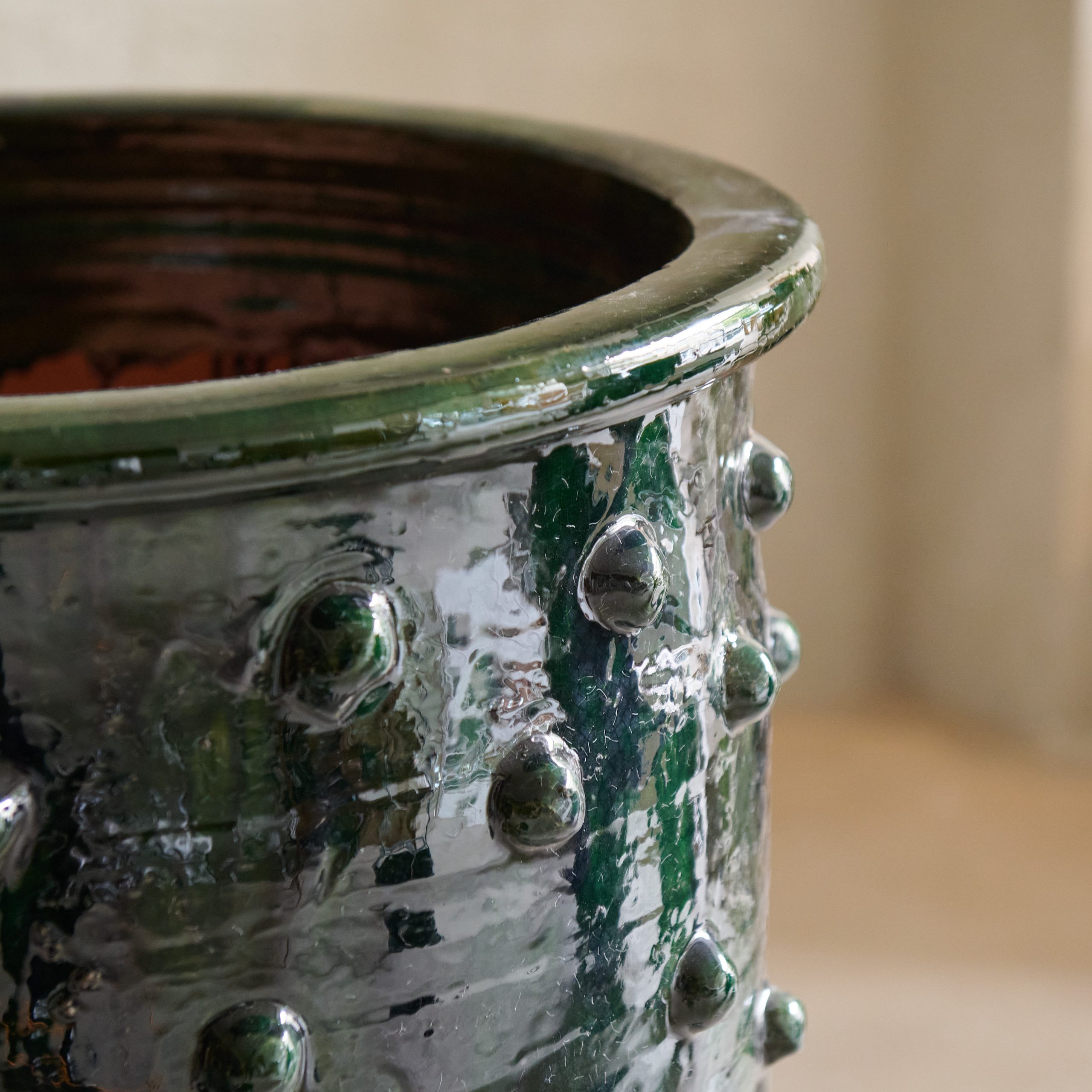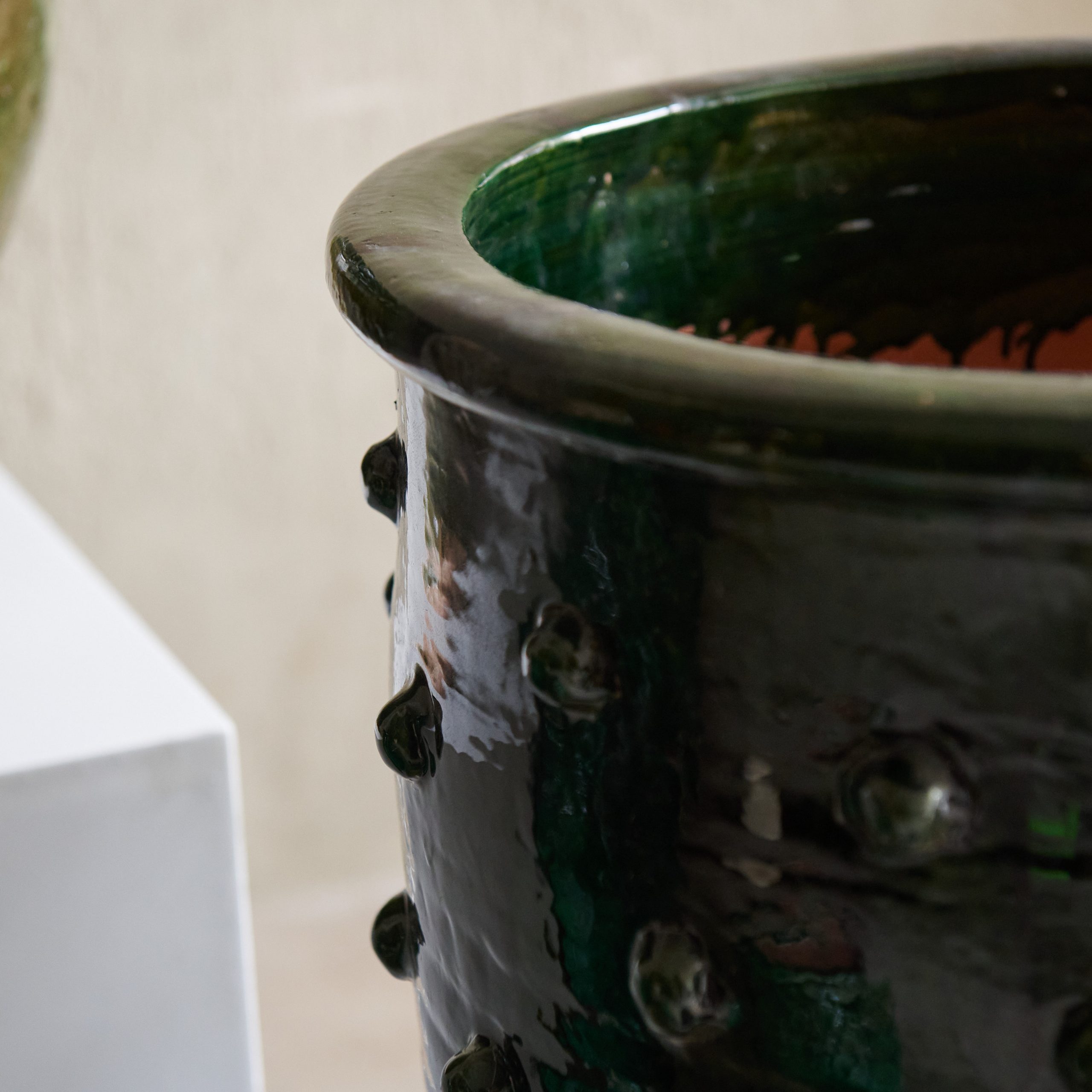 Macetero artesanal con diseño de círculos en relieve. Procedente de Marruecos, es una espectacular pieza, completamente artesanal, de cerámica esmaltada en verde oliva y en tamaño XL. Una pieza única y decorativa hecha a mano por artesanos locales utilizando técnicas tradicionales. Su color verde vibrante proviene de esmaltes naturales y además de su uso para contener plantas, estos maceteros sirven como elementos decorativos que añaden un toque de elegancia y autenticidad a cualquier espacio.