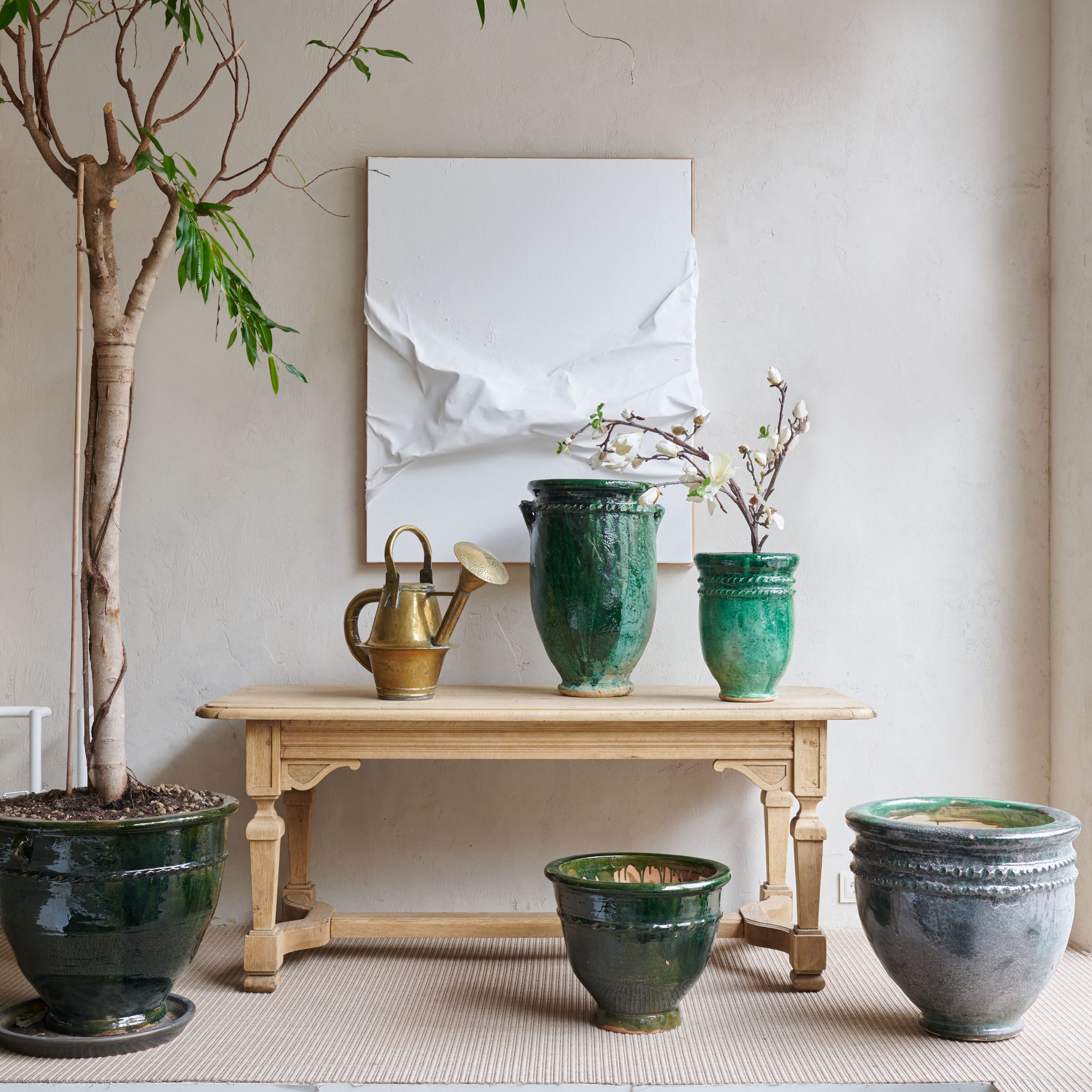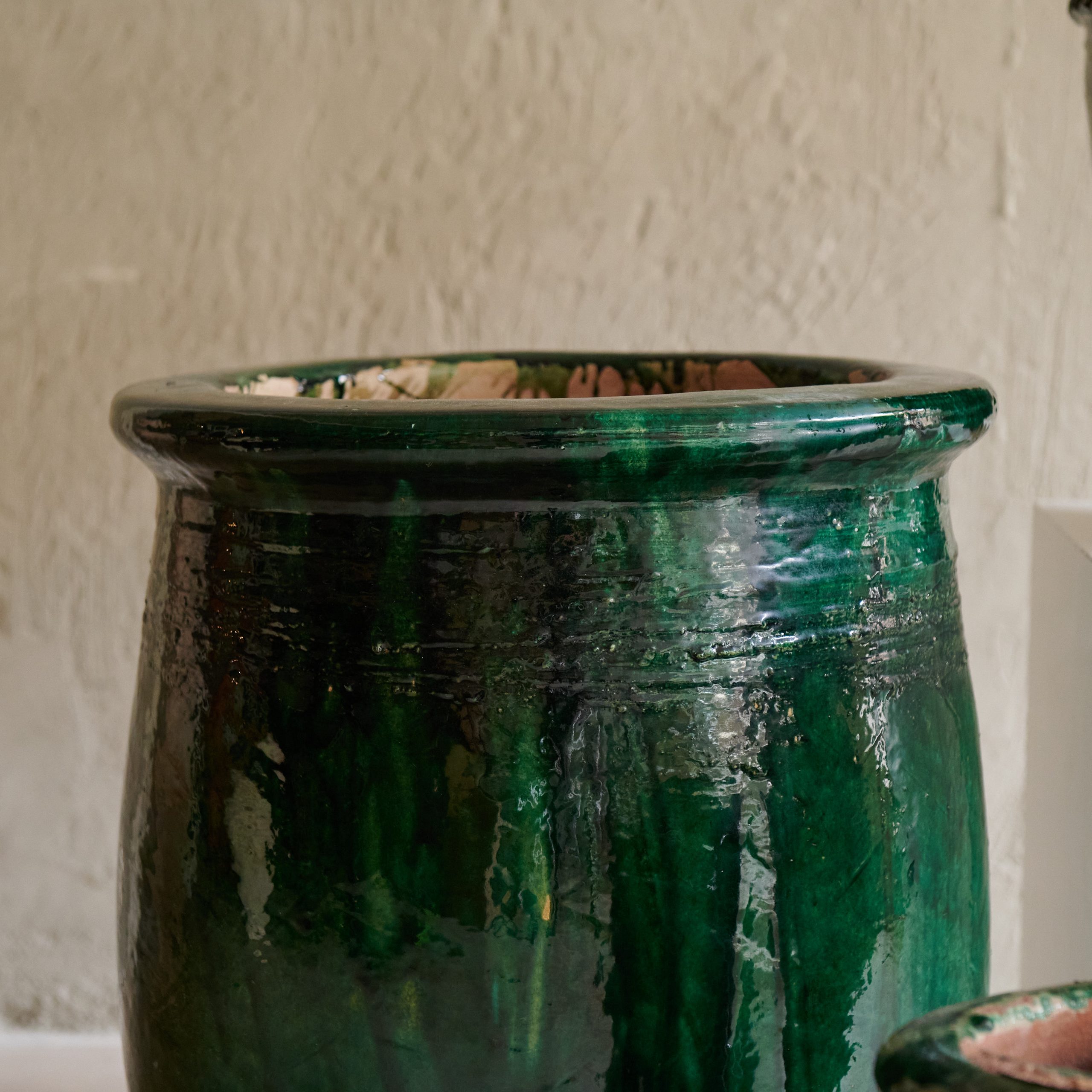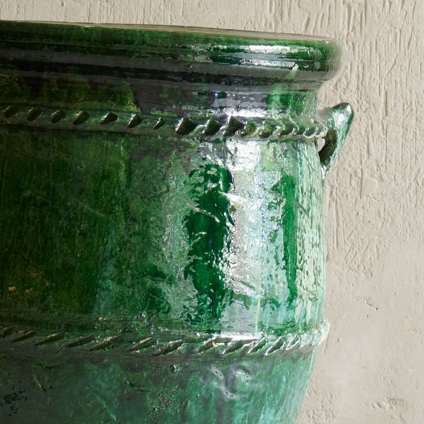 Macetero artesanal verde XL de Marruecos. Una espectacular pieza, completamente artesanal, de cerámica esmaltada en verde oliva y en imponente tamaño. Una pieza única y decorativa hecha a mano por artesanos locales utilizando técnicas tradicionales. Su diseño incluye dos bonitas cenefas en relieve y unas pequeñas asas decorativas o bien otros motivos. Perfectos para plantas grandes, árboles pequeños o simplemente como elemento decorativo, estos maceteros añaden un toque de estilo natural a cualquier espacio. Debido a su acabado completamente artesanal, las piezas varían de tamaño y de color en sus acabados.