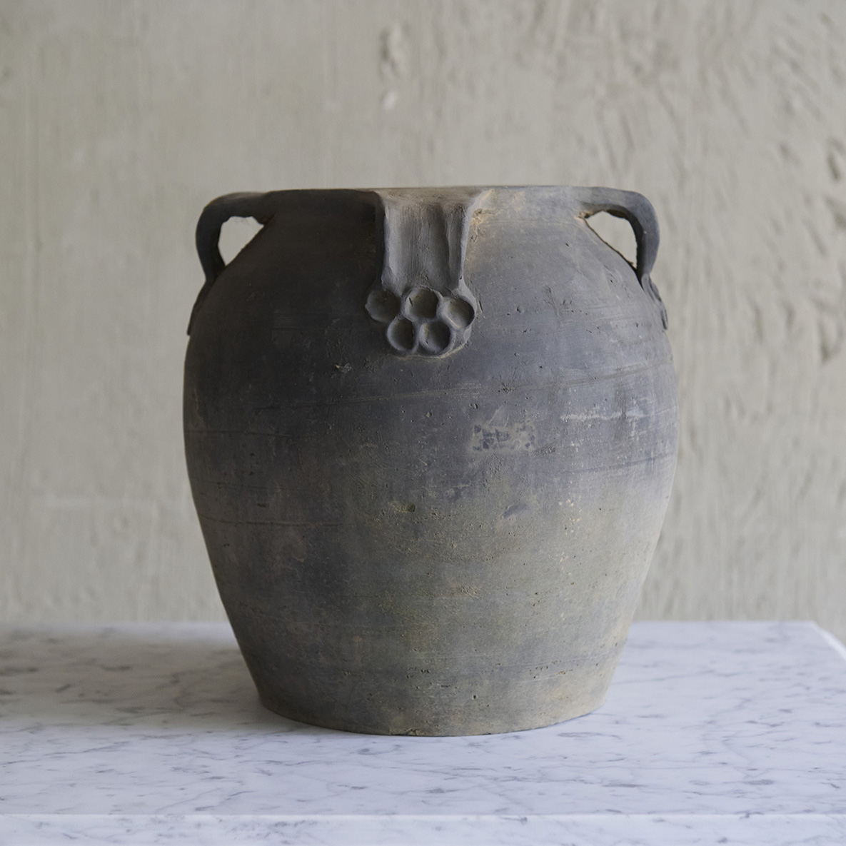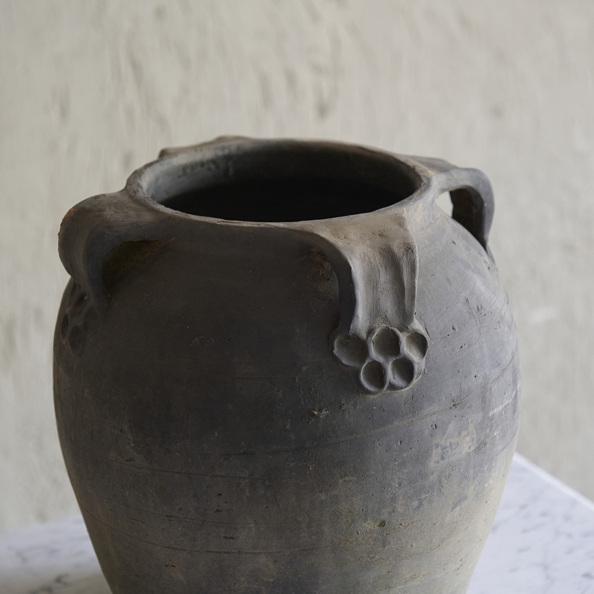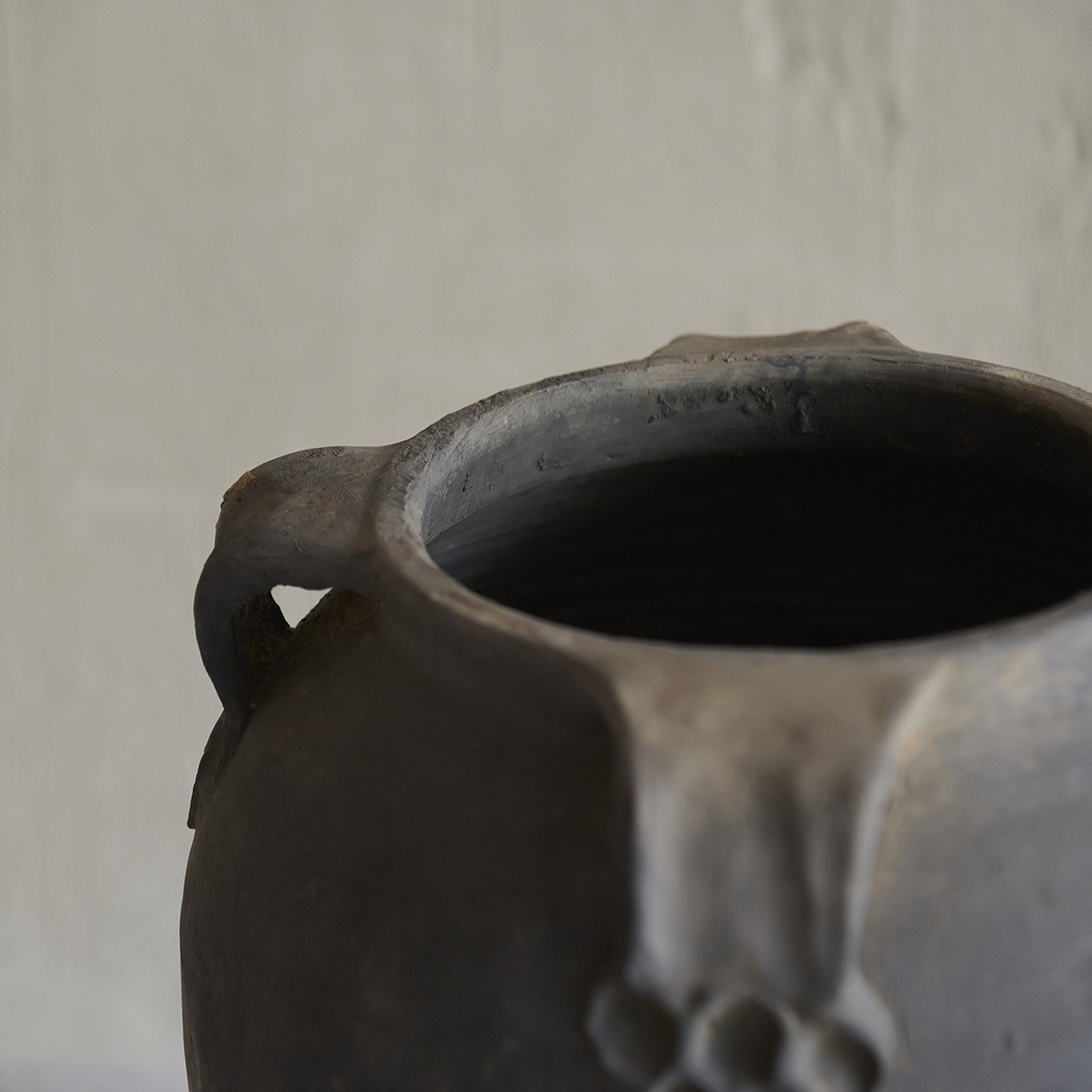 Jarrón de terracota antigua origen Shaanxi. Moldeado en torno al año 1900 presenta proporciones equilibradas y una superficie marcada por las irregularidades de la cocción de la pieza. De color gris ahumado, casi negro, es una imponente pieza que, al ser artesanal, presenta diferentes acabados.