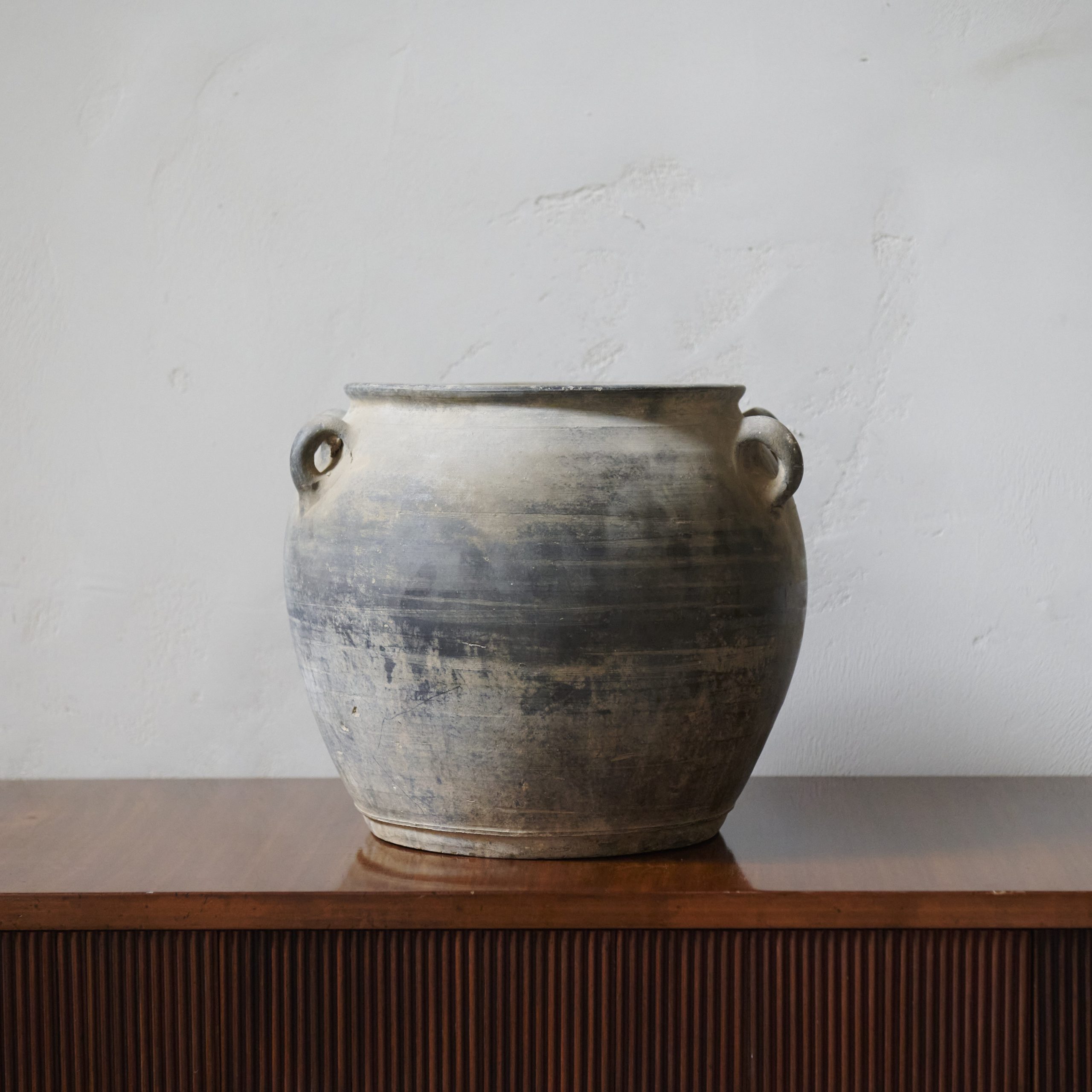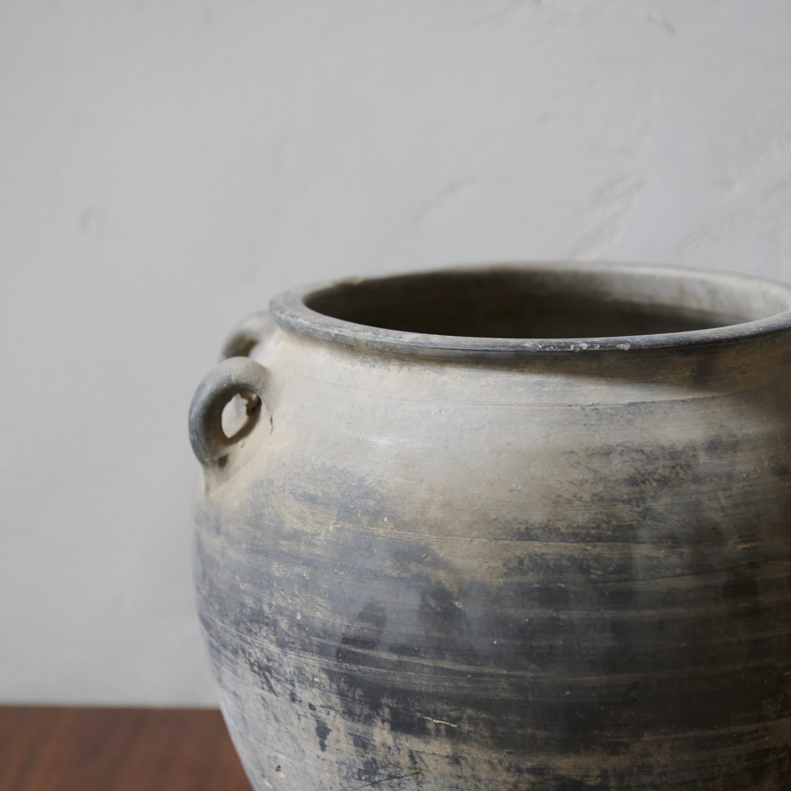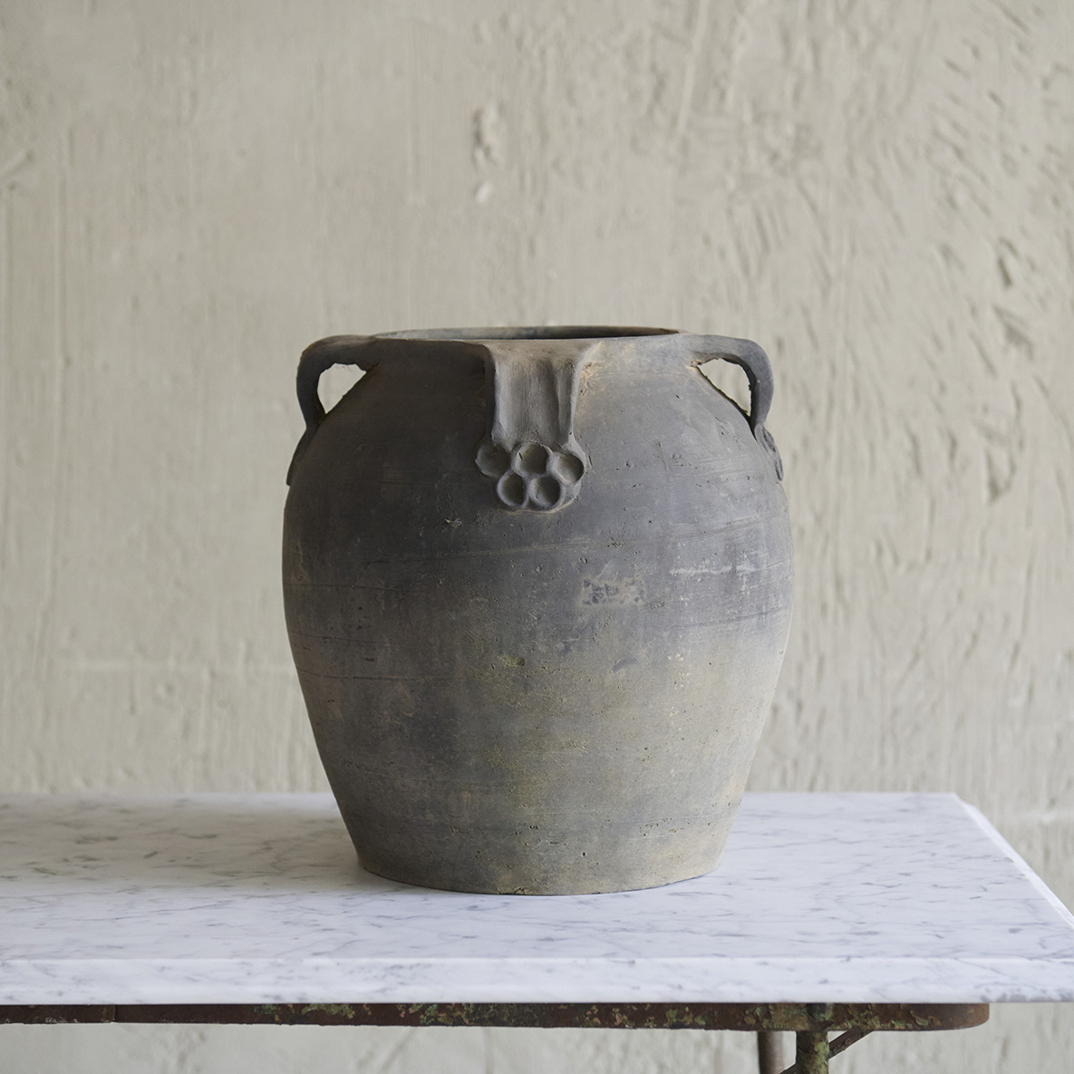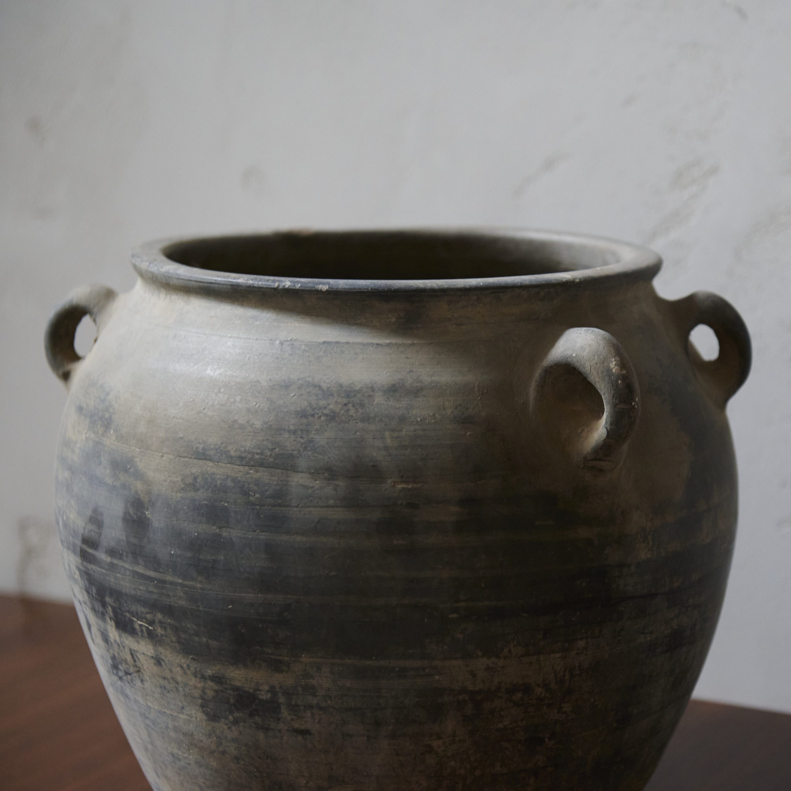 Jarrón de terracota antigua origen Shaanxi. Moldeado en torno al año 1900 presenta proporciones equilibradas y una superficie marcada por las irregularidades de la cocción de la pieza. De color gris ahumado, casi negro, es una imponente pieza que, al ser artesanal, presenta diferentes acabados.