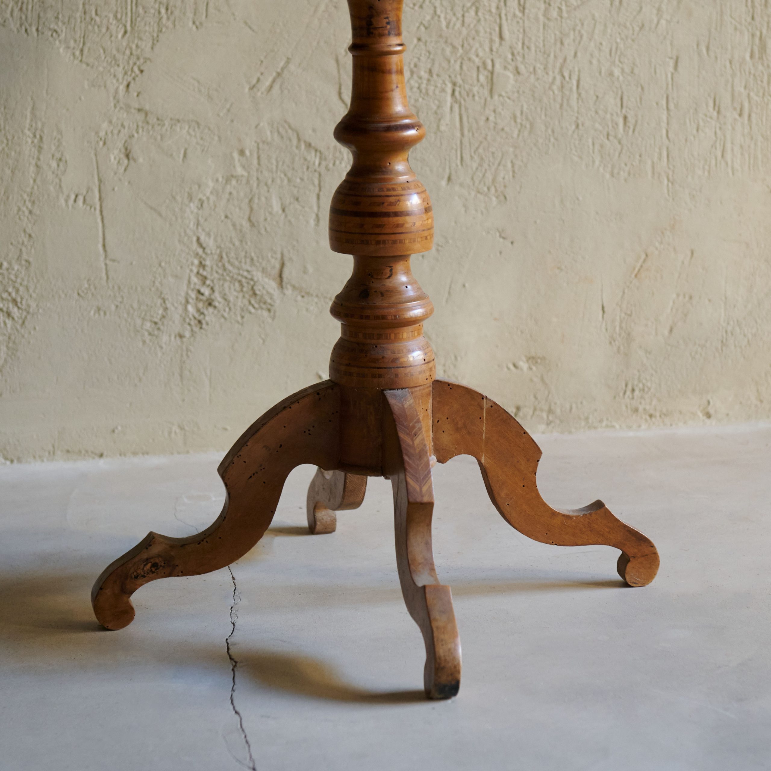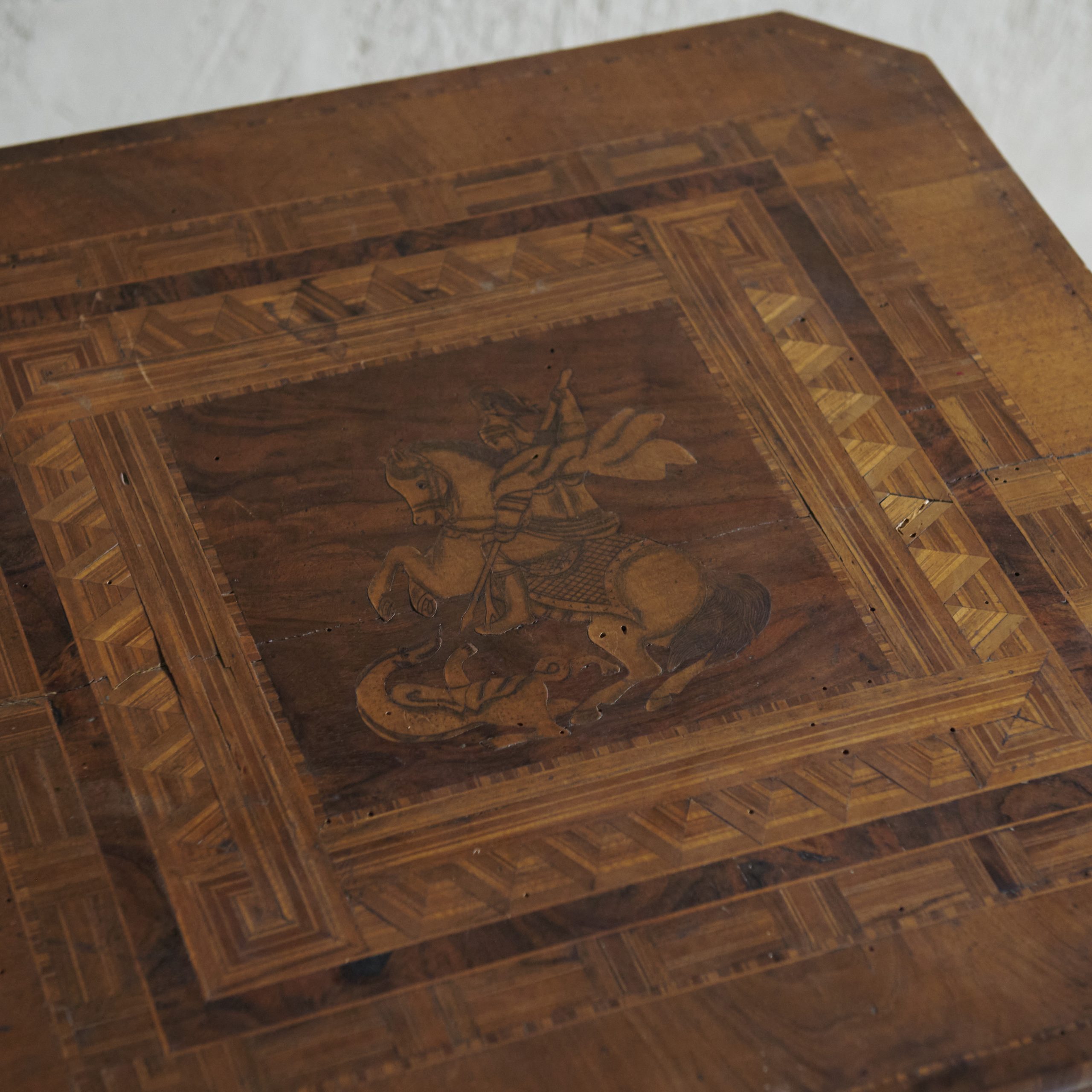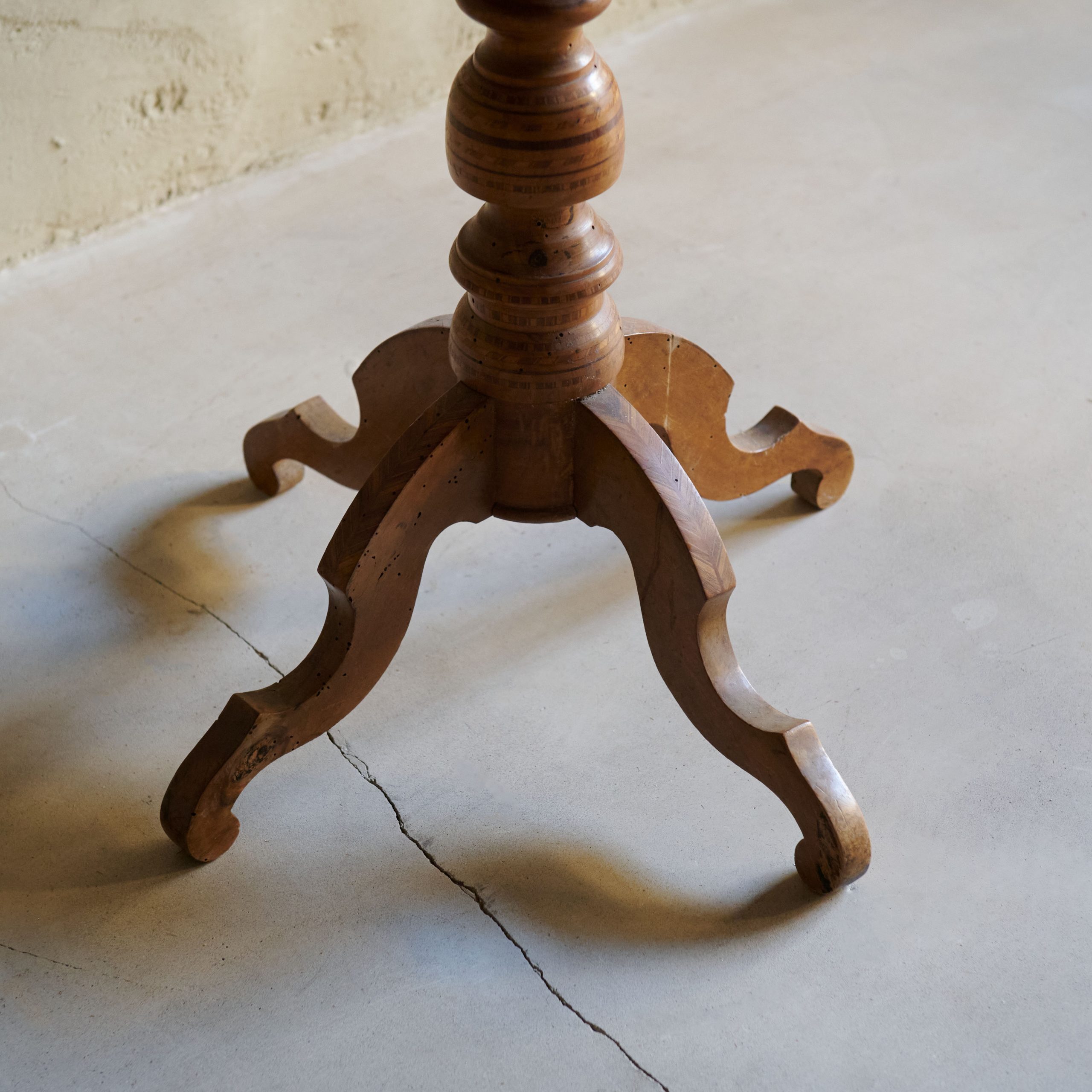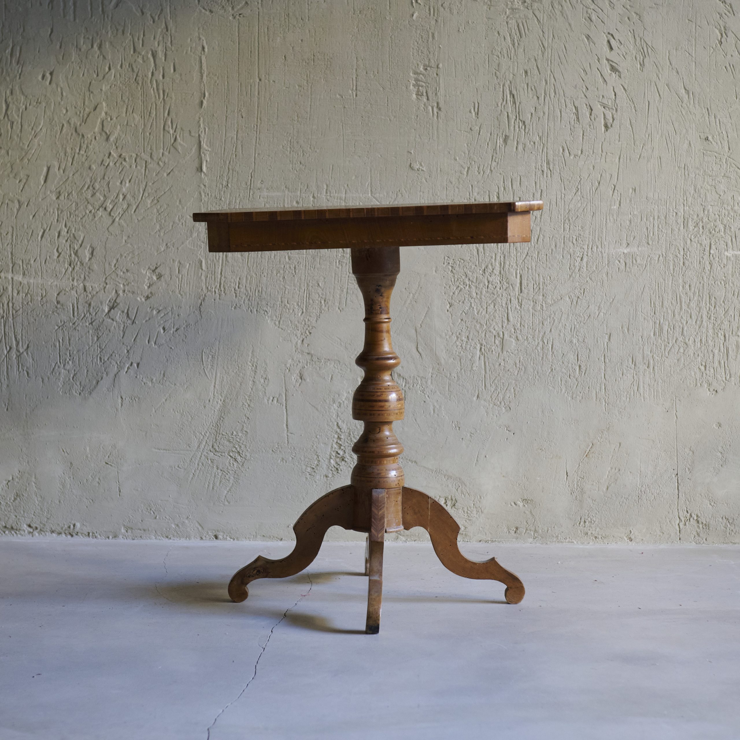 Mesa auxiliar de marquetería. Preciosa mesa auxiliar italiana de origen italiano, una pieza que combina el lujo, la artesanía y la elegancia propia del estilo italiano clásico del siglo XIX. La mesa es de madera de nogal, muy apreciada por su durabilidad, color oscuro y veta distintiva, ideal para realzar la sofisticación de los detalles en marquetería.