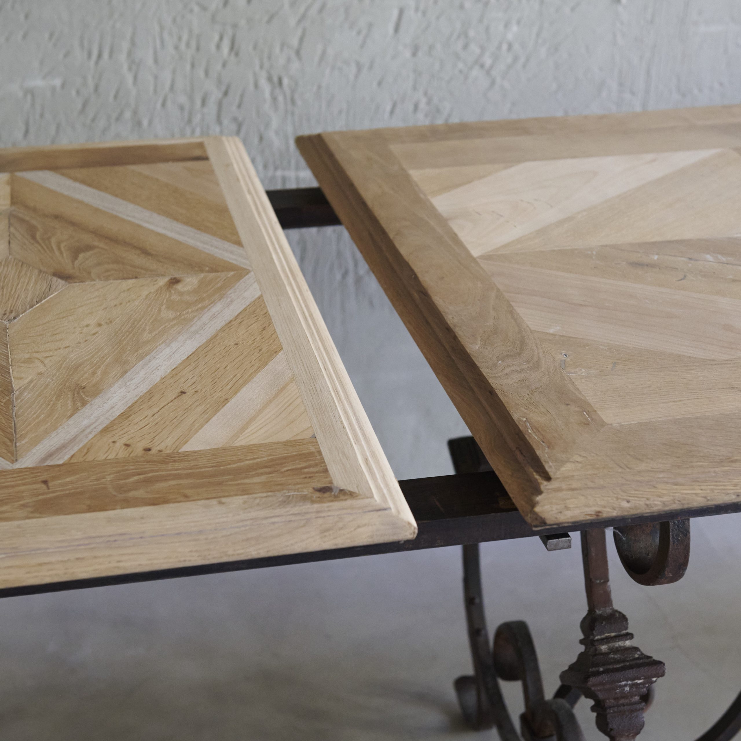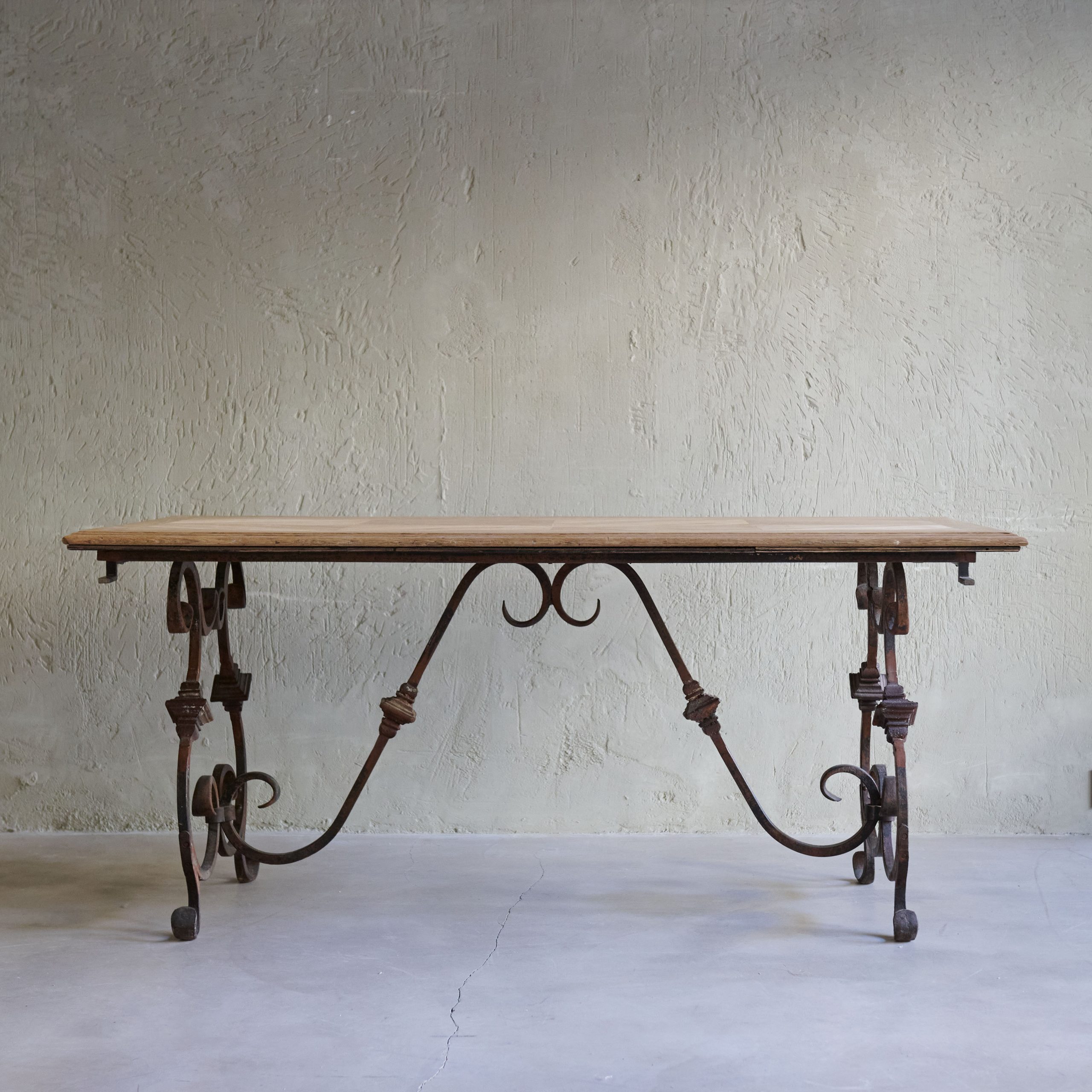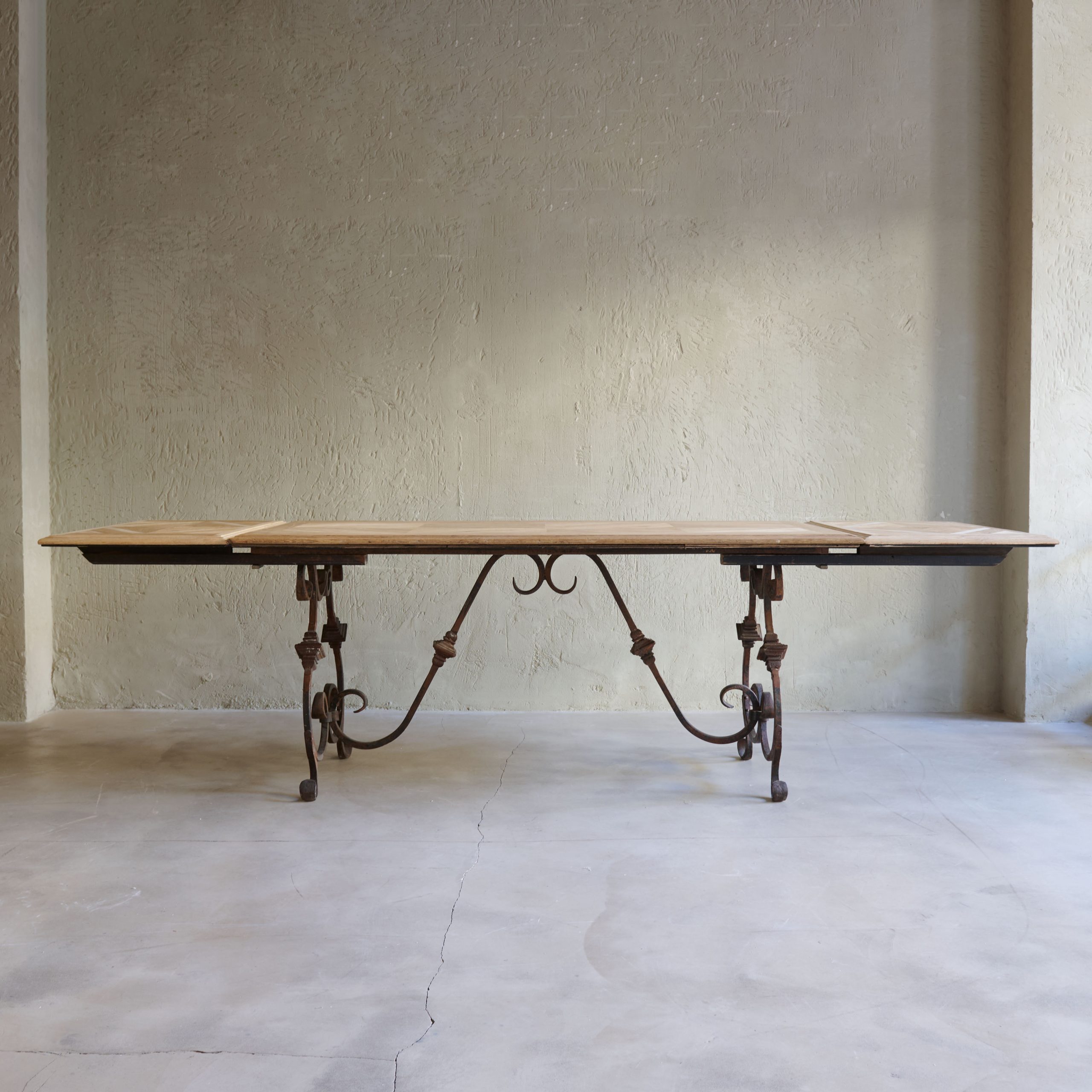 Mesa de comedor de madera con pata de forja. Se trata de una mesa de comedor antigua de madera con patas de forja que evoca un aire de elegancia rústica y atemporal. El sobre de la misma está elaborado artesanalmente en madera maciza de tonalidades cálidas que muestran la belleza natural de las vetas y la pátina envejecida que acentúa su carácter vintage y auténtico. Las patas, forjadas a mano, son el elemento distintivo de esta mesa. Con un diseño intrincado y detallado con formas curvas y geométricas, ofrecen un contraste encantador con la robustez de la madera. Una pieza única y muy especial que además cuenta con extensiones adicionales en madera y forma.