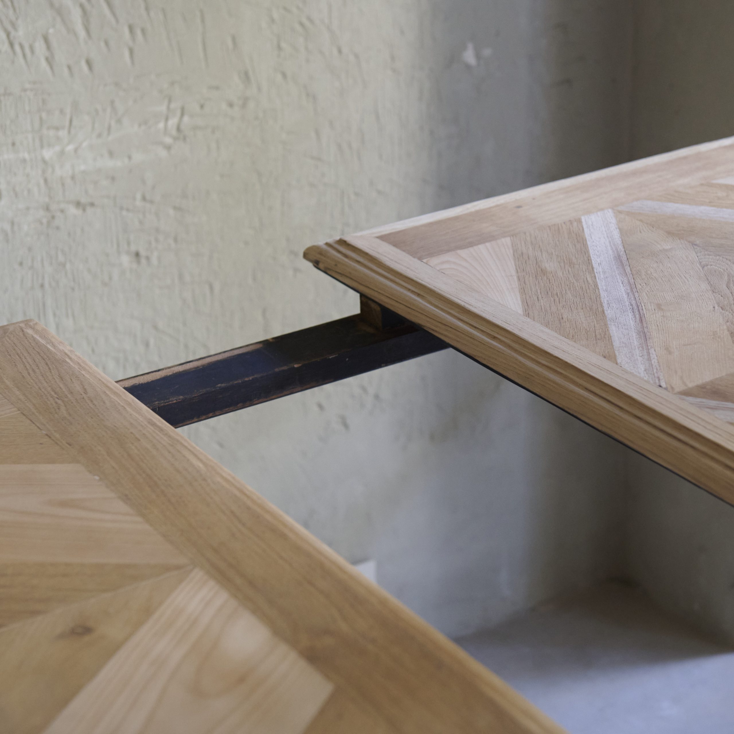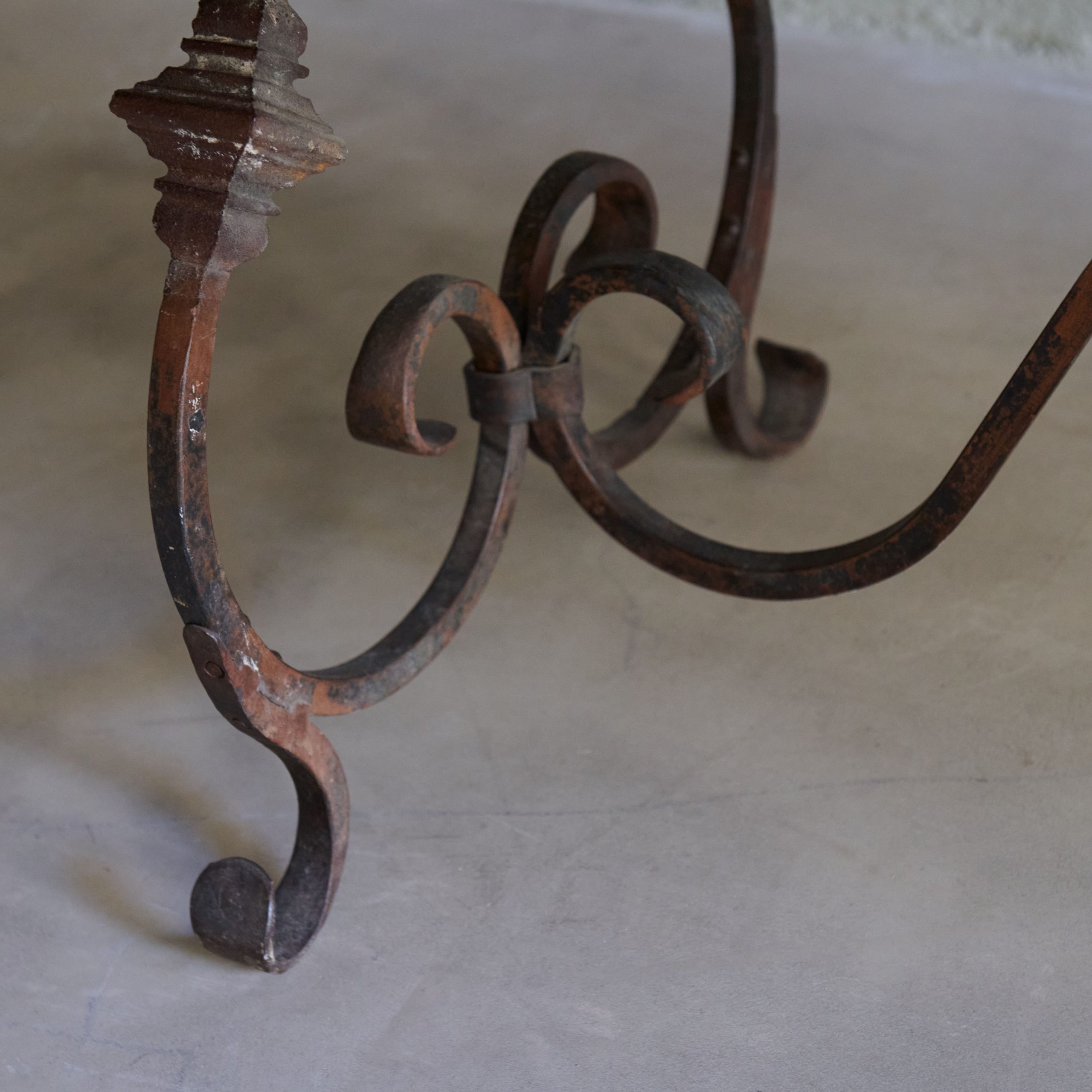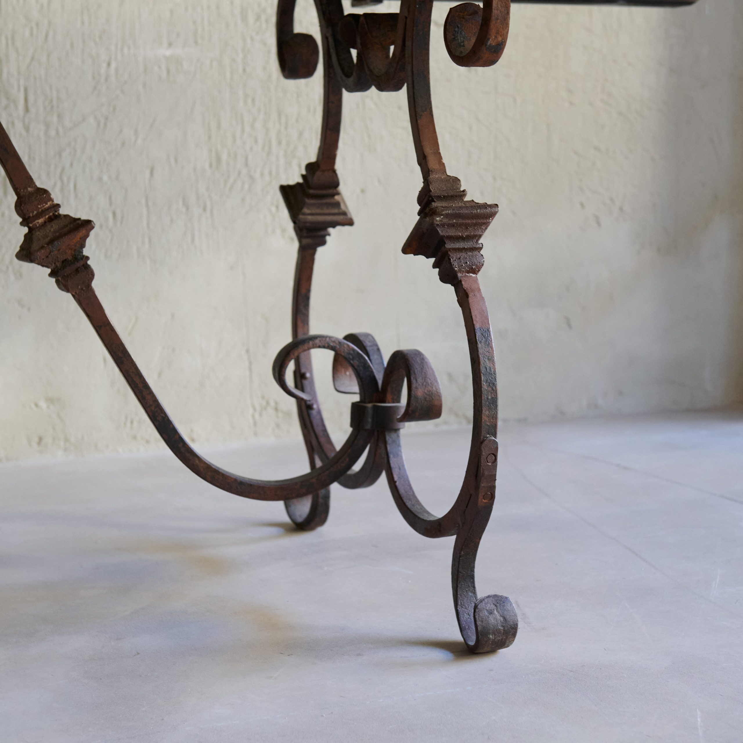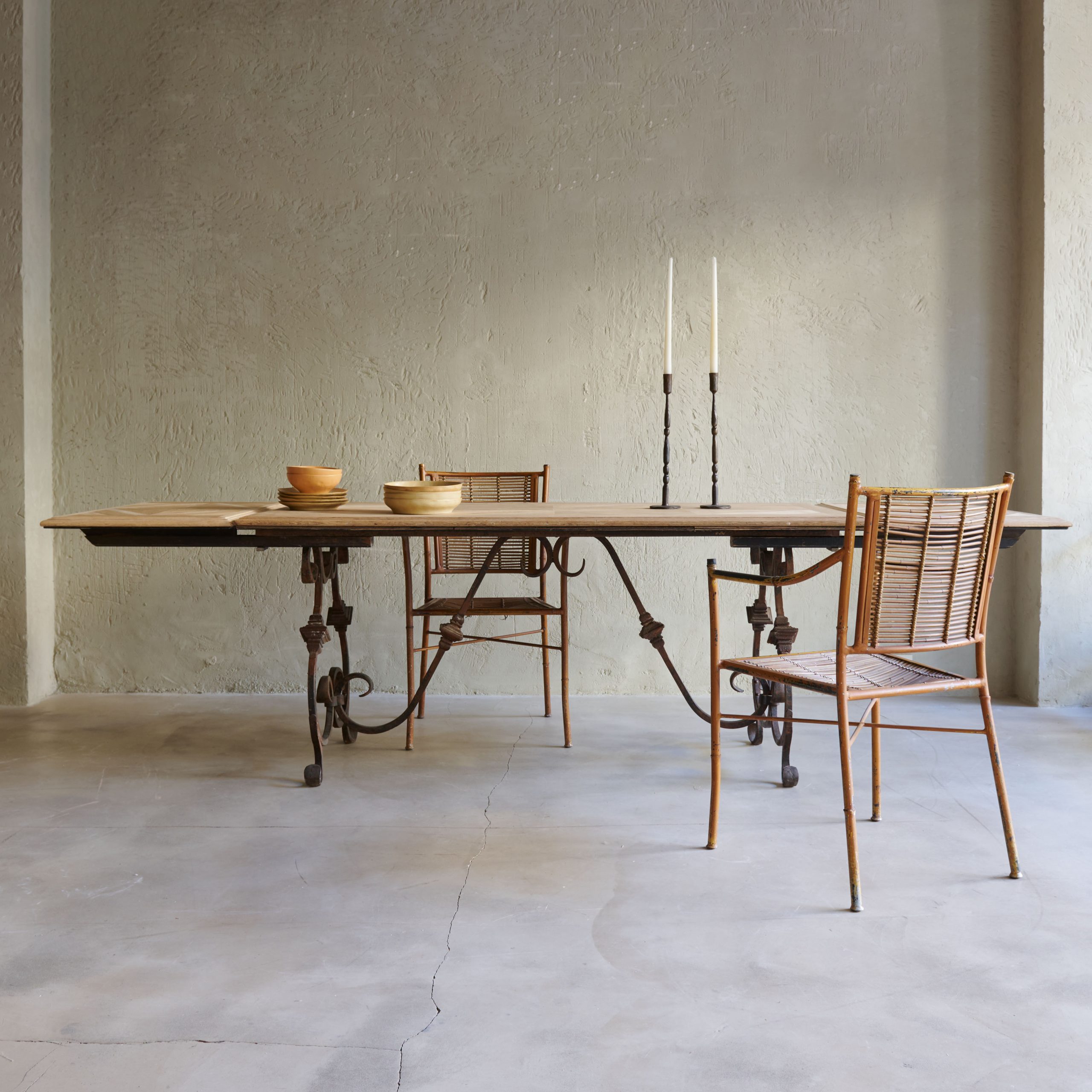 Mesa de comedor de madera con pata de forja. Se trata de una mesa de comedor antigua de madera con patas de forja que evoca un aire de elegancia rústica y atemporal. El sobre de la misma está elaborado artesanalmente en madera maciza de tonalidades cálidas que muestran la belleza natural de las vetas y la pátina envejecida que acentúa su carácter vintage y auténtico. Las patas, forjadas a mano, son el elemento distintivo de esta mesa. Con un diseño intrincado y detallado con formas curvas y geométricas, ofrecen un contraste encantador con la robustez de la madera. Una pieza única y muy especial que además cuenta con extensiones adicionales en madera y forma.
