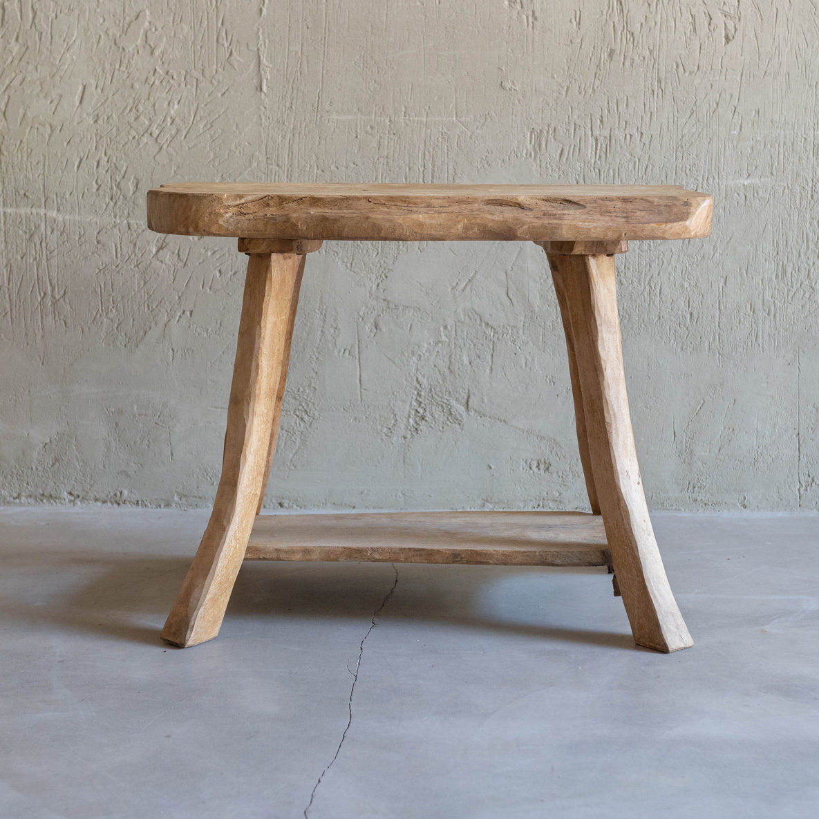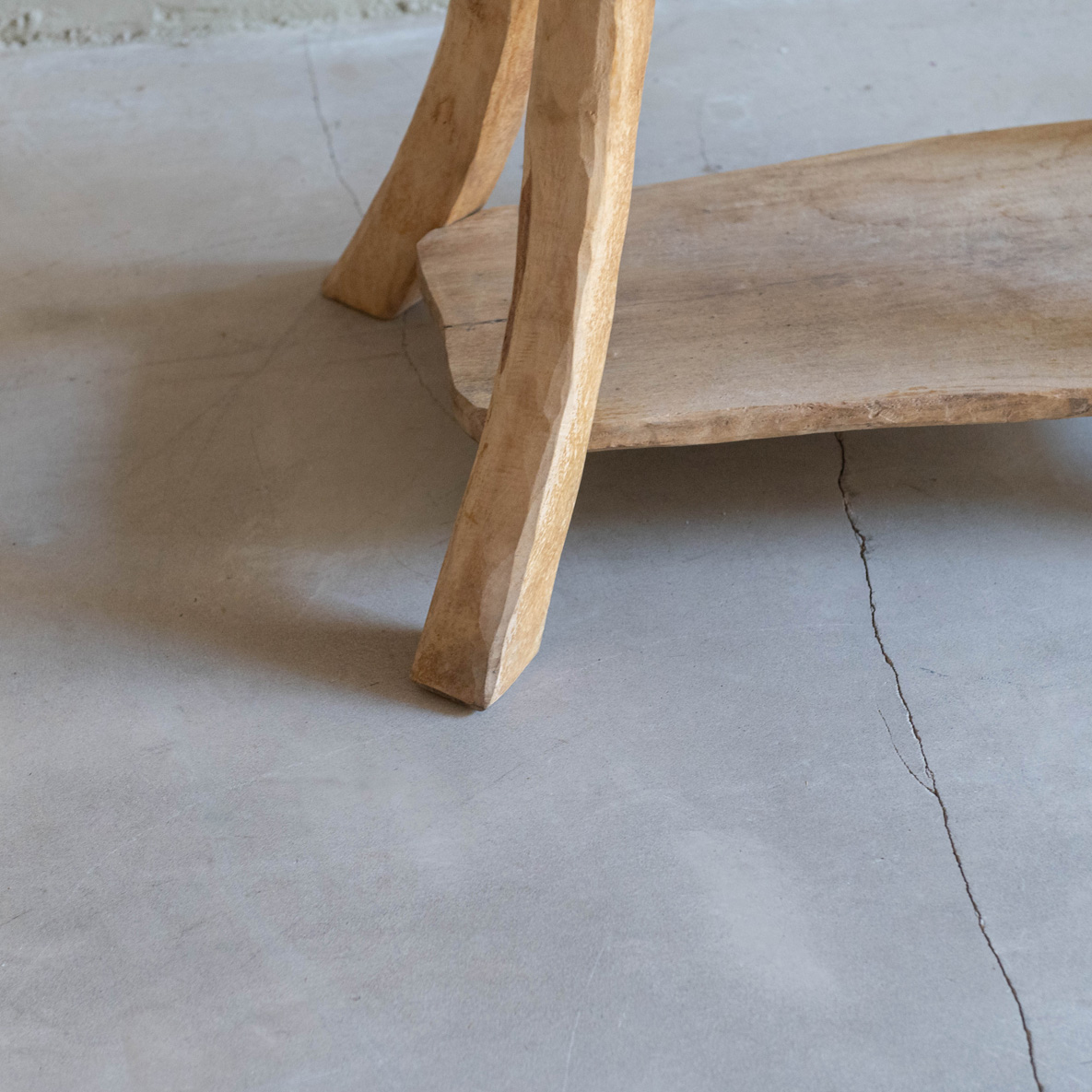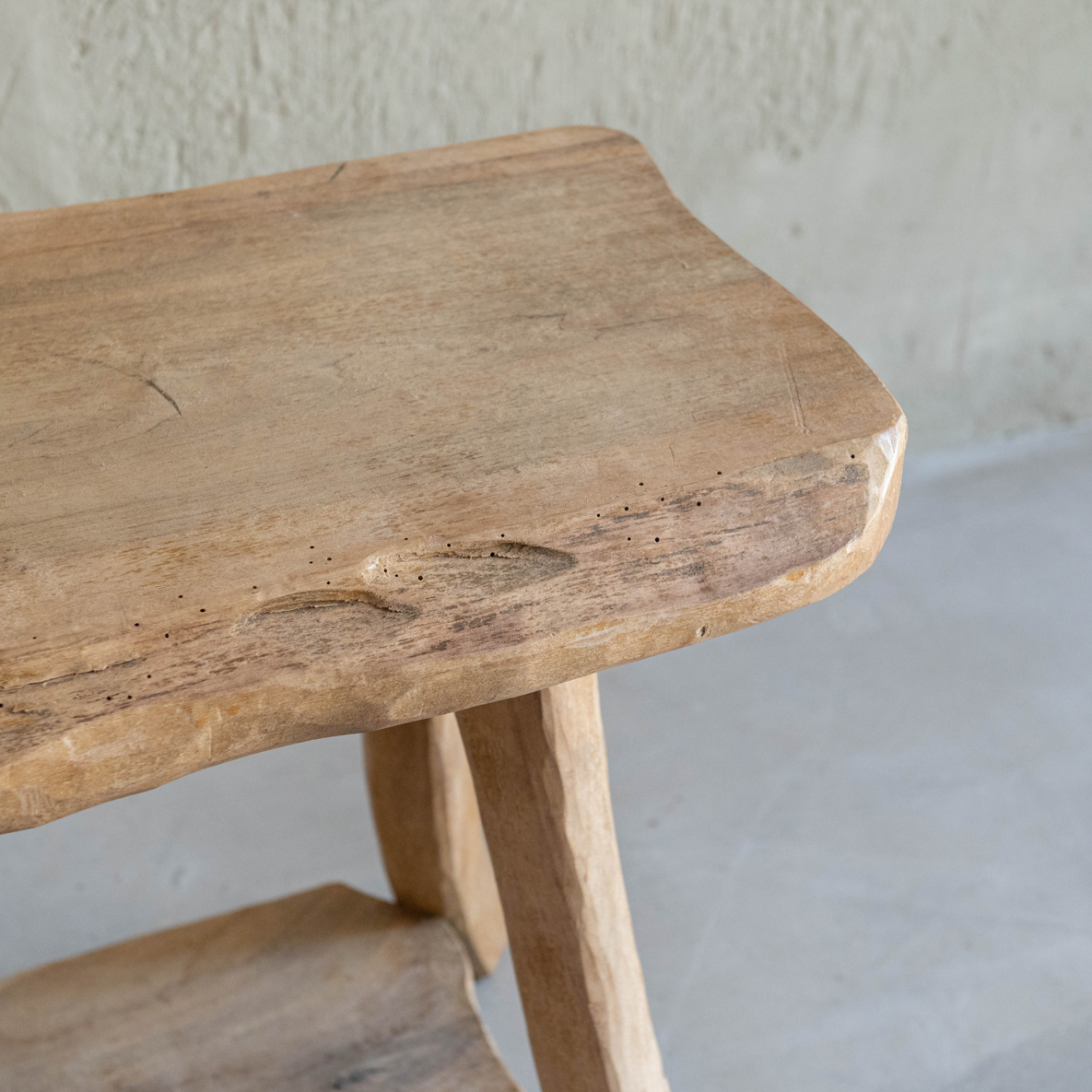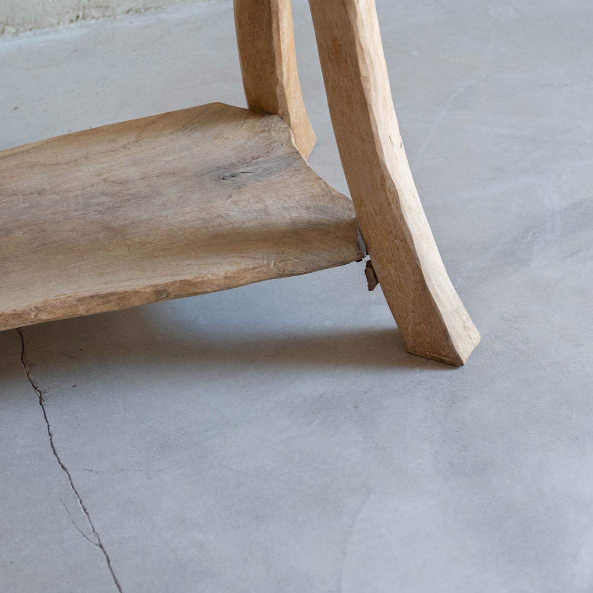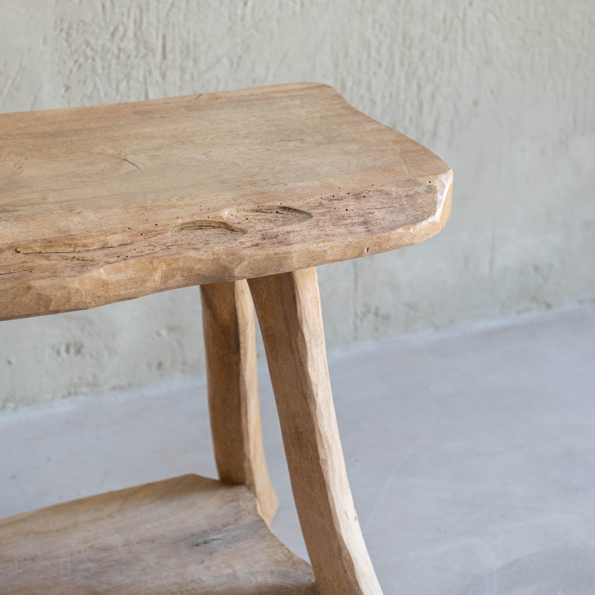 Mesita auxiliar de madera de jardín. Una pieza sencilla de carácter y manufactura totalmente artesanal. La madera natural sin tratar revela las vetas, imperfecciones y texturas propias del material, celebrando su origen orgánico.
