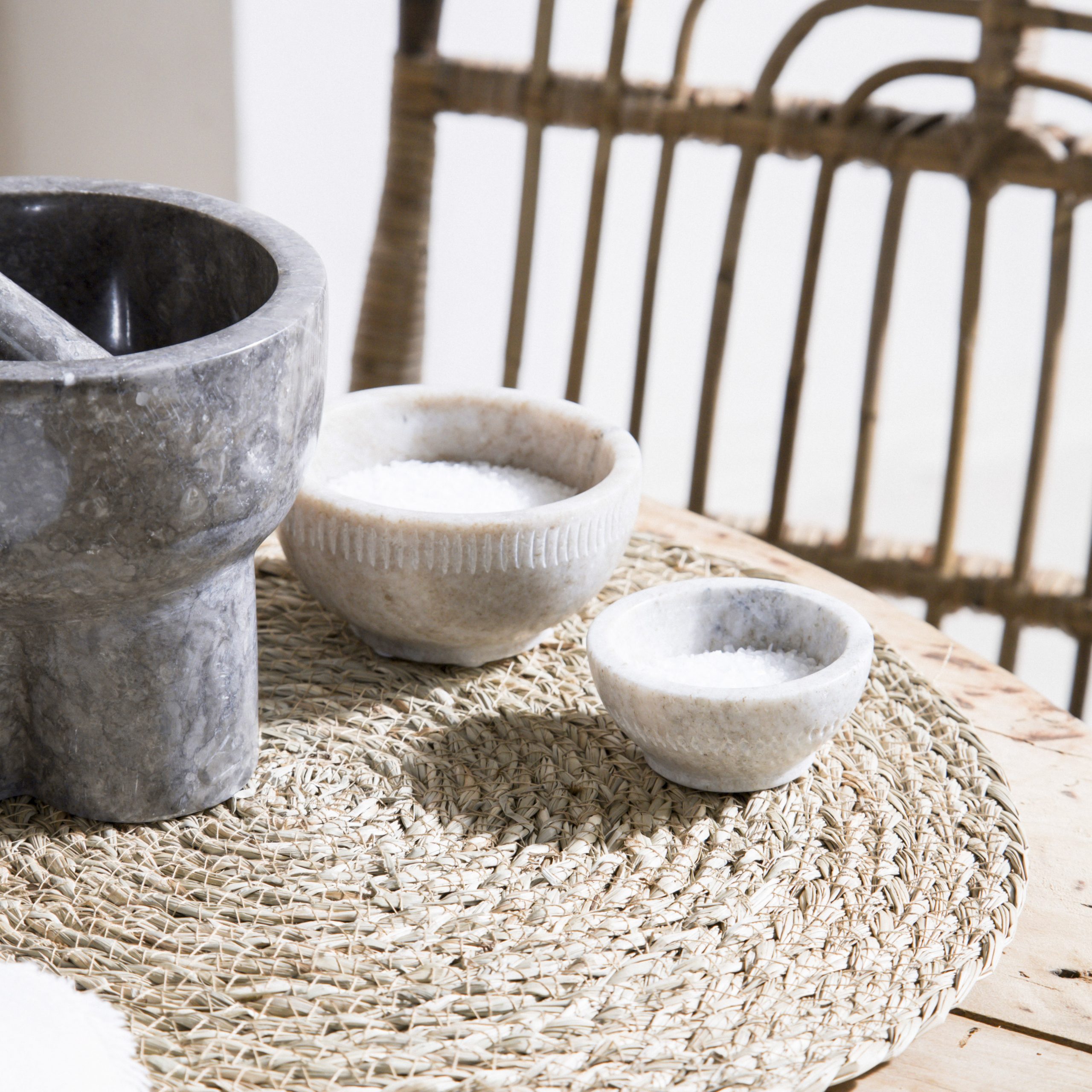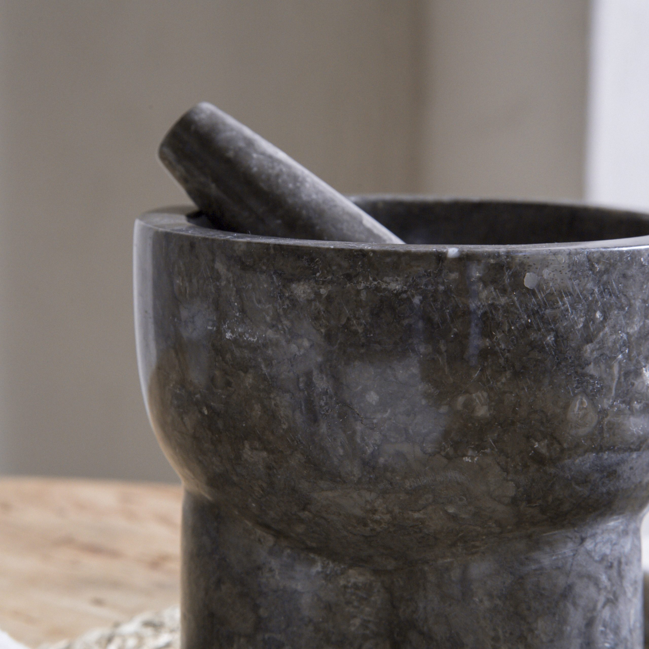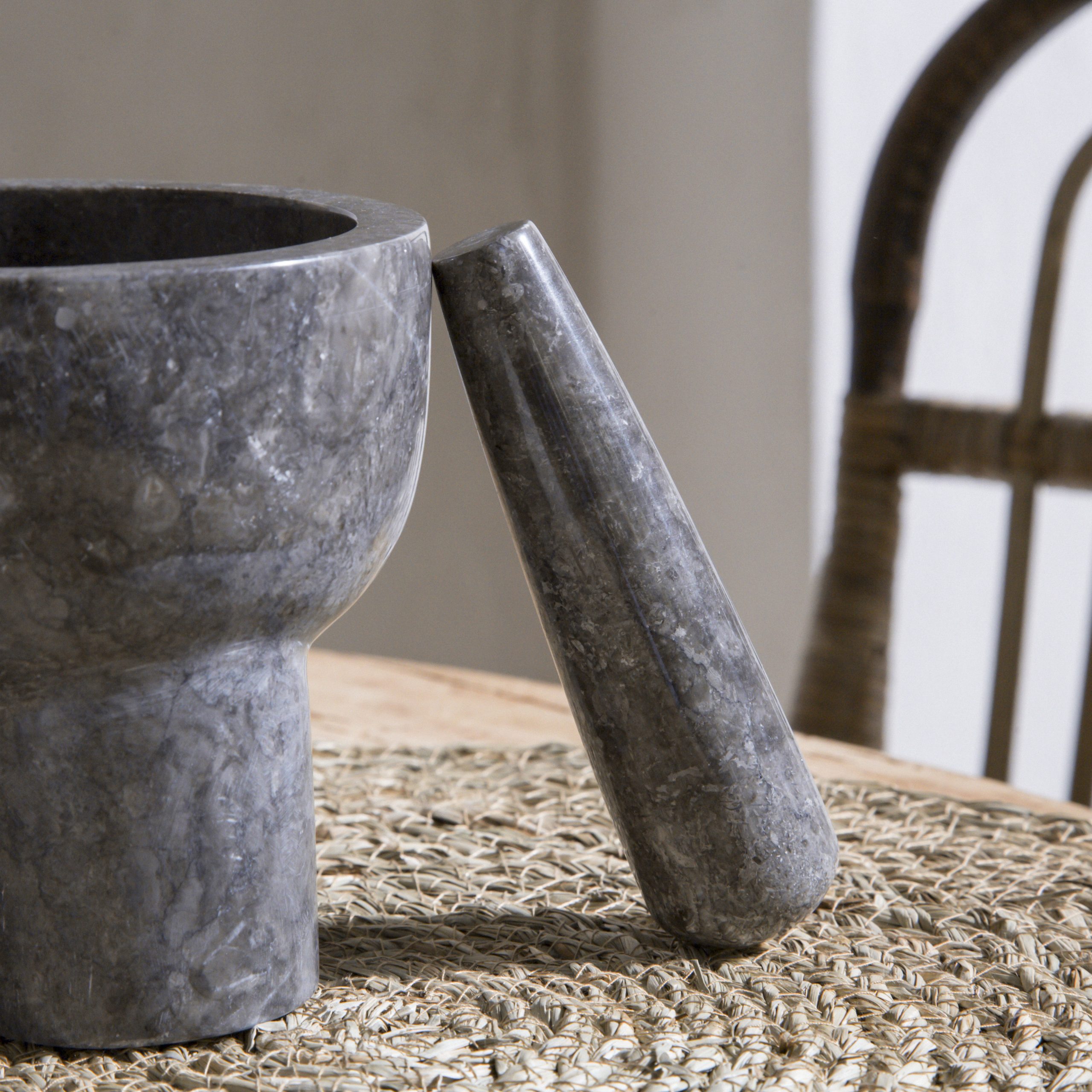 Mortero de mármol tonos grises y marrones. Elegante mortero de mármol natural que combina funcionalidad con un diseño artístico de líneas suaves y base de tres patas robustas, que evocan una estética escultórica. Su tono gris-marrón veteado y textura pulida lo convierten en una pieza llamativa tanto en la cocina como en cualquier rincón del hogar. Perfecto para aquellos que buscan piezas utilitarias con carácter artesanal y diseño moderno.